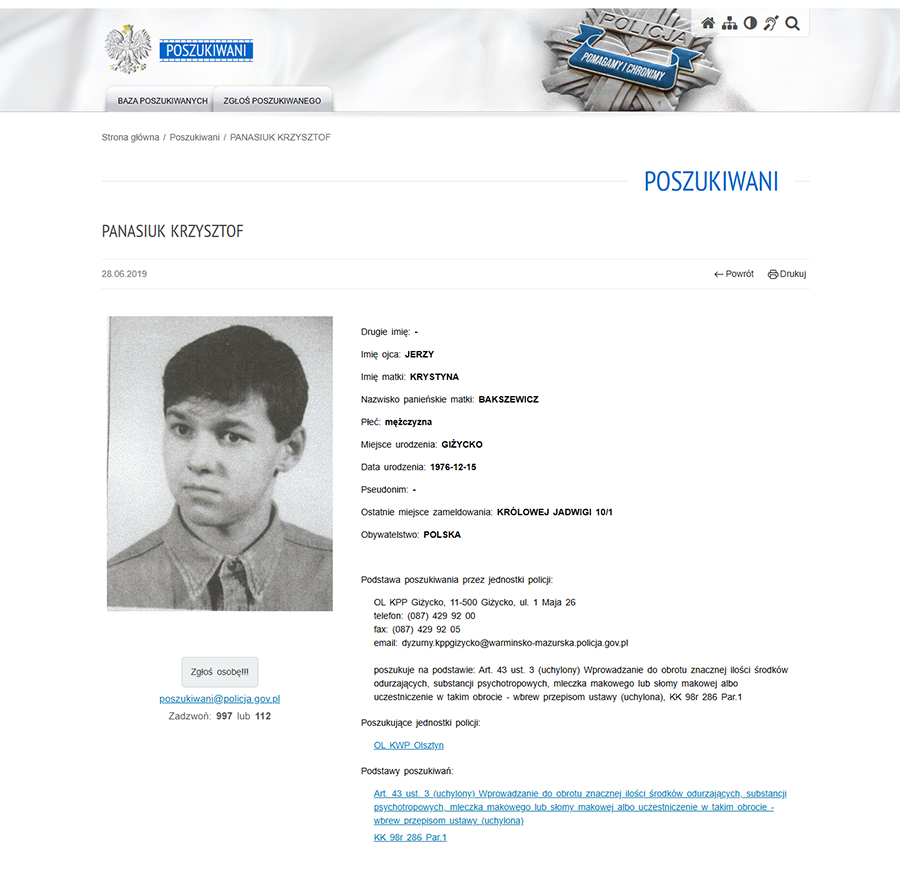 Według bazy osób ściganych na rządowej stronie polskiej policji, urodzony w Giżycku 48-letni Panasiuk jest poszukiwany za „wprowadzanie do obrotu znacznej ilości środków odurzających (…) albo uczestniczenie w takim obrocie”. Jednak na stronie Interpolu w rejestrze czerwonych not nie znaleźliśmy nazwiska Panasiuka.