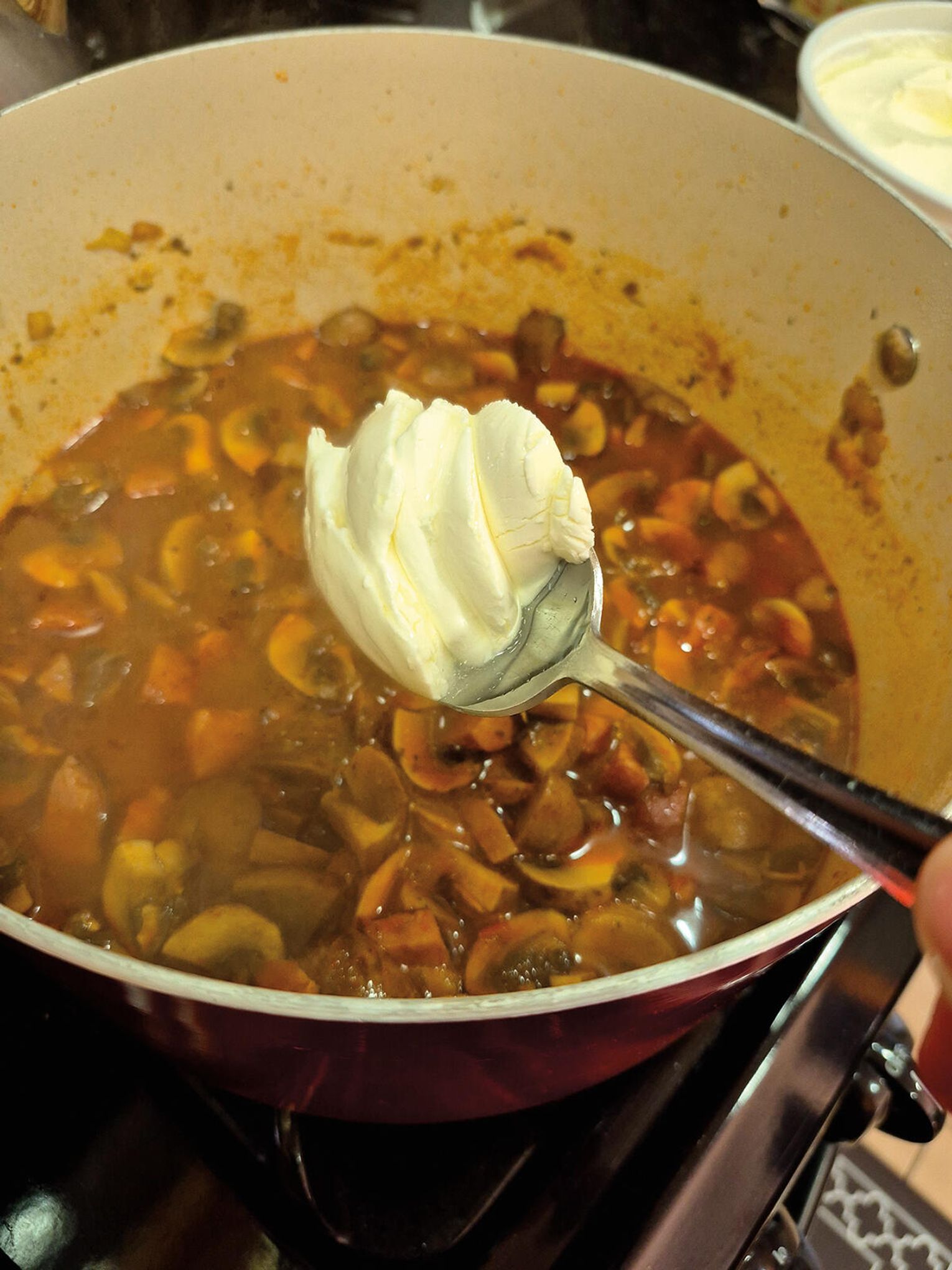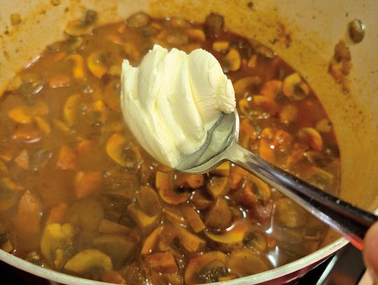 Na tej samej patelni podsmaż cebulę, aż się zeszkli. Dodaj pieczarki i smaż, aż puszczą sok i lekko się przyrumienią. Na koniec dodaj czosnek i smaż jeszcze chwilę, aż zacznie pachnieć.