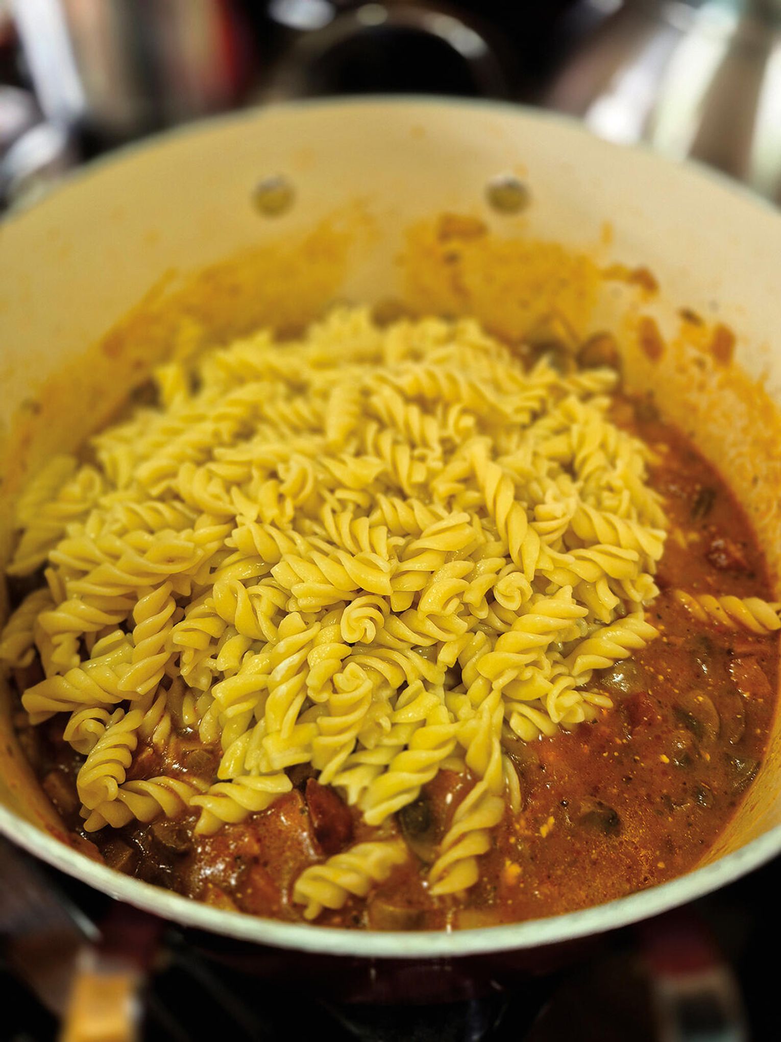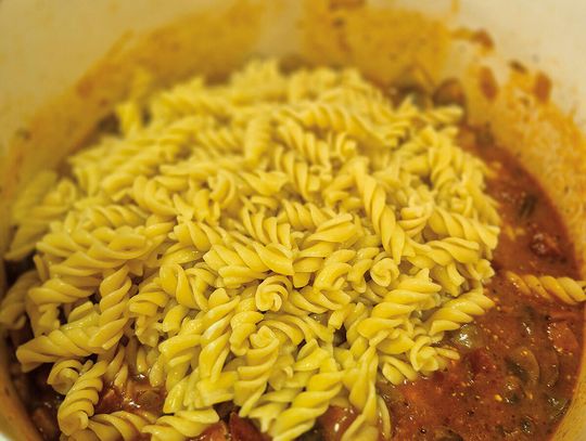 Wymieszaj i gotuj na małym ogniu 10-12 minut, aż sos zgęstnieje. Dodaj do sosu podsmażoną kiełbasę i wymieszaj. Gotuj razem 2-3 minuty, na koniec wymieszaj ser, jeśli używasz. Następnie dodaj makaron i dokładnie wymieszaj – jeśli sos jest zbyt gęsty, dolej trochę wody z makaronu.