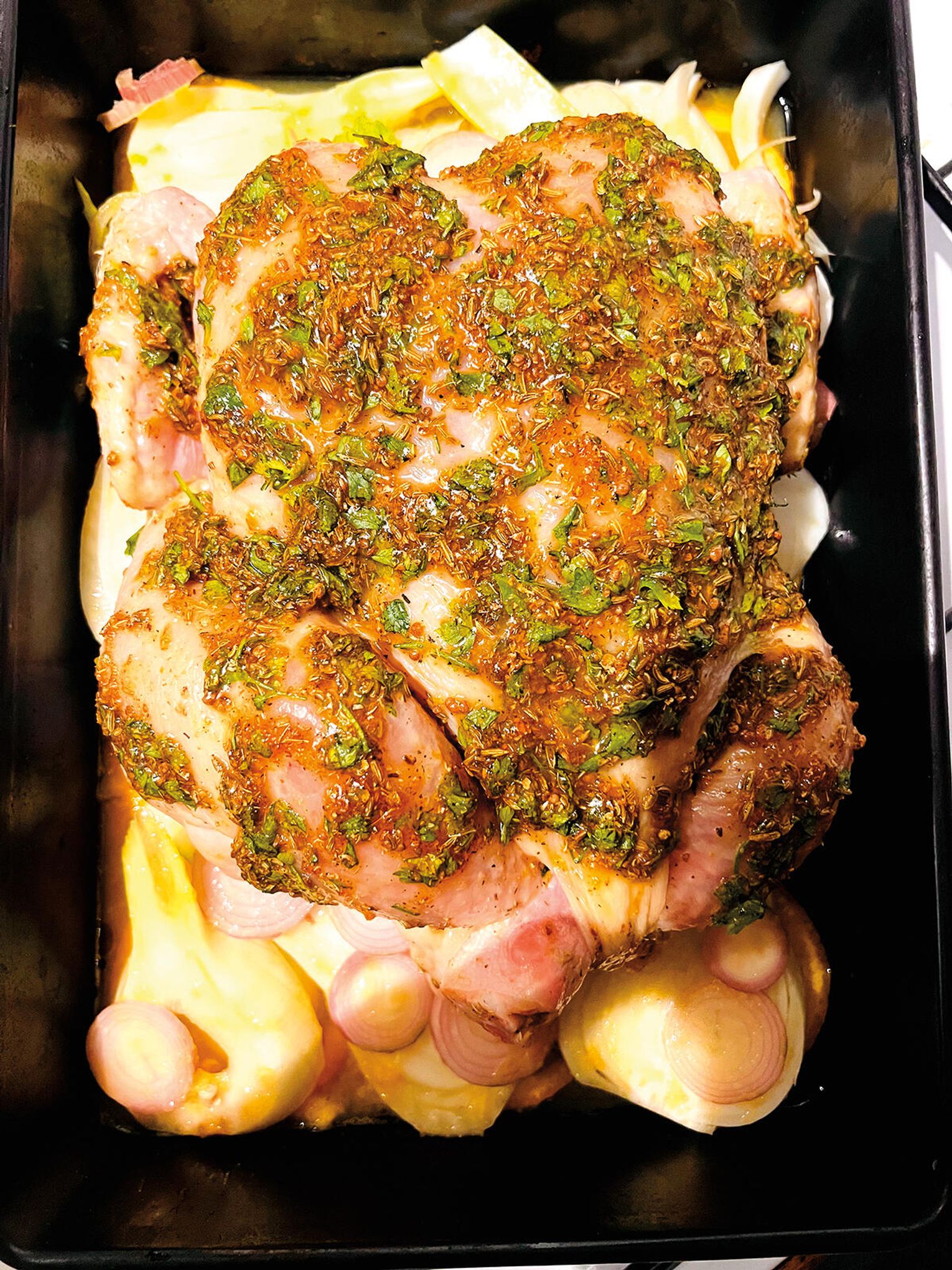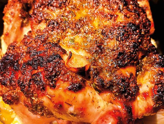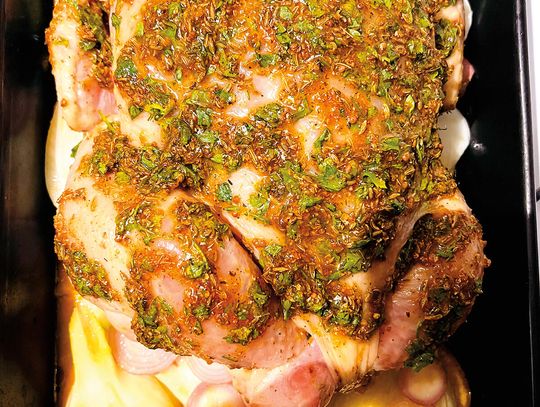 Co ok. 10 minut polewaj mięso sokami z dna formy, żeby skóra była chrupiąca i złota.