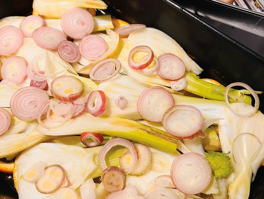 Ułóż wszystko na dużym półmisku razem z upieczonym koprem włoskim, szalotkami i plastrami pomarańczy.
