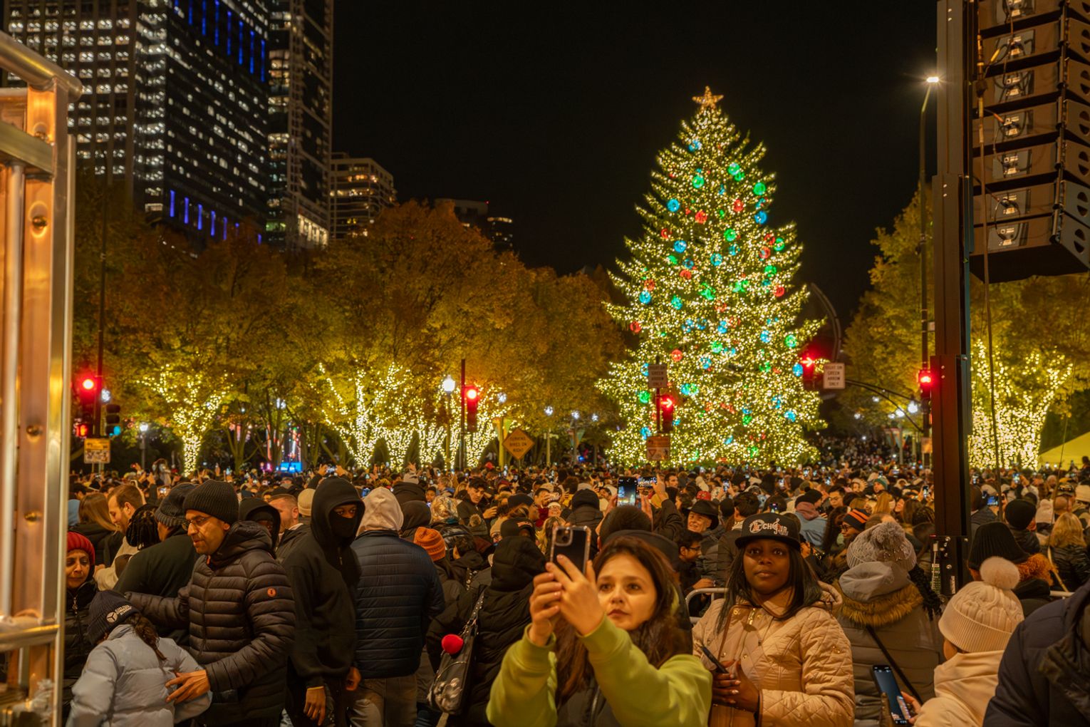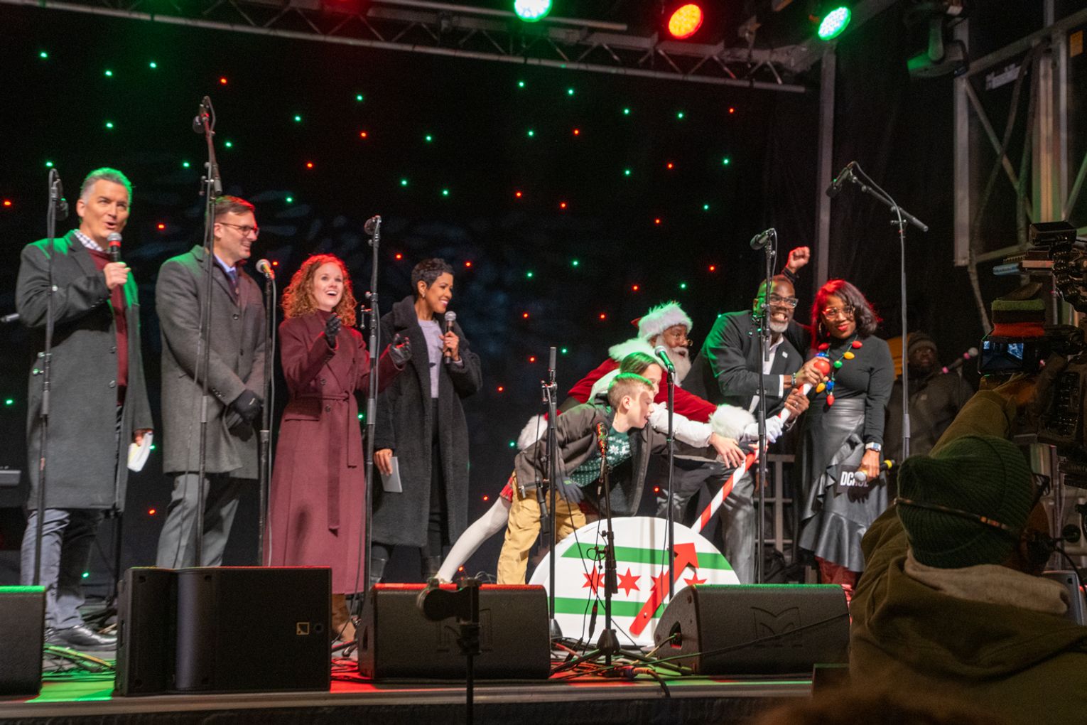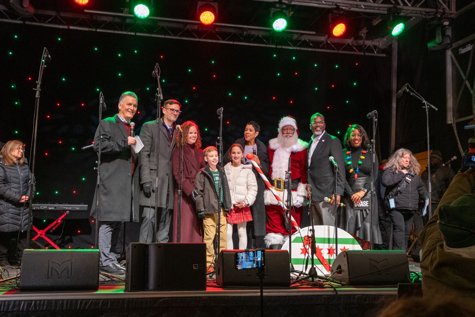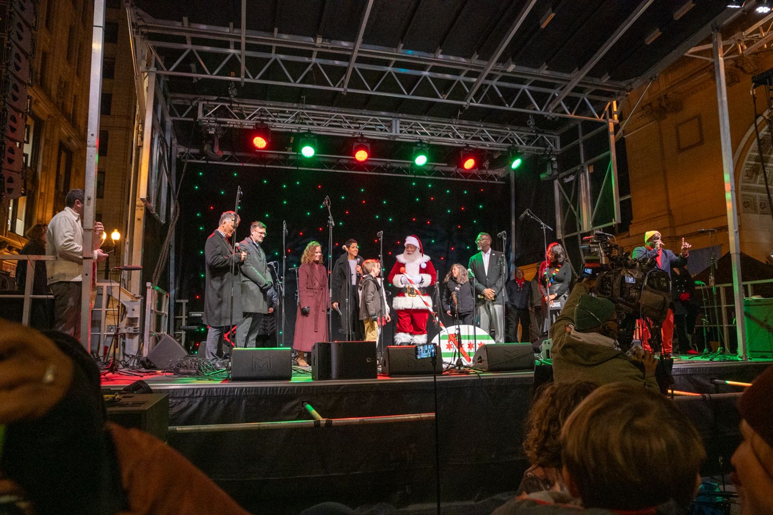 Imprezę prowadzili Irika Sargent i Joe Donlon z CBS 2 Chicago. Po godzinie 6 pm, na scenie zlokalizowanej przed wejściem do Chicago Cultural Center, pojawił się burmistrz Chicago Brandon Johnson i w towarzystwie św. Mikołaja i rodziny Mason zapalił lampki na choince. Towarzyszył temu krótki pokaz sztucznych ognii.