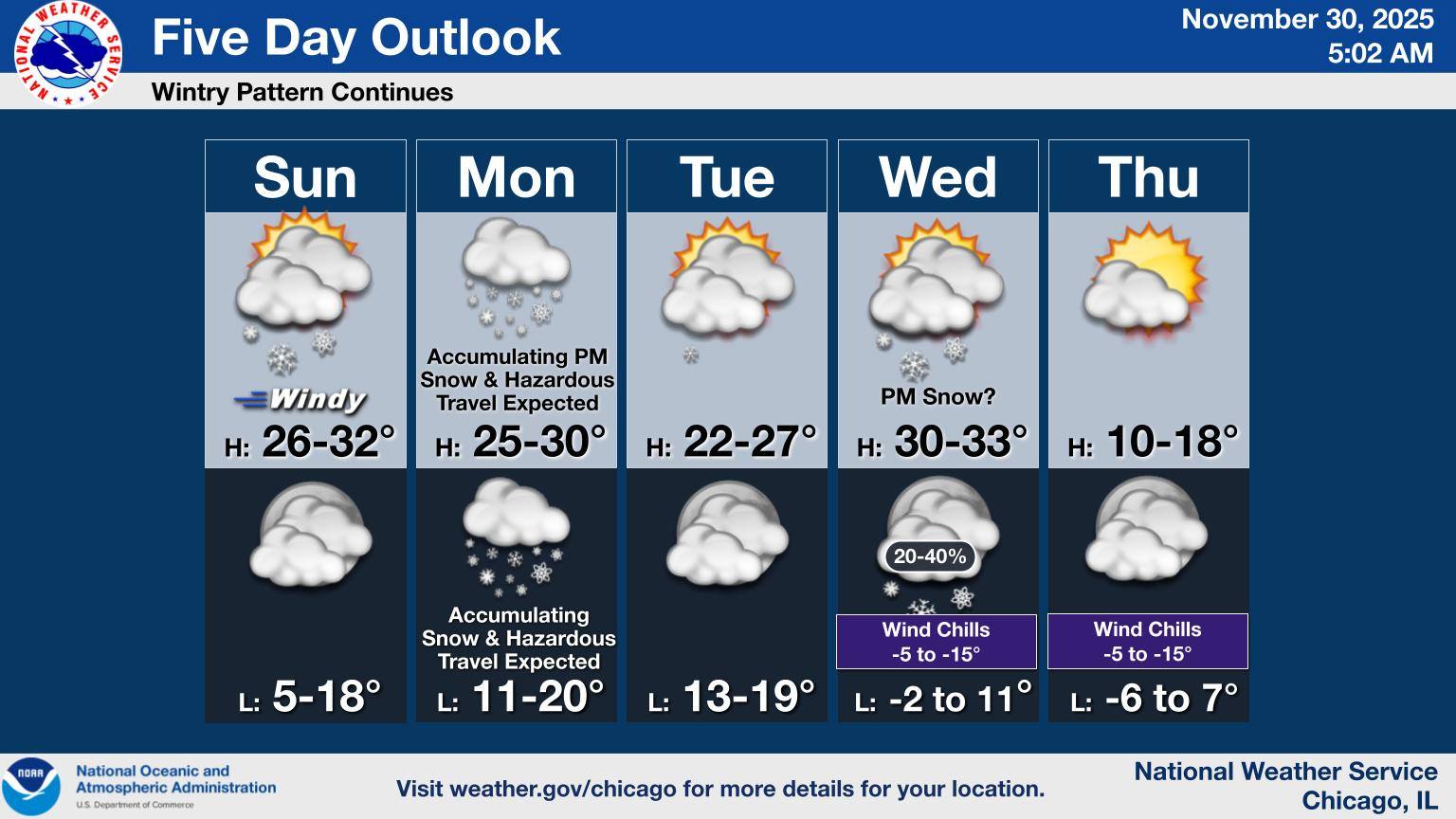 To dopiero początek zimowego sezonu, a Chicago już ma za sobą śnieżycę, która zapisze się w historii miasta. Lekkie opady śniegu wciąż są możliwe w niedzielę, 30 listopada przez całe przedpołudnie, a według Krajowej Służby Meteorologicznej może spać około cala (ok. 2,5 cm). Najwięcej śniegu ma spaść na północnych przedmieściach.