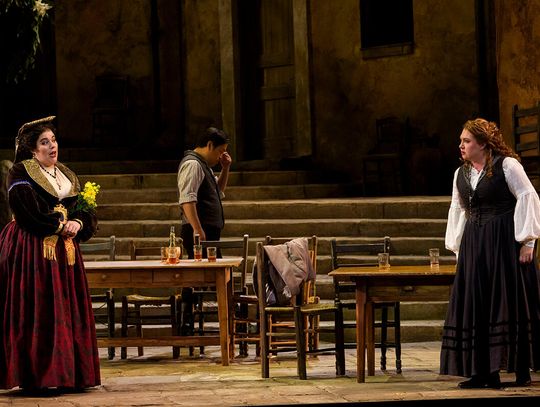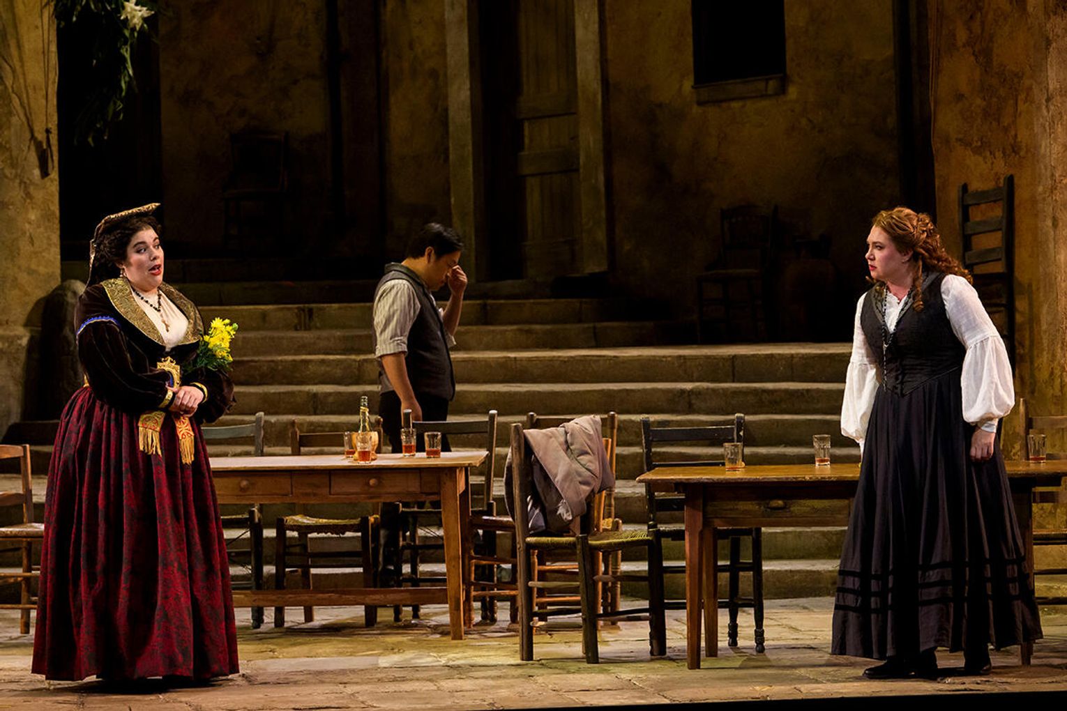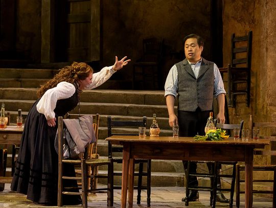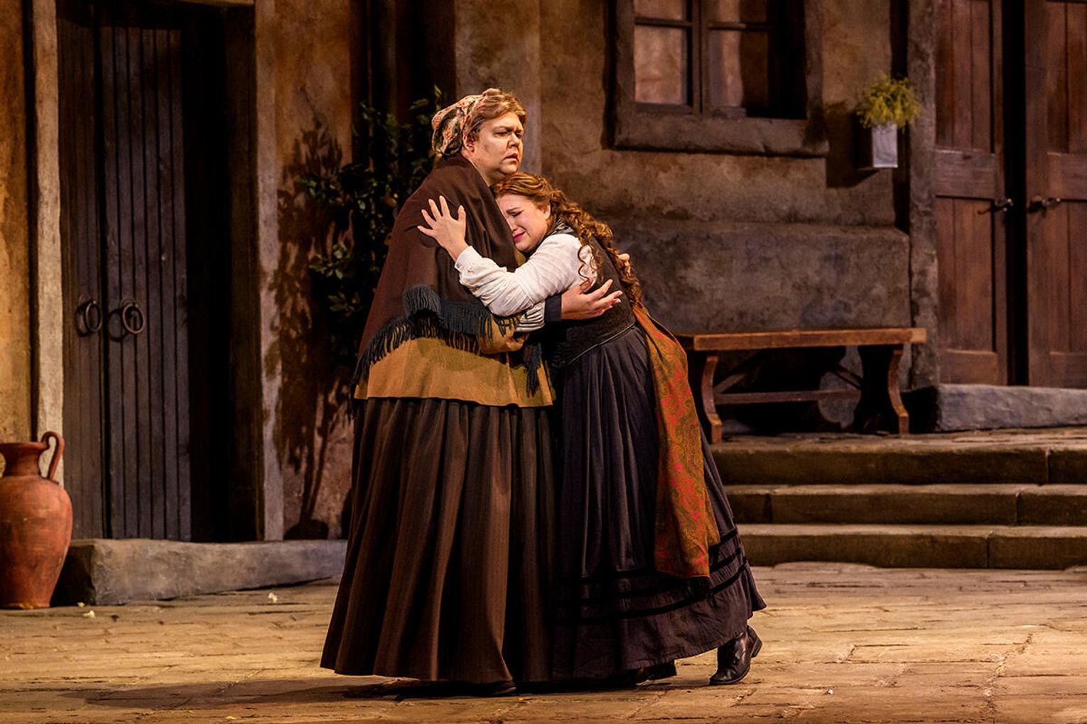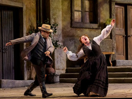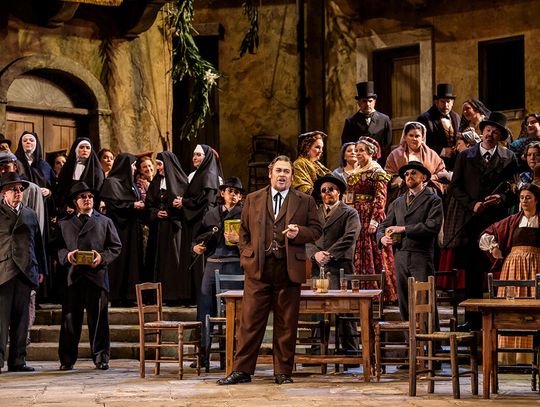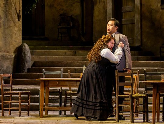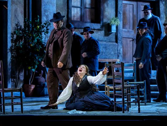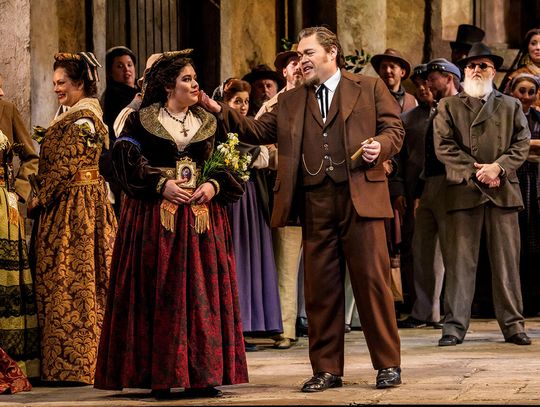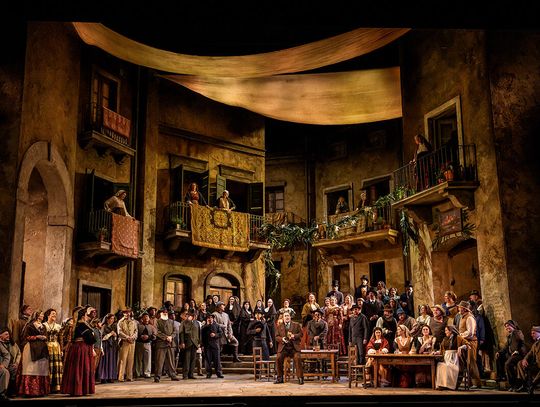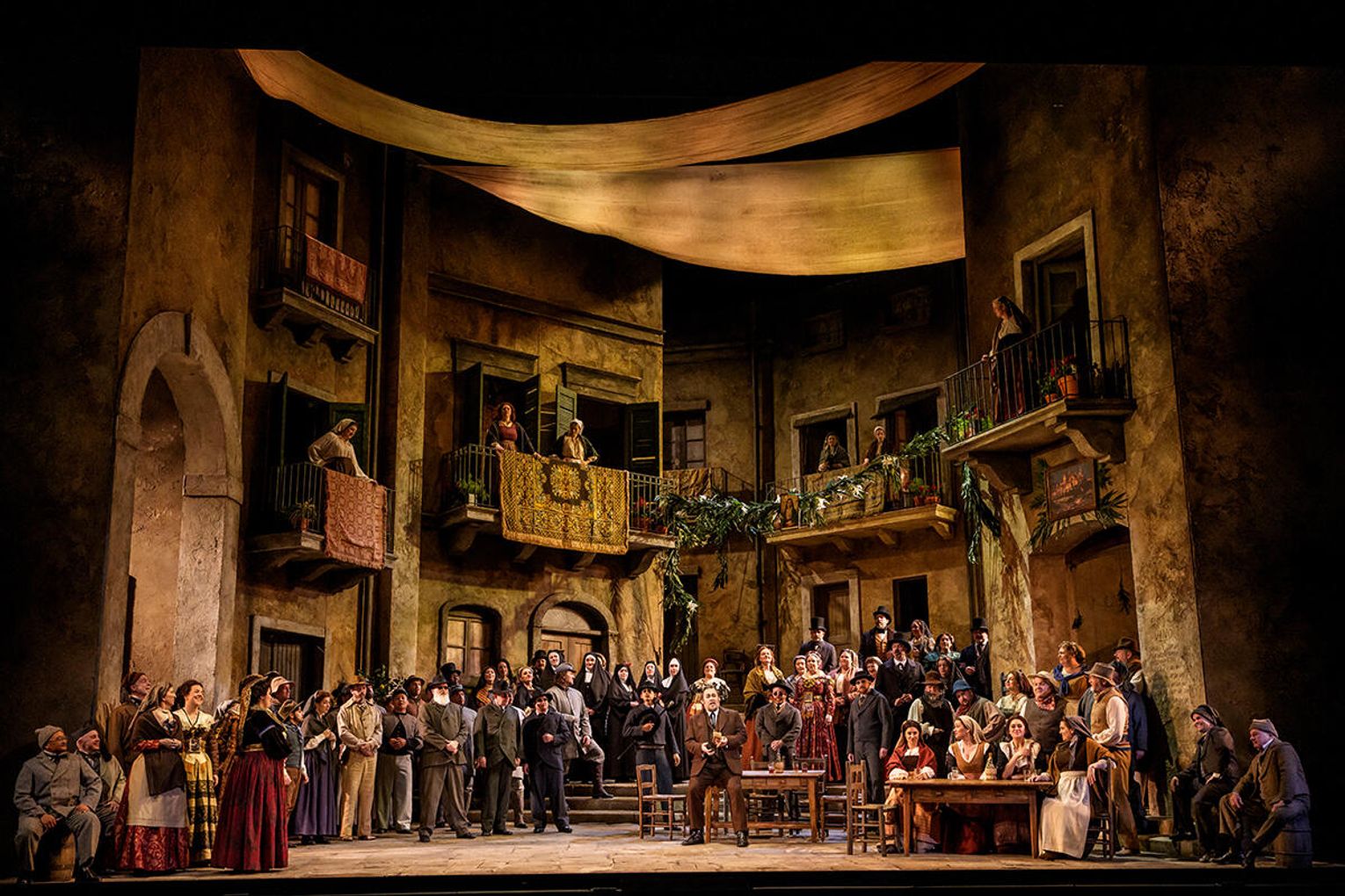 Lyric Opera of Chicago w tym sezonie proponuje wyjątkową interpretację tego klasycznego dyptyku. Przedstawienie jest ucztą wizualną i muzyczną, a jego siła polega na umiejętnym połączeniu tradycji z nowoczesną teatralną wrażliwością. Już pierwsze minuty Cavallerii Rusticany zachwycają widza zjawiskową scenografią, która oddaje klimat sycylijskiej wioski z pietyzmem godnym filmowych rekonstrukcji. To świat pełen światła, cieni, zapachów i kolorów, w którym każdy detal — od brukowanych ulic, po fakturę kamiennych murów — sprawia, że spektakl staje się niemal trójwymiarowy.
