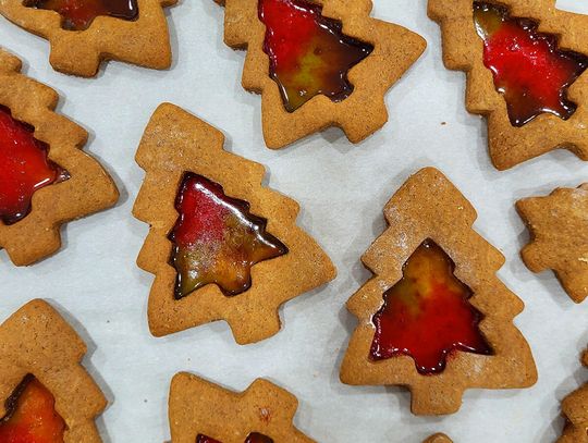 Aby stworzyć witrażyki, wystarczy wyciąć odpowiednie kształty i włożyć do środka pokruszone landrynki.