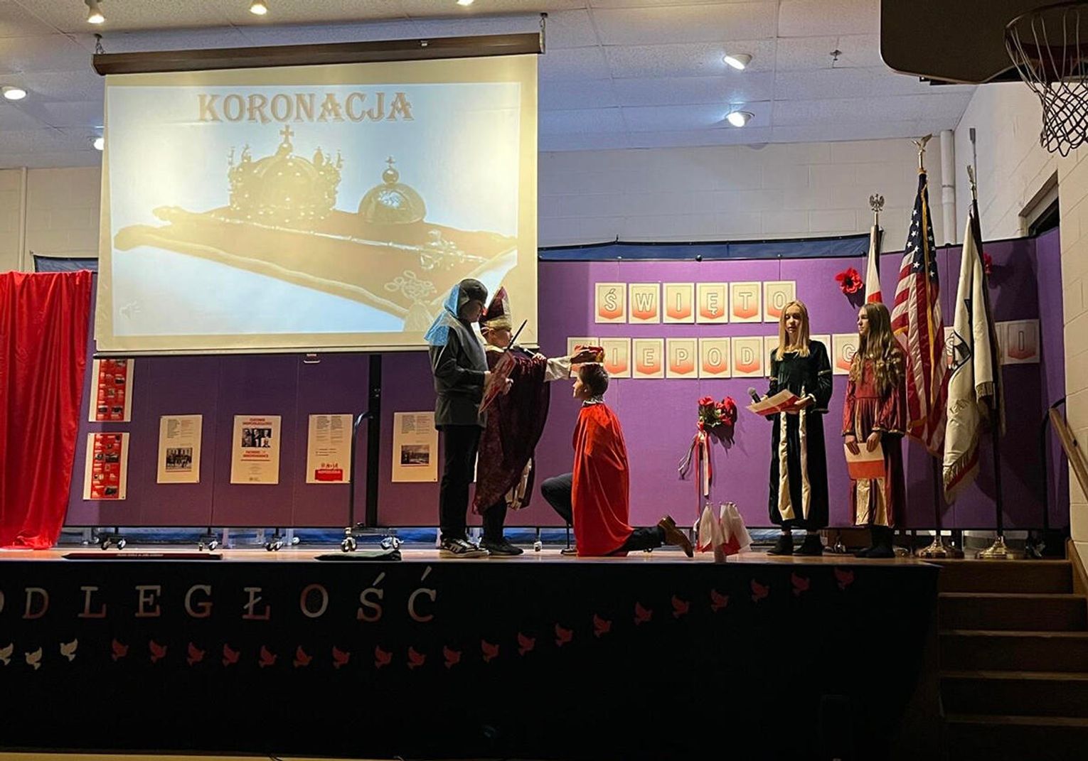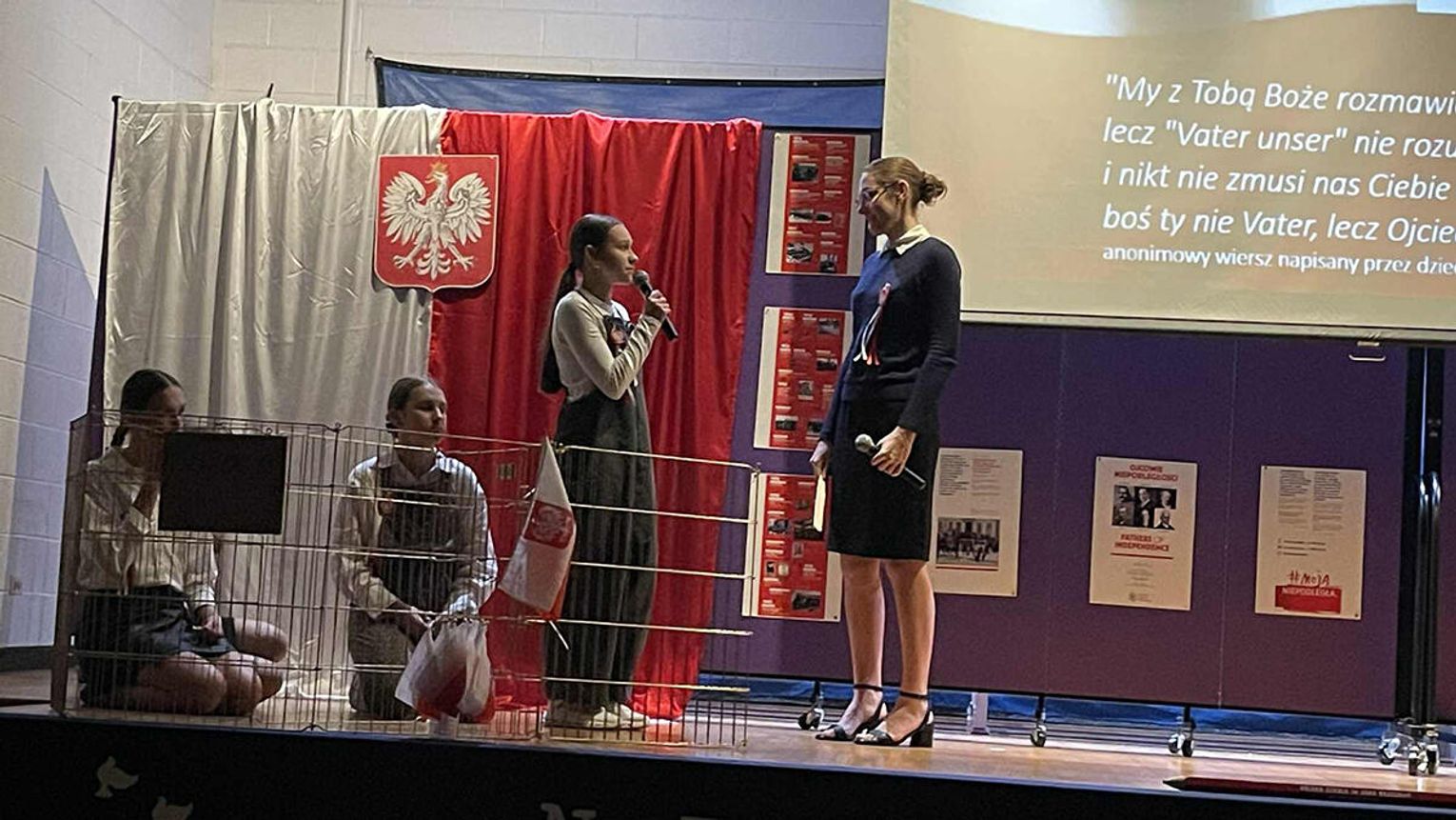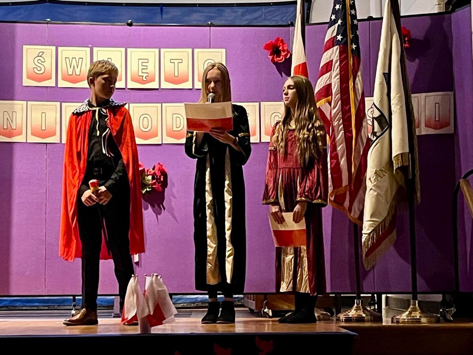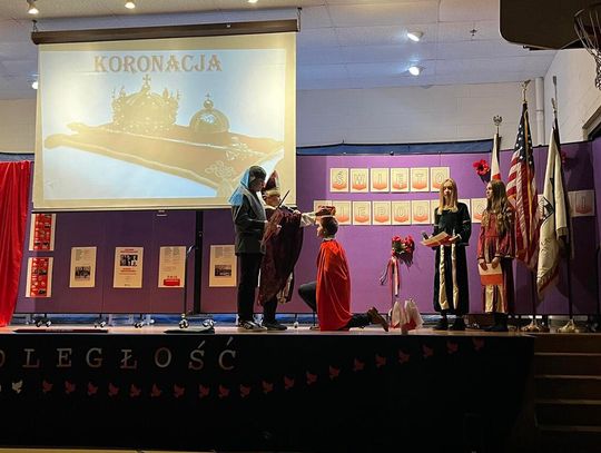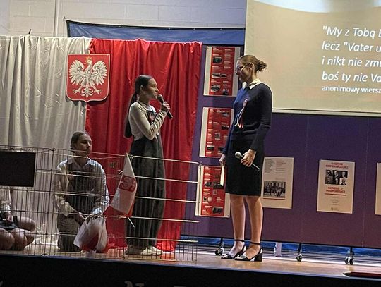 Uroczystość rozpoczęła się prawdziwą teatralną podróżą w czasie. Zebrani mogli przenieść się do początków polskiej państwowości, kiedy to przed ich oczami ukazała się scena koronacji pierwszego króla. Wzruszenie mieszało się z dumą, a młodzi aktorzy z pasją odgrywali kolejne epizody z historii ojczystej ziemi. W następnych aktach akademii przyszła pora na te trudniejsze momenty – czas zaborów, kiedy Polska zniknęła z mapy świata, ale nigdy nie zginęła w sercach swoich dzieci. Uczniowie przedstawili dramatyczne, ale niezwykle ważne obrazy z przeszłości, pokazując, że to właśnie pamięć, modlitwa i nieustająca wiara w wolność pozwoliły przetrwać narodowi przez 123 lata niewoli. W tych scenach było coś, co wykraczało poza szkolną inscenizację. Była szczerość, była prawda, była pamięć, która – mimo odległości od Ojczyzny – wciąż pulsuje w sercach młodego pokolenia.