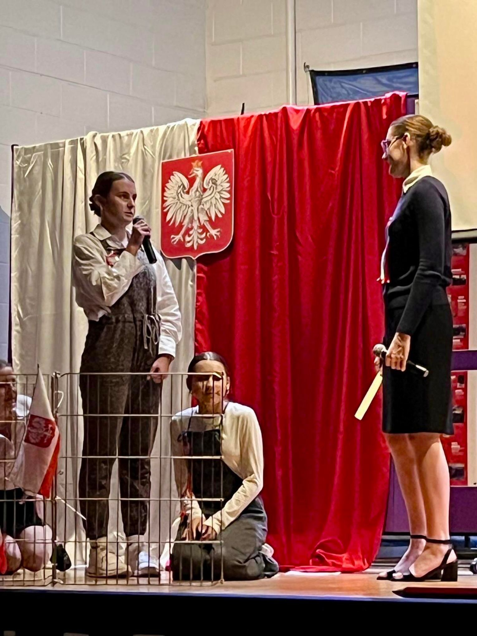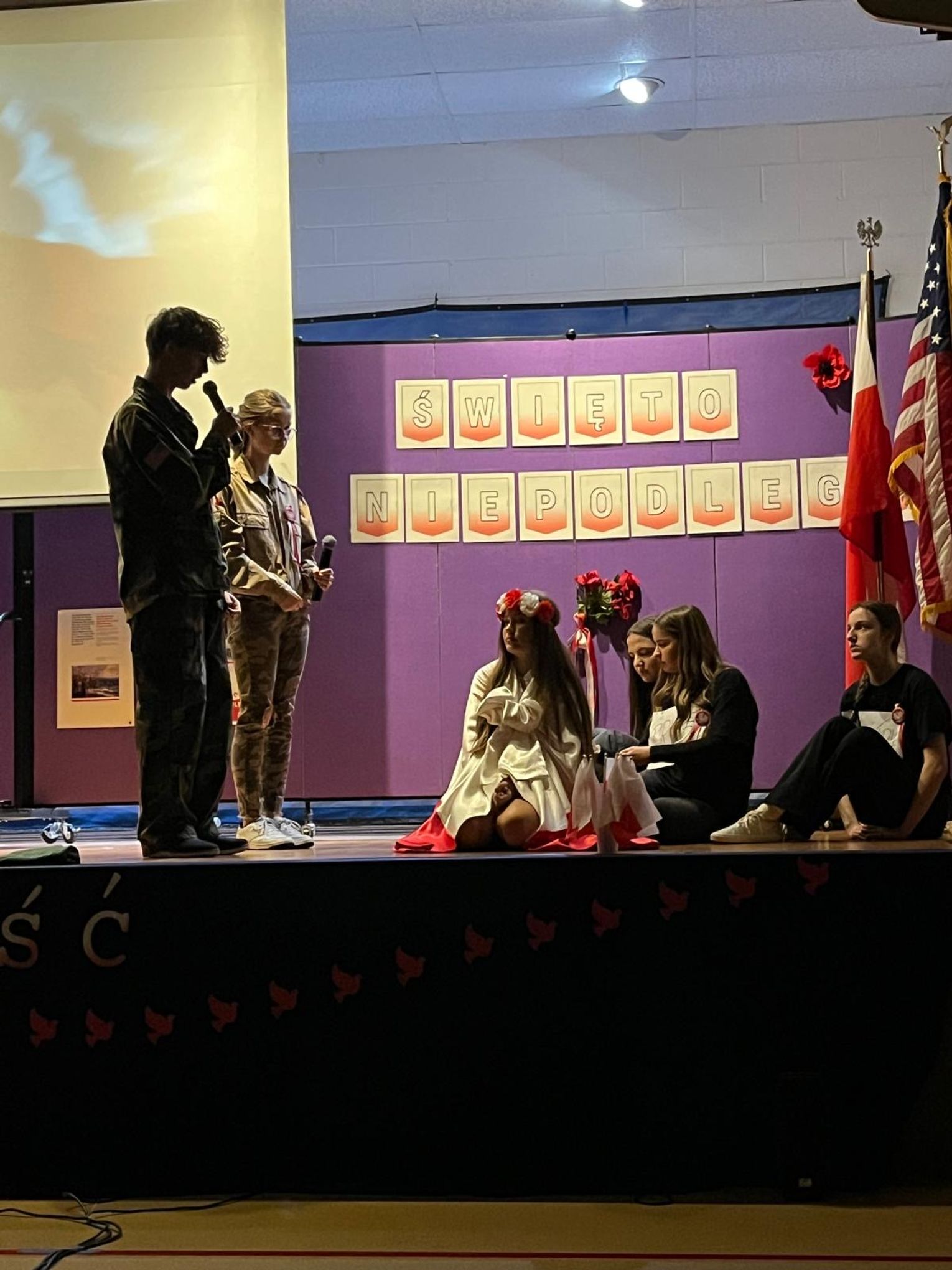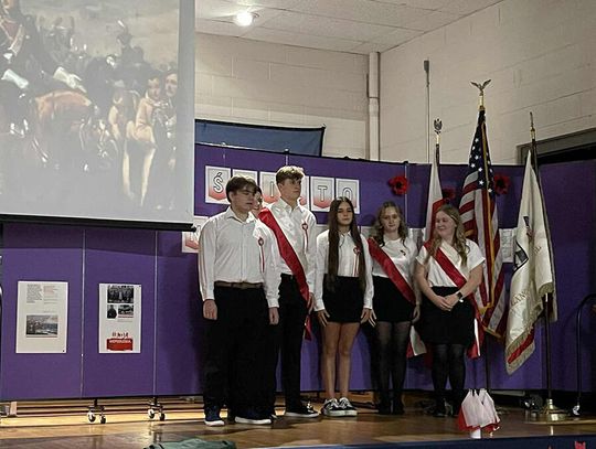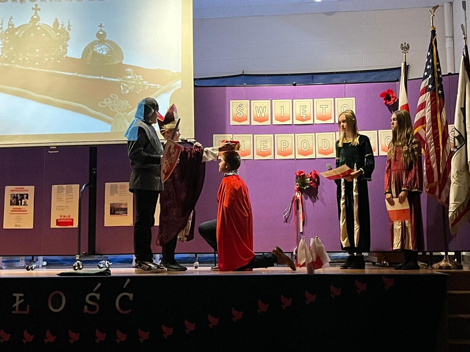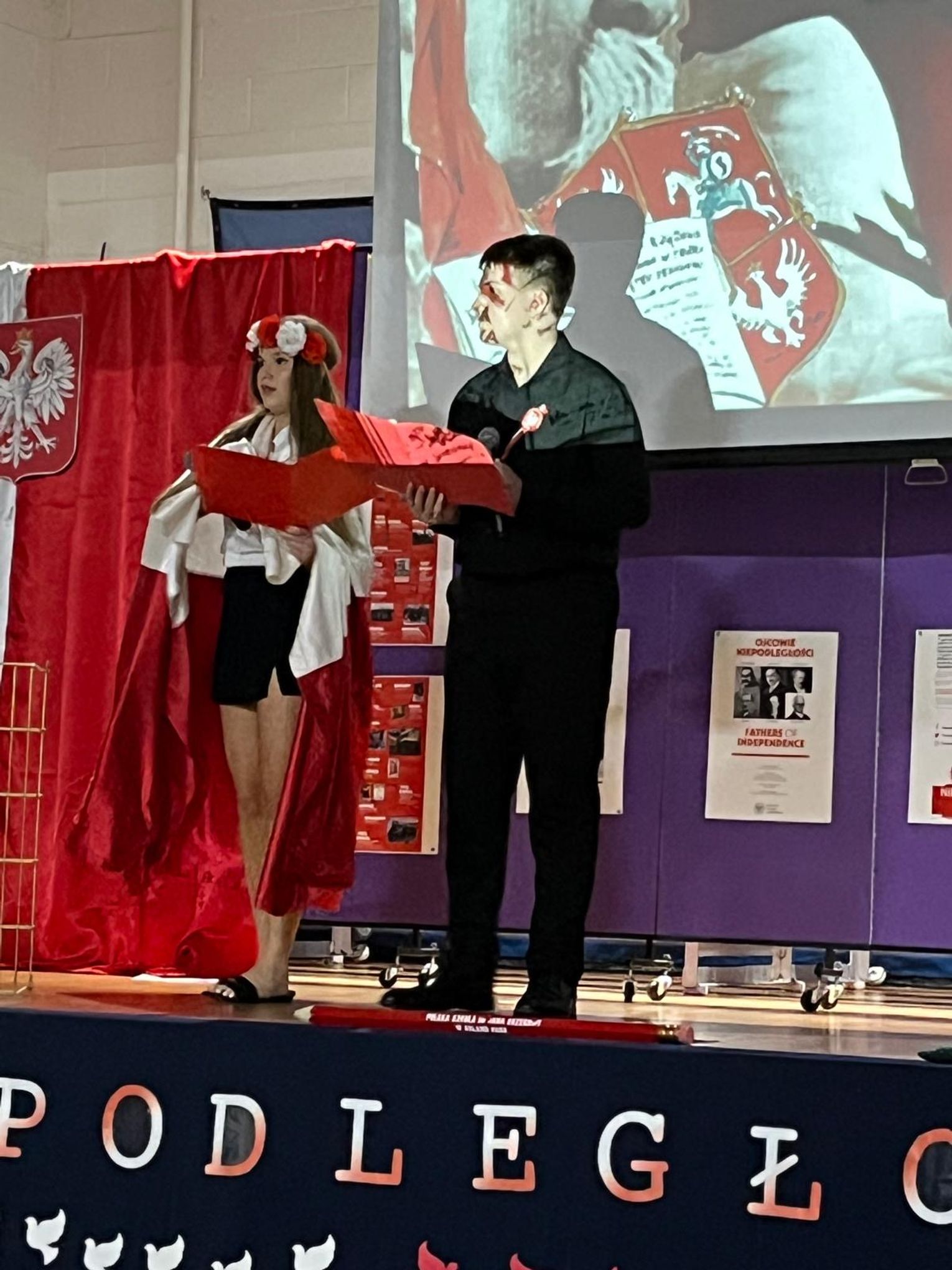 Uroczystość rozpoczęła się prawdziwą teatralną podróżą w czasie. Zebrani mogli przenieść się do początków polskiej państwowości, kiedy to przed ich oczami ukazała się scena koronacji pierwszego króla. Wzruszenie mieszało się z dumą, a młodzi aktorzy z pasją odgrywali kolejne epizody z historii ojczystej ziemi. W następnych aktach akademii przyszła pora na te trudniejsze momenty – czas zaborów, kiedy Polska zniknęła z mapy świata, ale nigdy nie zginęła w sercach swoich dzieci. Uczniowie przedstawili dramatyczne, ale niezwykle ważne obrazy z przeszłości, pokazując, że to właśnie pamięć, modlitwa i nieustająca wiara w wolność pozwoliły przetrwać narodowi przez 123 lata niewoli. W tych scenach było coś, co wykraczało poza szkolną inscenizację. Była szczerość, była prawda, była pamięć, która – mimo odległości od Ojczyzny – wciąż pulsuje w sercach młodego pokolenia.