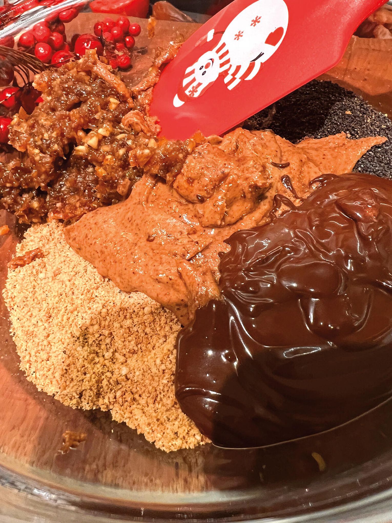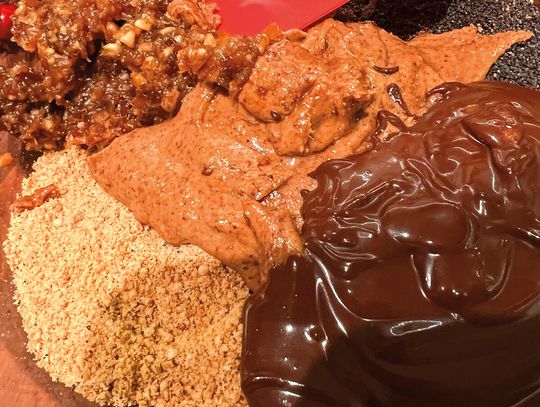 Podgrzej delikatnie czekoladę w rondelku lub rozpuść ją w kąpieli wodnej. Przełóż wszystkie składniki do miski i dokładnie ugniataj rękami, aż powstanie jednolita masa. Jeśli masa będzie zbyt sucha, dolewaj po łyżce wody z moczenia daktyli i ponownie wymieszaj.