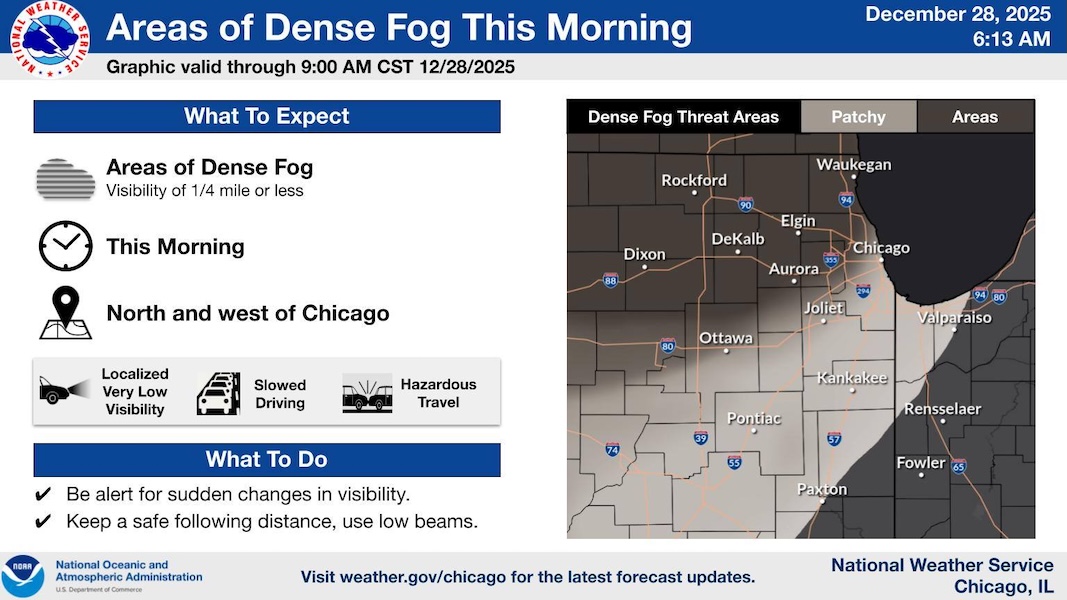 Niska widoczność, nawet poniżej pół mili, utrzyma się we wczesnych godzinach porannych w niedzielę, szczególnie na północ i zachód od Chicago.