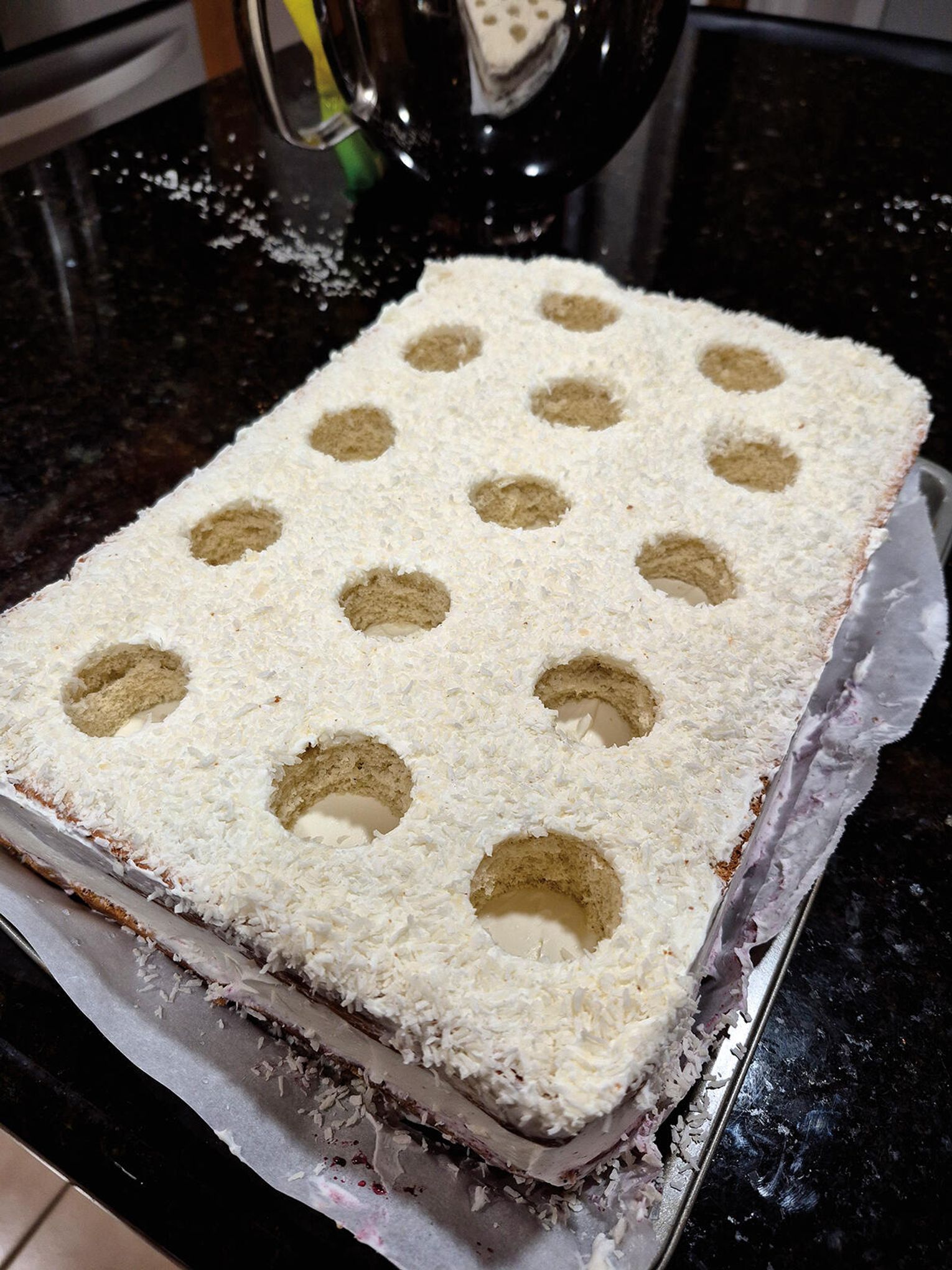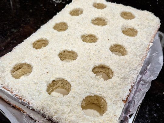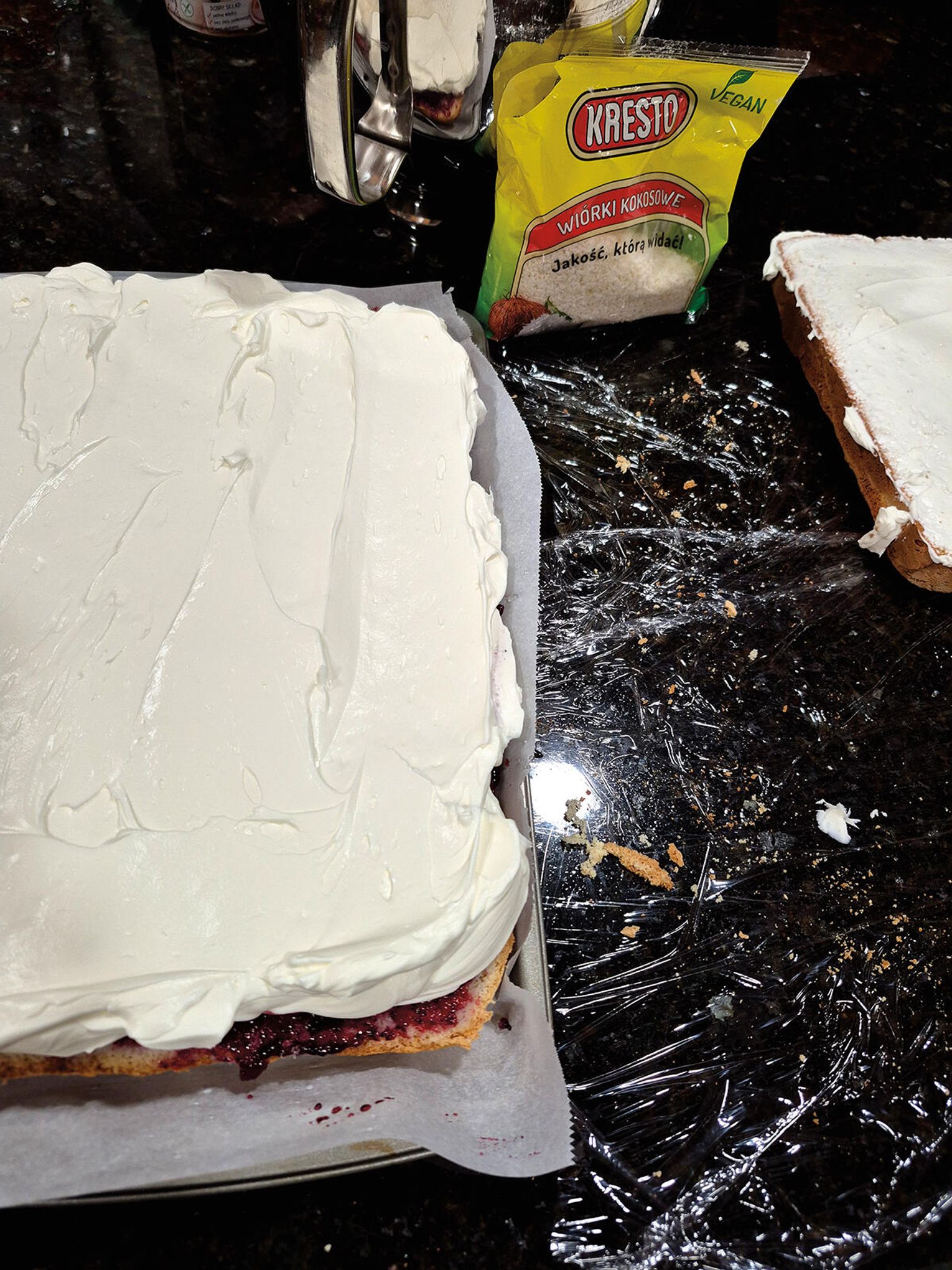 Pierwszy blat biszkoptu Posmaruj cienką warstwą dżemu (najlepiej truskawkowego lub malinowego). Na dżem nałóż równą warstwę kremu. Drugi biszkopt posmaruj bardzo cienką warstwą kremu i posyp kokosem, a następnie wytnij dziurki na galaretke (mniejszym kieliszkiem). Nałóż delikatnie biszkopt na ciasto, lekko przyciśnij po czym wlej galaretkę do wgłębień i włóż do lodówki na minimum 3 godziny lub całą noc (jeśli został Wam krem, posmarujcie nim boki ciasta).