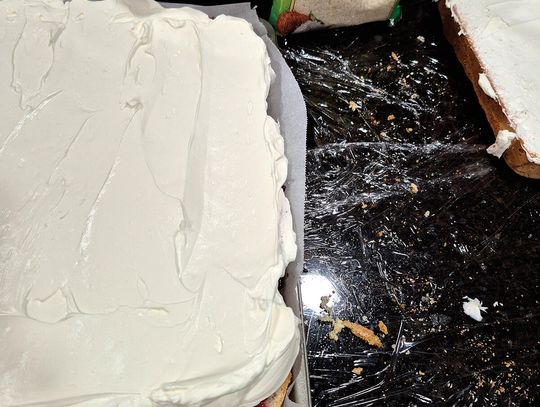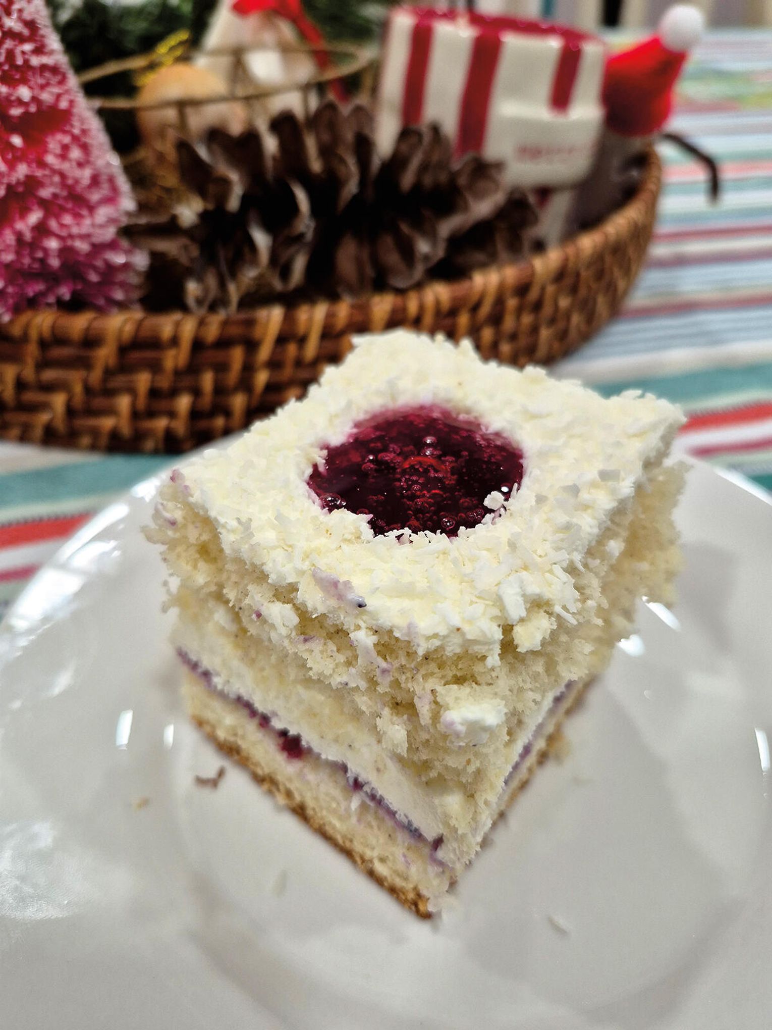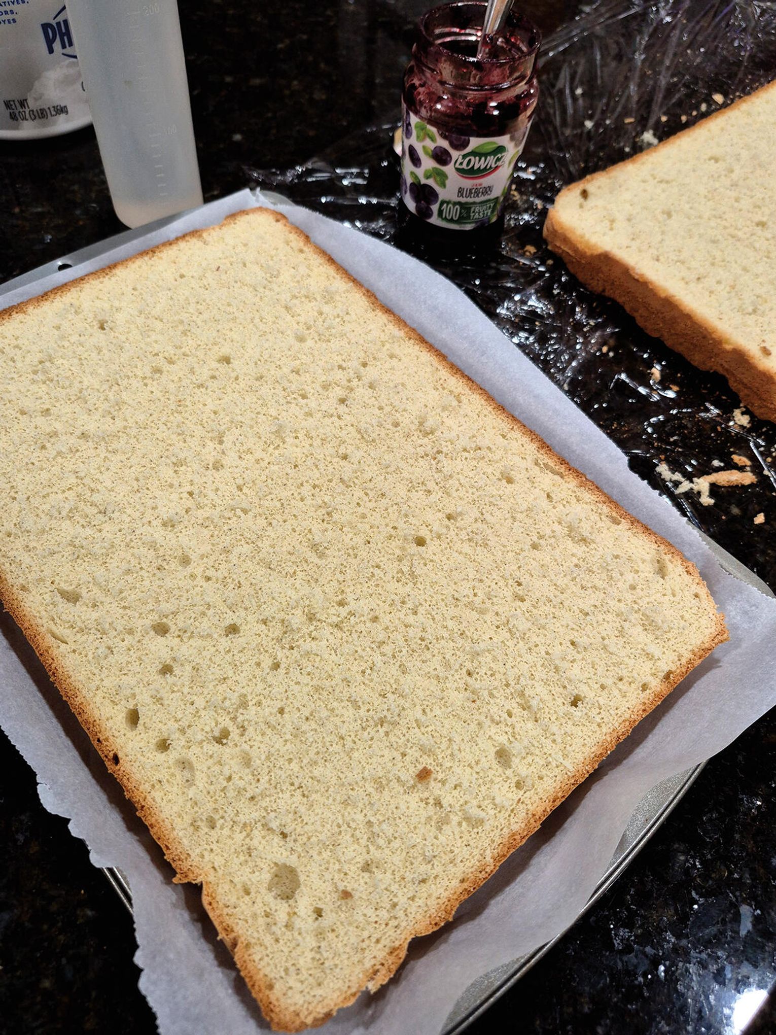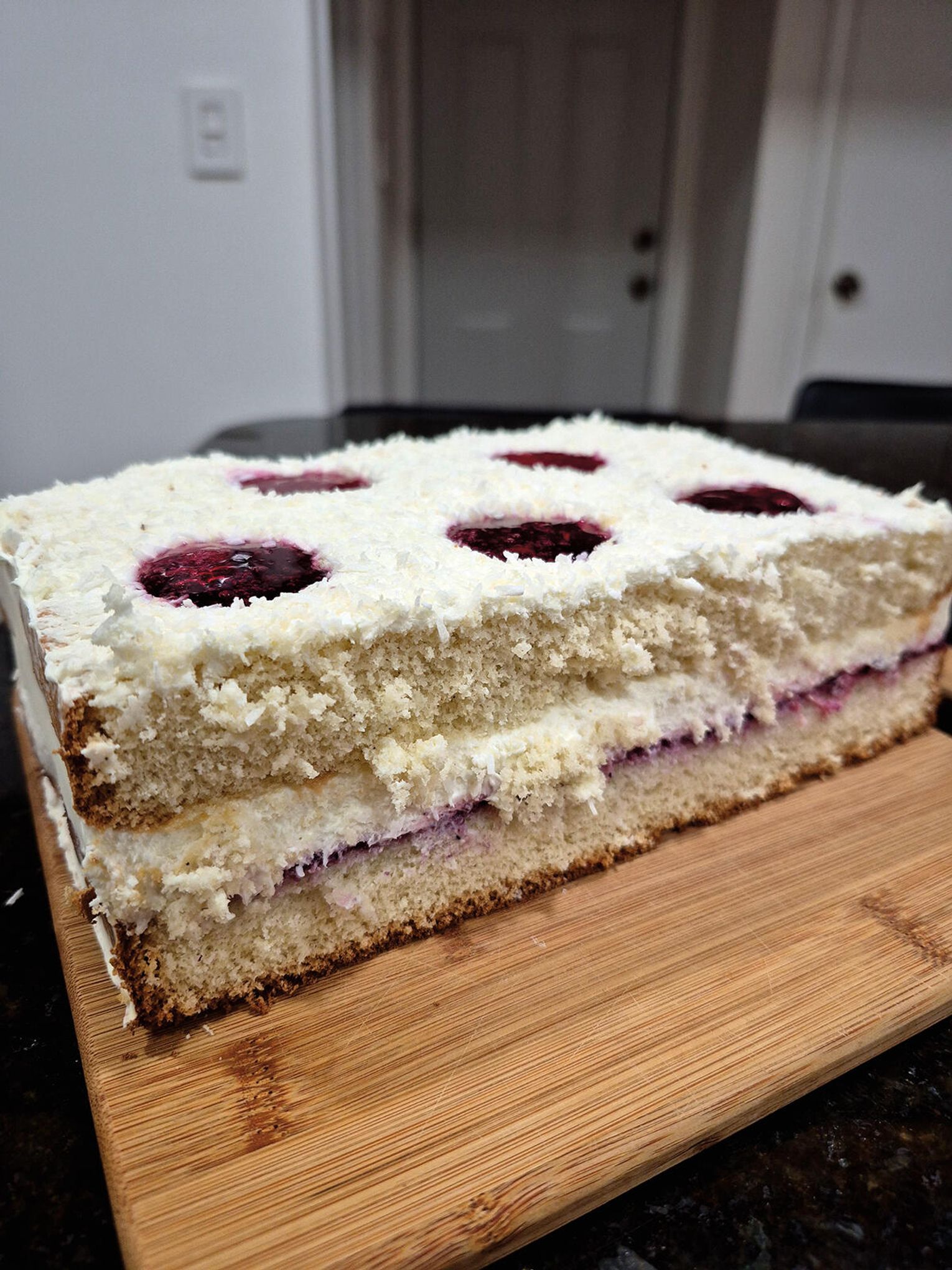 Pierwszy blat biszkoptu Posmaruj cienką warstwą dżemu (najlepiej truskawkowego lub malinowego). Na dżem nałóż równą warstwę kremu. Drugi biszkopt posmaruj bardzo cienką warstwą kremu i posyp kokosem, a następnie wytnij dziurki na galaretke (mniejszym kieliszkiem). Nałóż delikatnie biszkopt na ciasto, lekko przyciśnij po czym wlej galaretkę do wgłębień i włóż do lodówki na minimum 3 godziny lub całą noc (jeśli został Wam krem, posmarujcie nim boki ciasta).