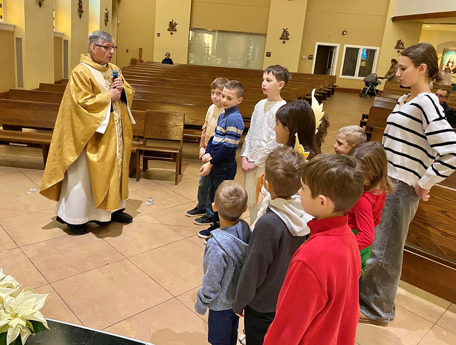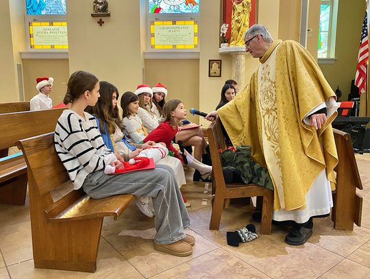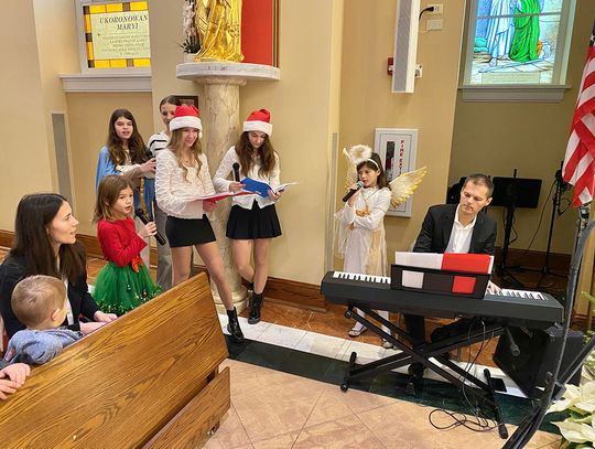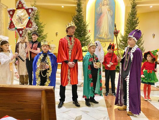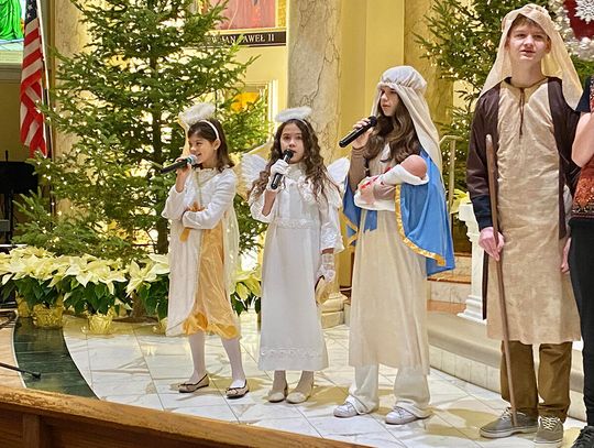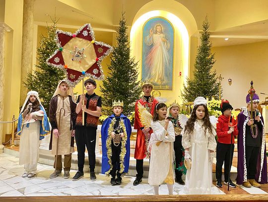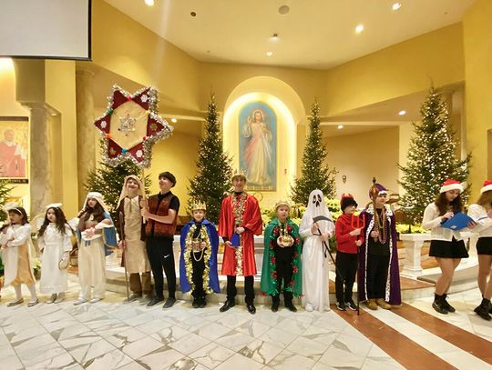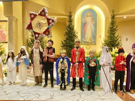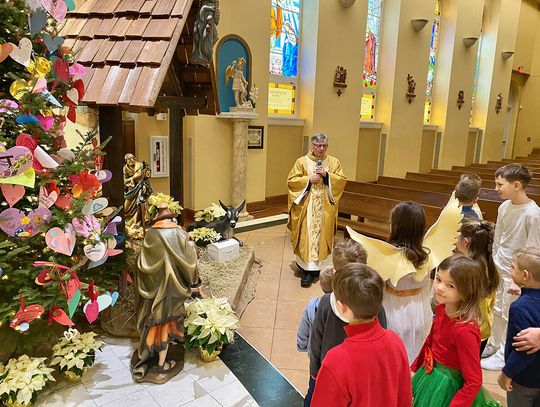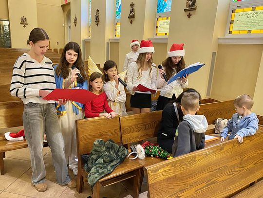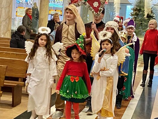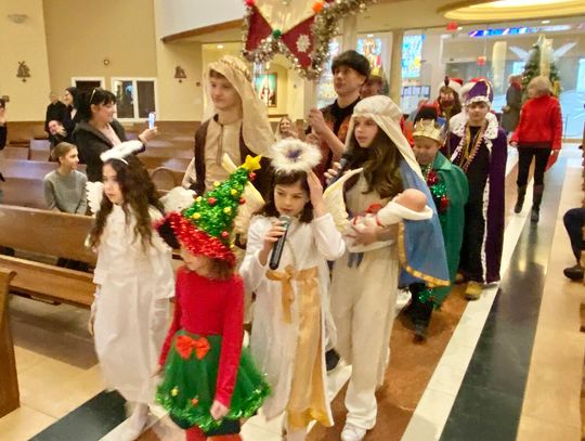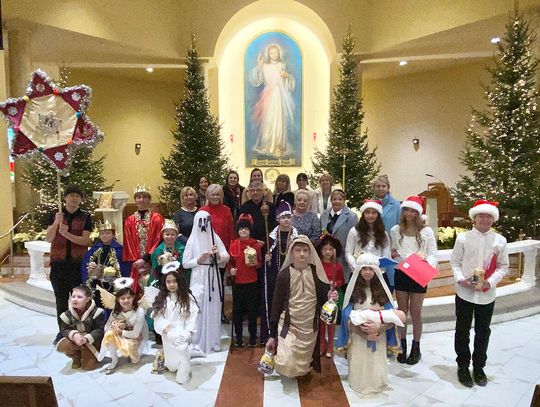To ważne w życiu szkoły wydarzenie zgromadziło uczniów, rodziców i nauczycieli. Ksiądz Andrzej Maślejak przypomniał historię Bożego narodzenia, zadając dzieciom szczegółowe pytania po polsku. Czytanie z Pierwszego Listu Świętego Jana Apostoła zaprezentowała nauczycielka Jola Plesiewicz. Ksiądz Andrzej Maślejak wygłosił homilię otoczony dziećmi, przed betlejemską stajenką usytuowaną przy ołtarzu głównym.