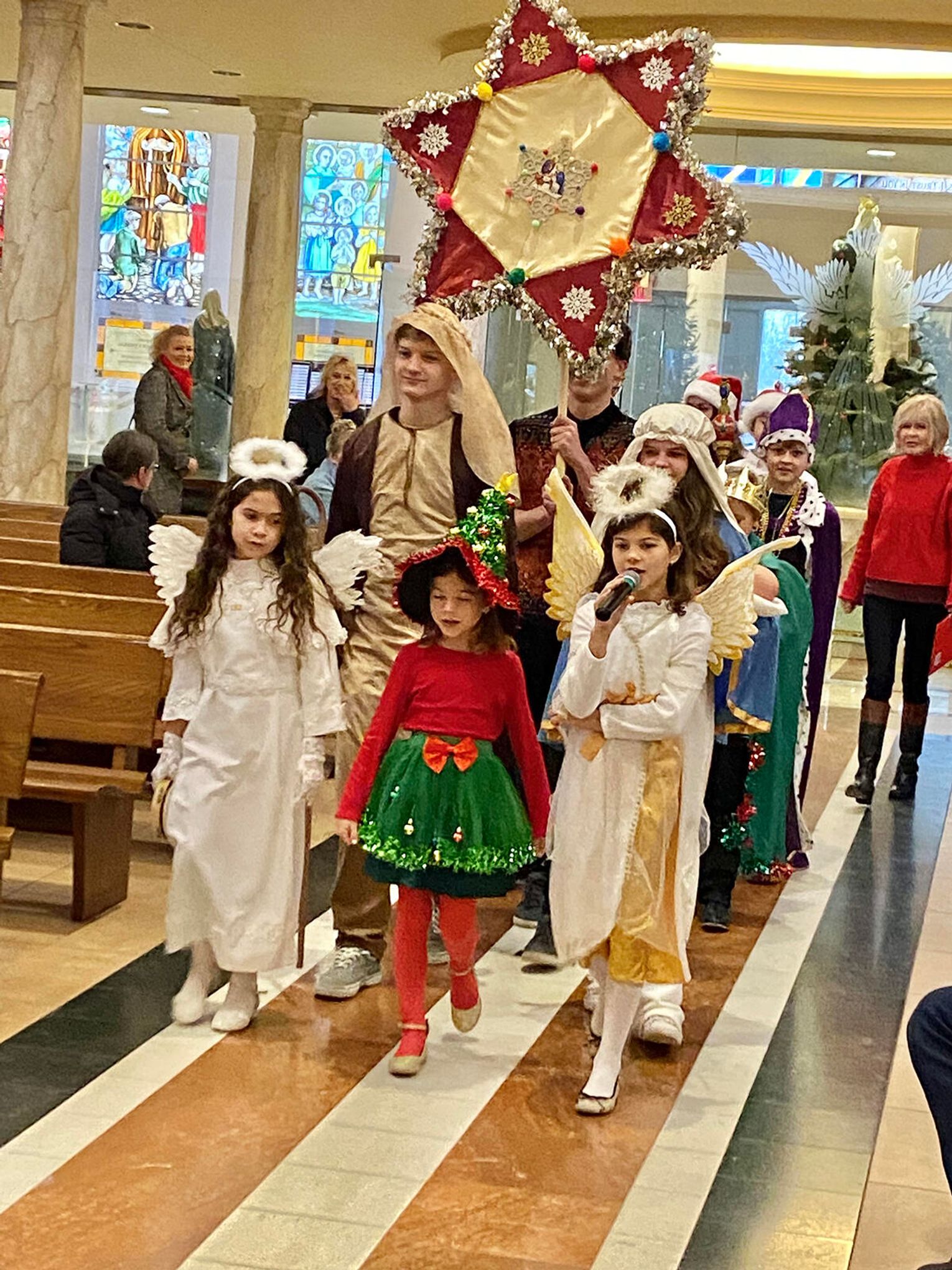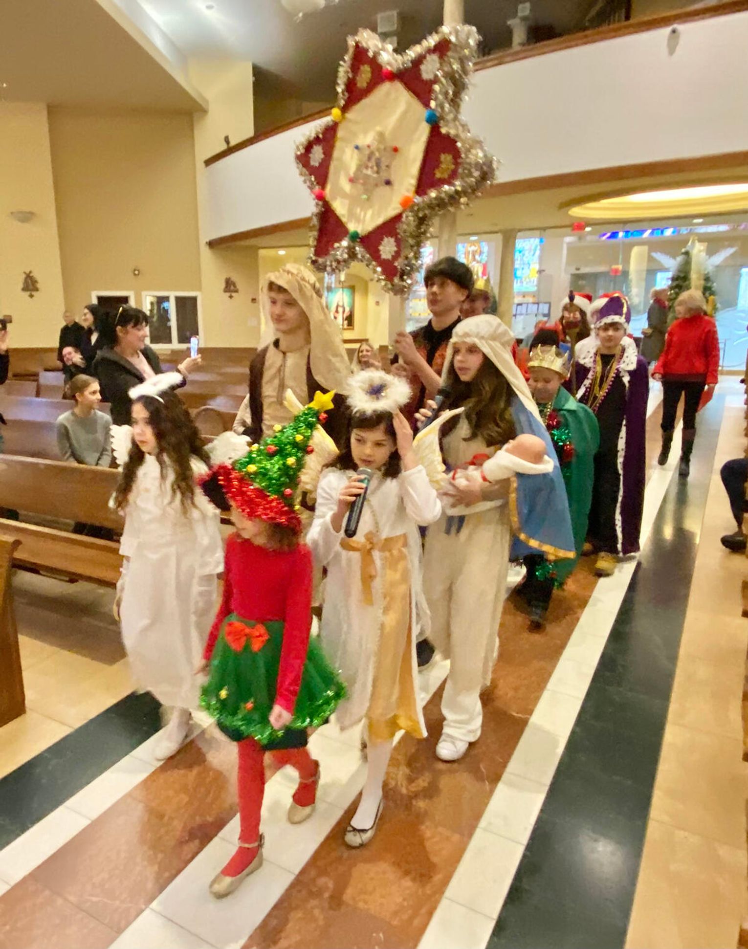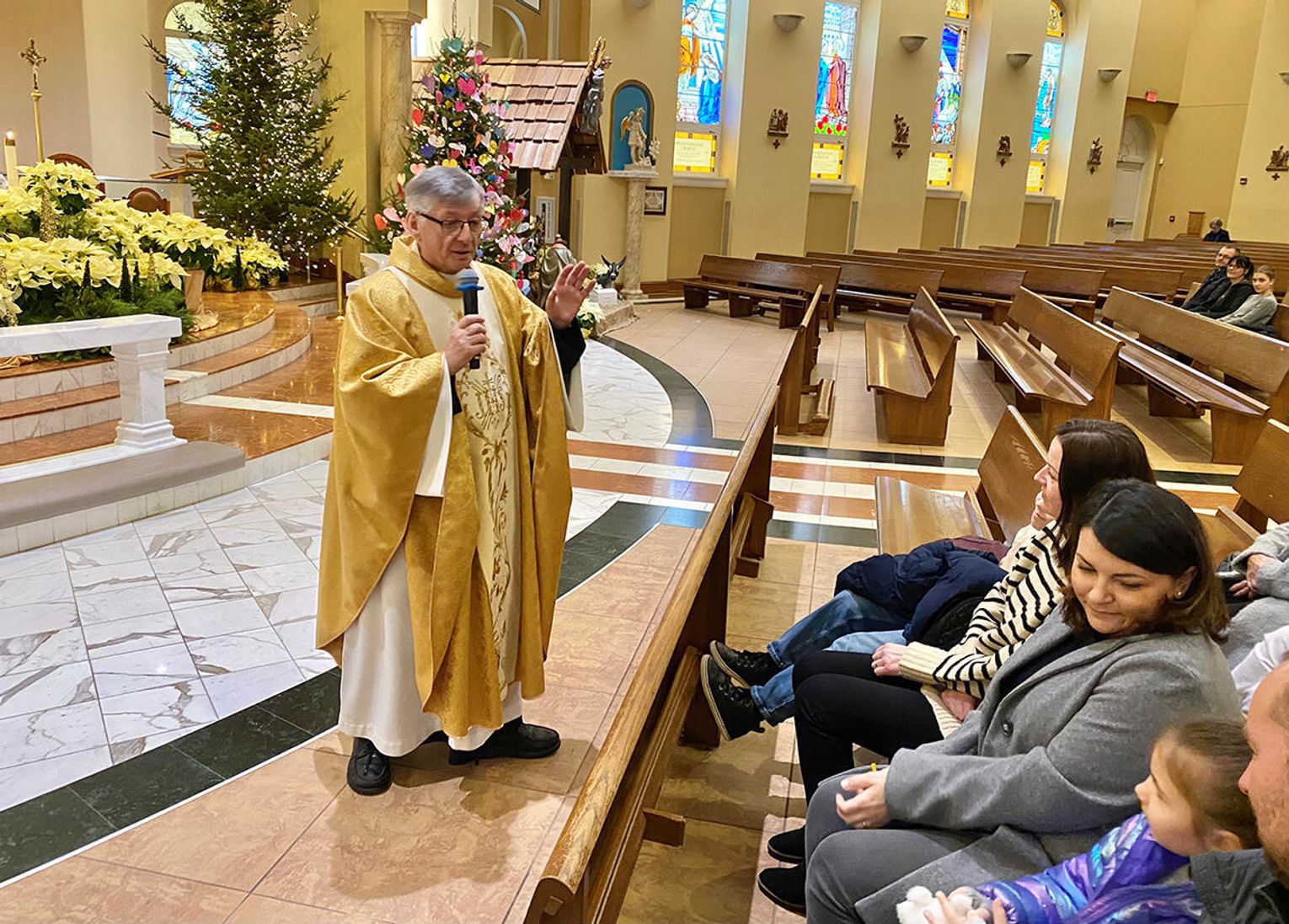 To ważne w życiu szkoły wydarzenie zgromadziło uczniów, rodziców i nauczycieli. Ksiądz Andrzej Maślejak przypomniał historię Bożego narodzenia, zadając dzieciom szczegółowe pytania po polsku. Czytanie z Pierwszego Listu Świętego Jana Apostoła zaprezentowała nauczycielka Jola Plesiewicz. Ksiądz Andrzej Maślejak wygłosił homilię otoczony dziećmi, przed betlejemską stajenką usytuowaną przy ołtarzu głównym.