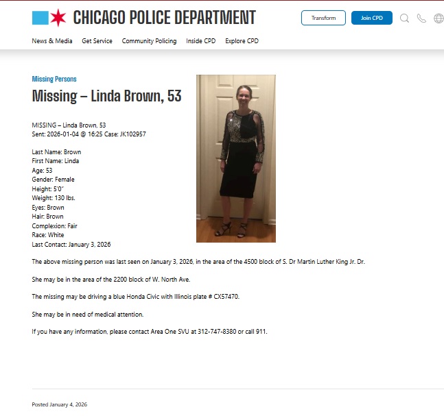 Osoby posiadające jakiekolwiek informacje o miejscu pobytu Lindy Brown proszone są o kontakt z detektywami z 1. Rejonu Policji Chicagowskiej (Area One) pod numerem (312) 747-8380.