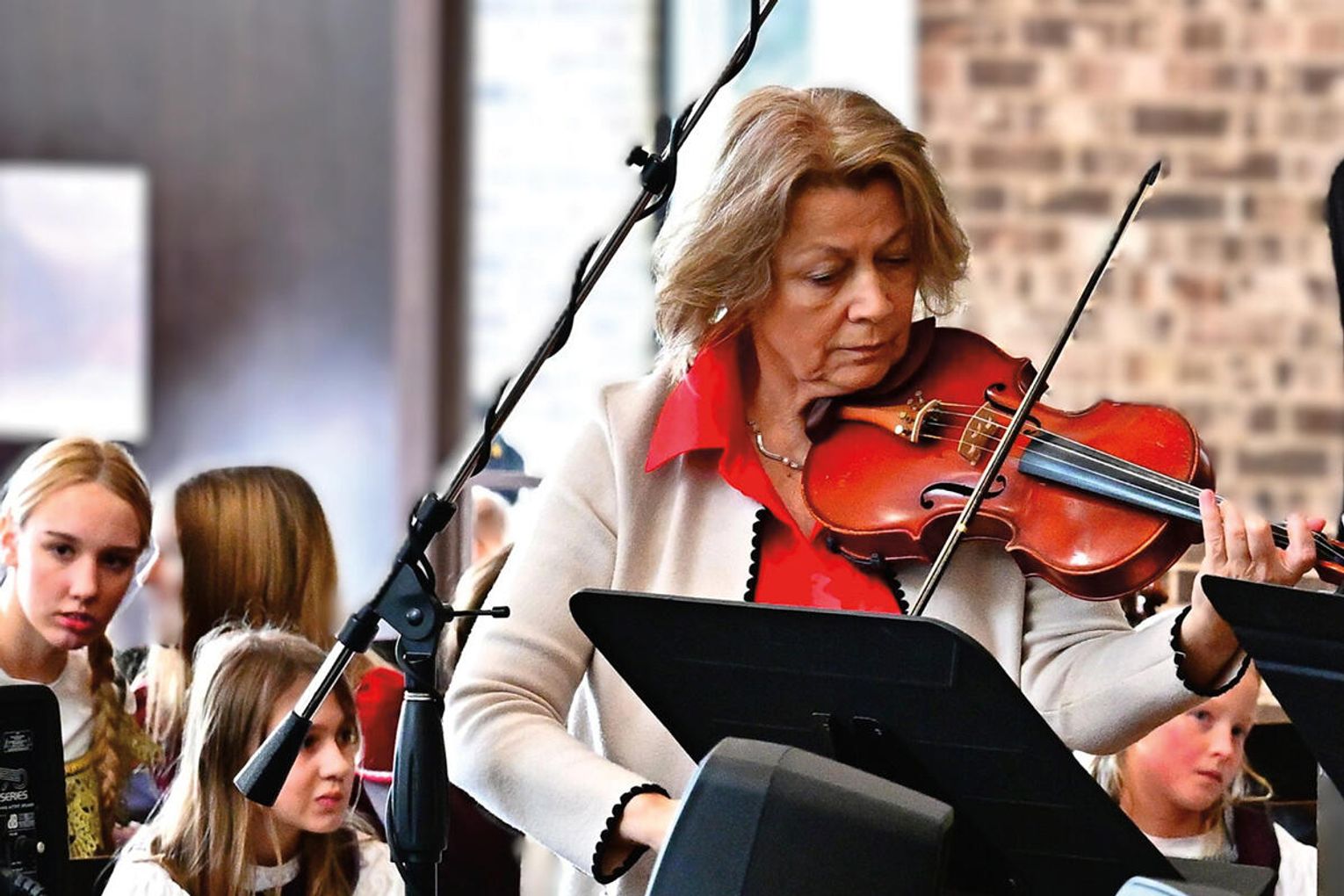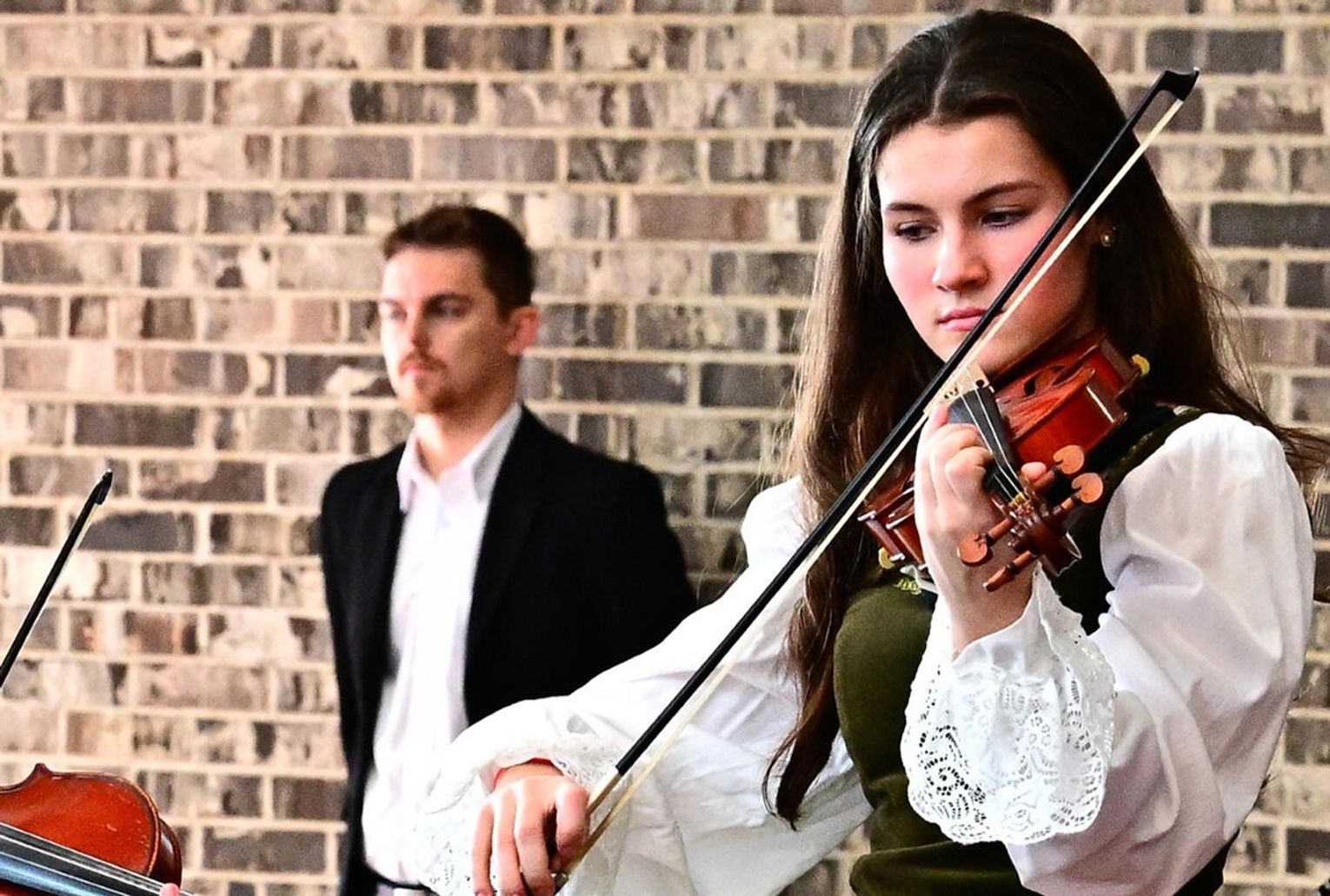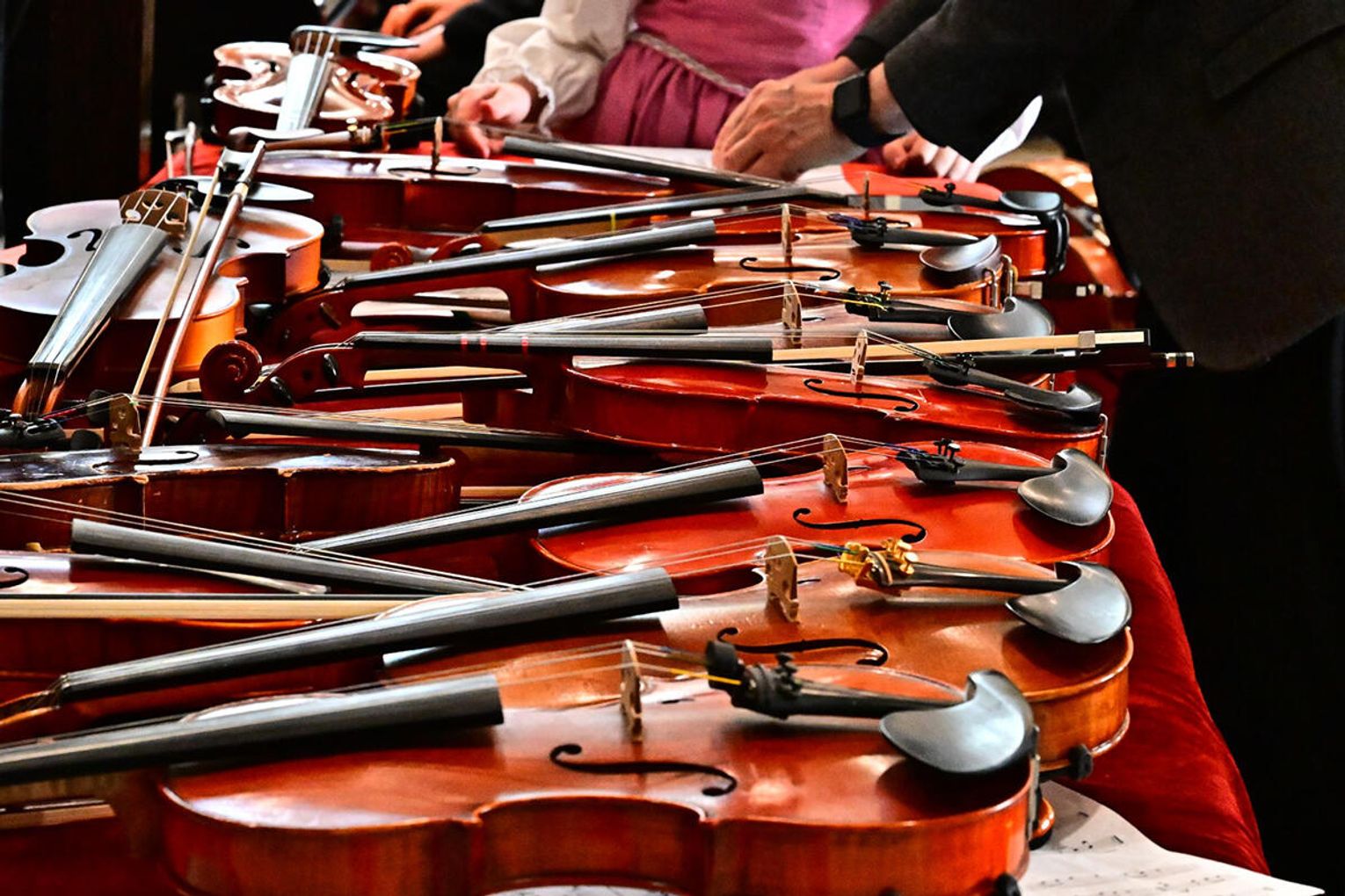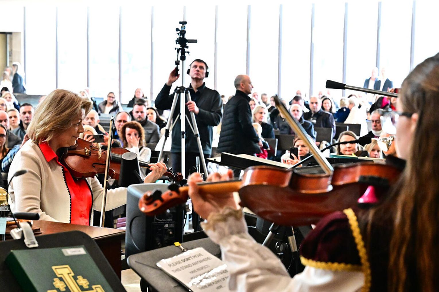 W wykonaniu orkiestry smyczkowej Akademii Muzyki PaSO zebrani wysłuchali m.in. utworu „One Winter Night” Johna Mossa, urzekającego delikatną liryką i subtelną melodyką. Z kompozycji inspirowanej kolędą „Cicha noc”. muzycy wydobyli ciepłe, emocjonalne tony, budując atmosferę spokojnej zimowej nocy i poruszając publiczność dojrzałością i techniczną elegancją. Artyści z orkiestry akompaniowali również młodym chórzystom akademii w wykonaniu kolęd: „Lulajże Jezuniu” “, której kołysankowy charakter zyskał na delikatności dzięki miękkim, falującym smyczkom orkiestry i „Dzisiaj w Betlejem” – z radosną dynamiką budowaną delikatnym wejściem instrumentów i pełnym wigoru chórem, tworząc jednolitą całość.