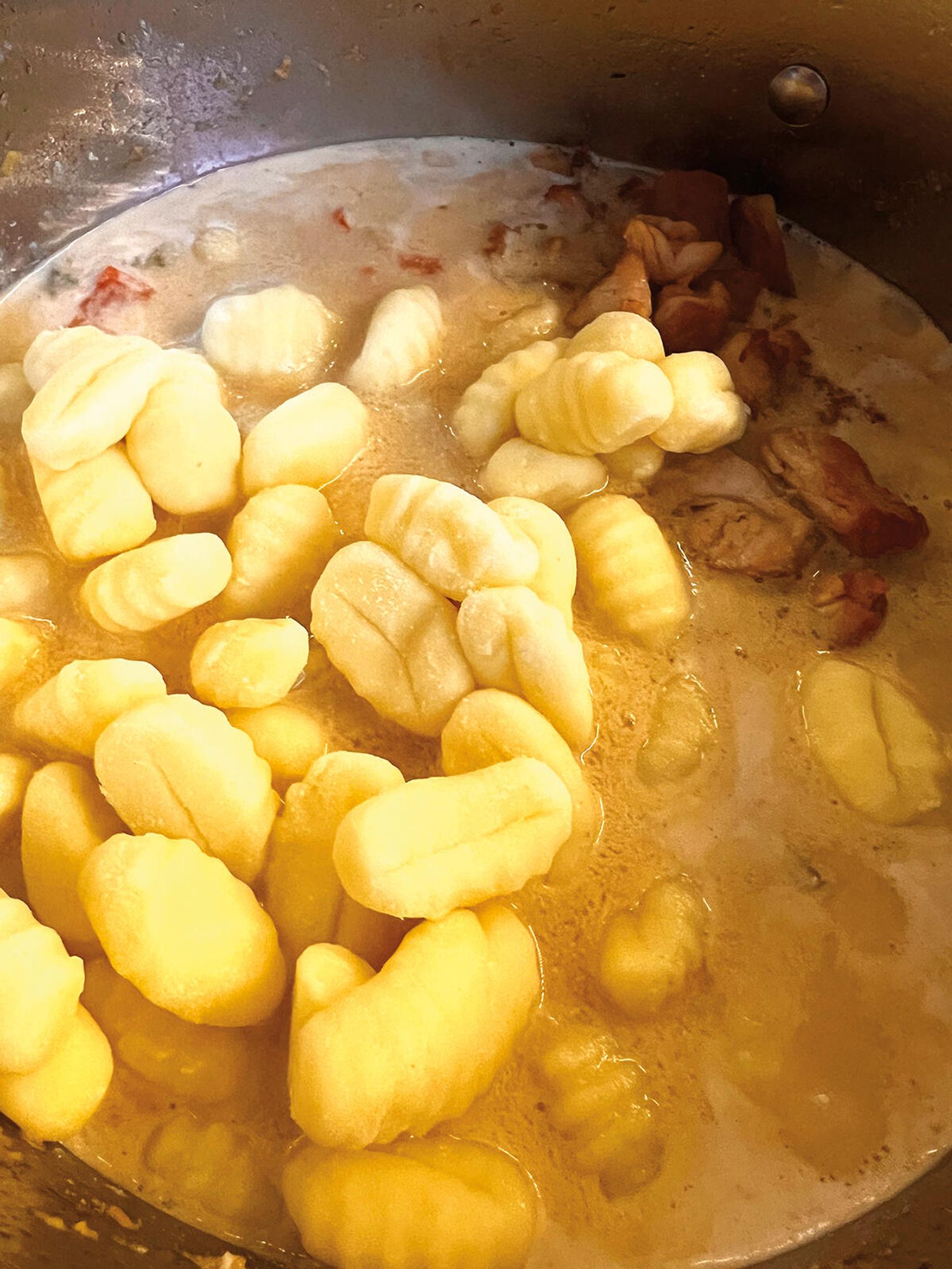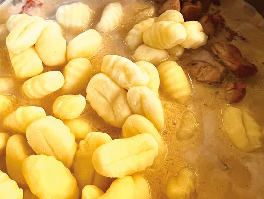 Dodaj podsmażonego indyka i gnocchi. Gotuj całość jeszcze kilka minut, aż kluseczki będą miękkie.
