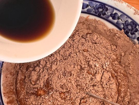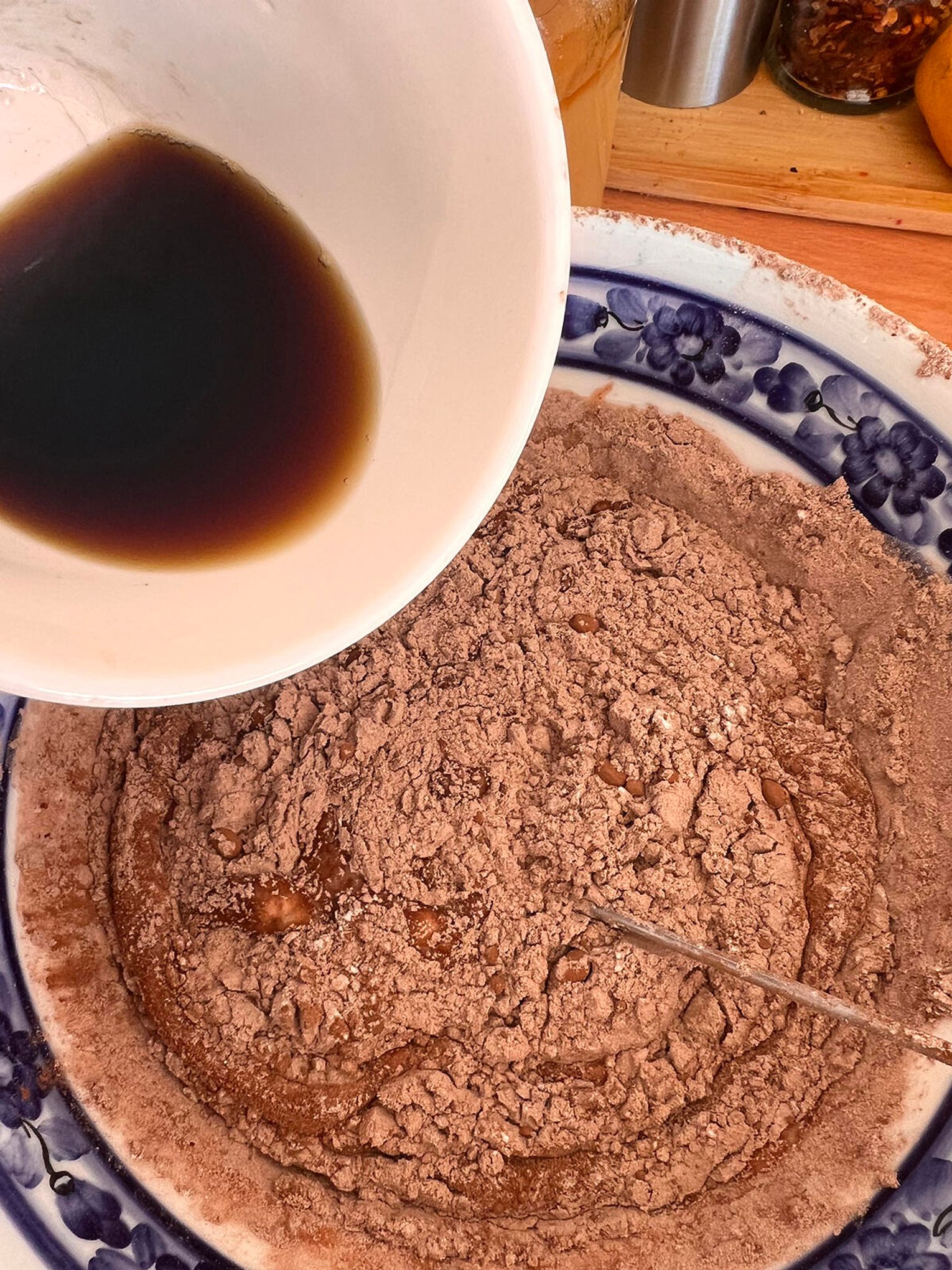 Rozpuść kawę w gorącej wodzie i wlej do masy, wymieszaj.
