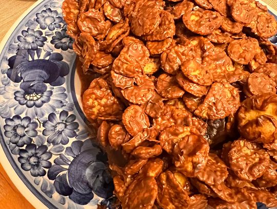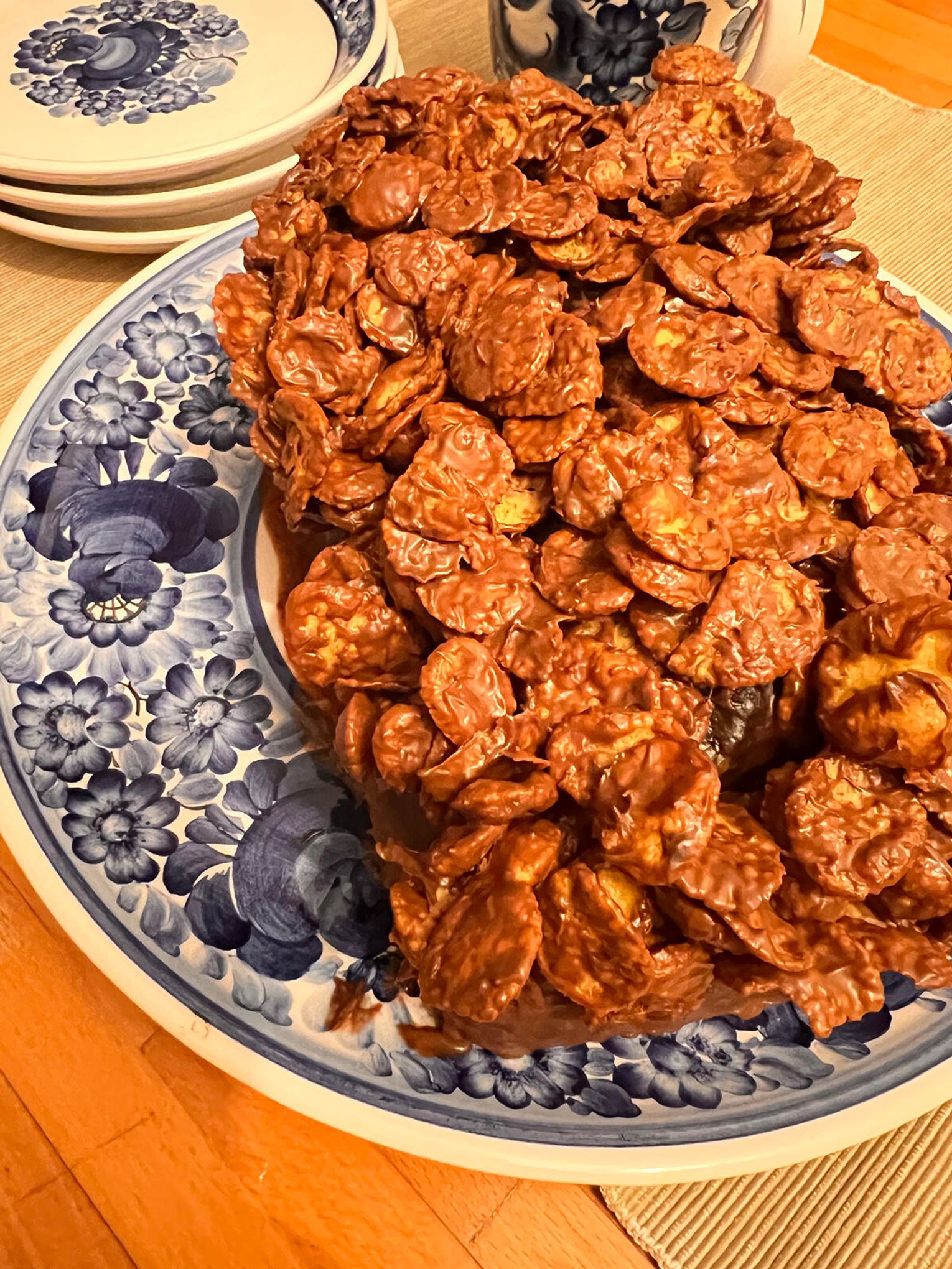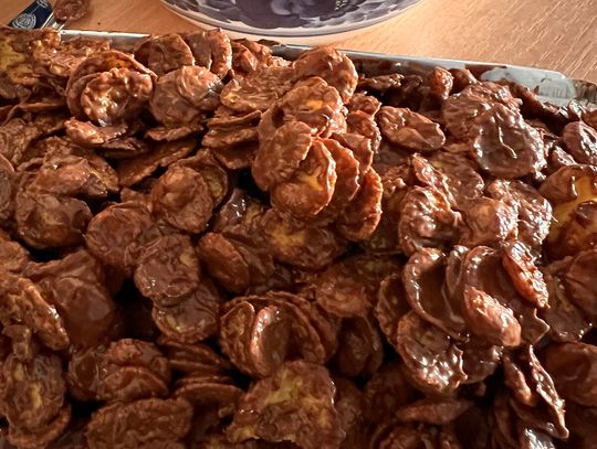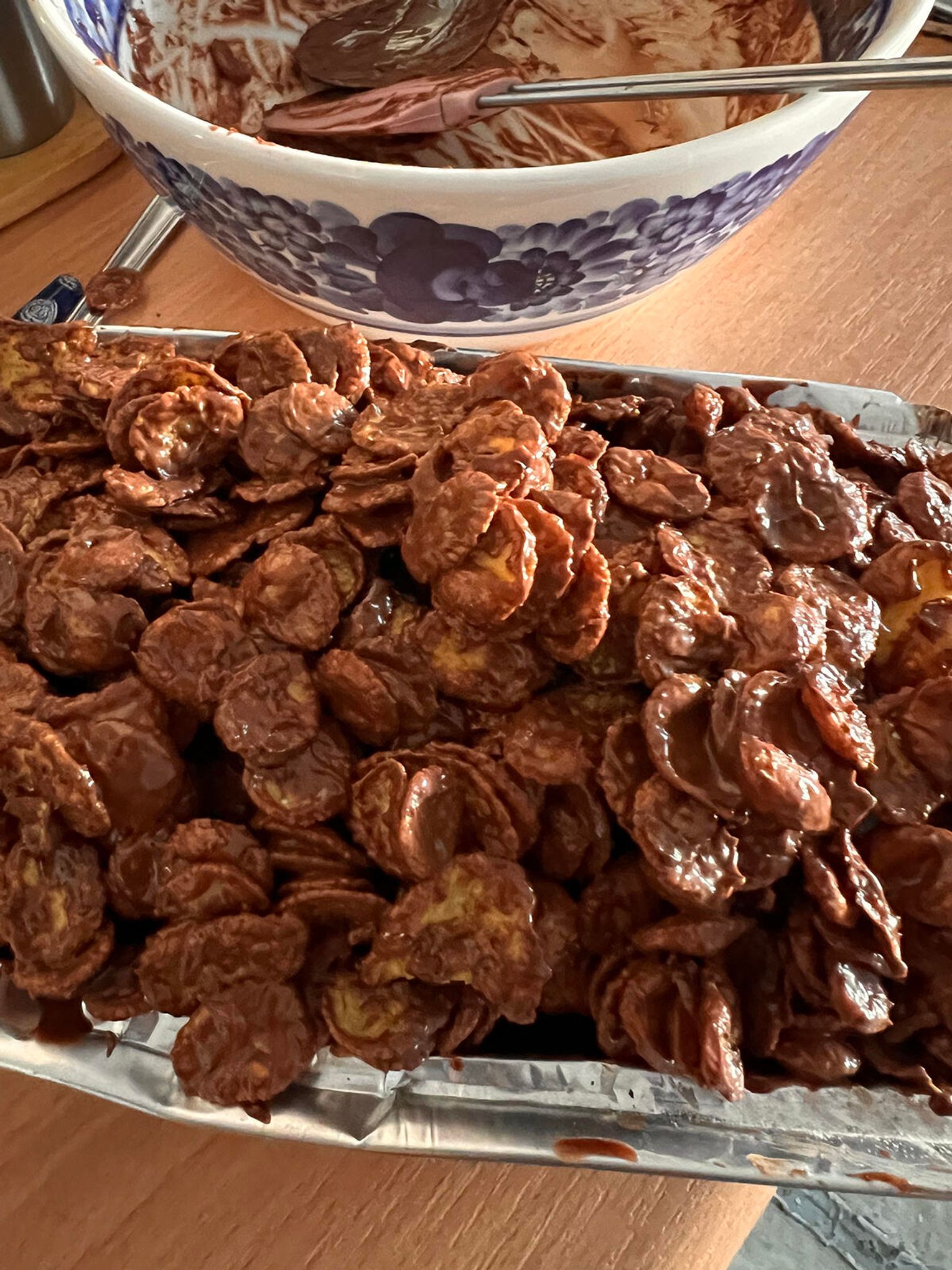 Odstaw ciasto i przygotuj chrupiącą warstwę. Podgrzej krem czekoladowy bardzo krótko (najlepiej w kąpieli wodnej), tylko do momentu, aż stanie się lekko lejący. Krem nie może być za bardzo ciepły, bo sprawi, że płatki kukurydziane zmiękną i nie będą chrupały. Wymieszaj go delikatnie z płatkami kukurydzianymi, żeby były oklejone kremem, ale nie pokruszyły się.