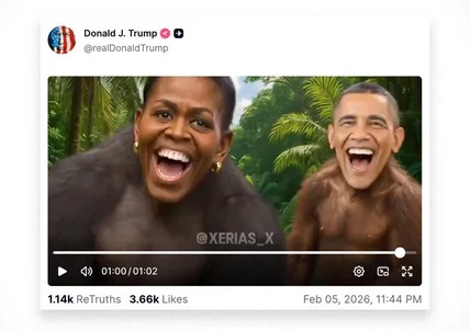 Prezydent Trump zamieścił nagranie w swojej sieci społecznościowej Truth Social w czwartek wieczorem. Pod koniec, przez sekundę, na wygenerowanym przez sztuczną inteligencję nagraniu pojawiają się dwie małpy z twarzami Obamów. Nagranie poświęcone jest teorii spiskowej na temat wyborów w 2020 r.
