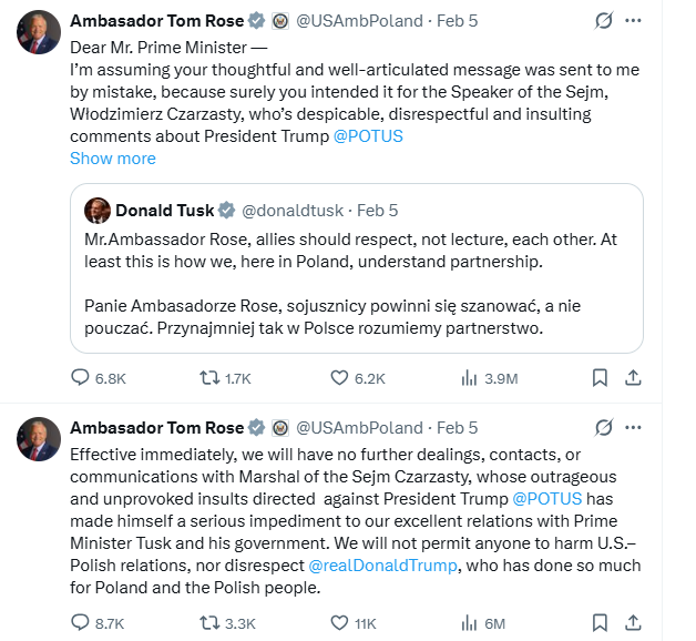 Głos w tej sprawie zabrał także premier Donald Tusk, który – zwracając się na X do ambasadora USA – podkreślił, że sojusznicy powinni się szanować, a nie pouczać. „Przynajmniej tak w Polsce rozumiemy partnerstwo” – dodał szef rządu. W odpowiedzi na te słowa premiera Tuska ambasador USA napisał, że jego wpis (Tuska – PAP) najpewniej był skierowany do marszałka Czarzastego, którego – jak ocenił Rose – obraźliwe komentarze o prezydencie Trumpie mogły „potencjalnie zaszkodzić rządowi”. Ambasador USA wyraził zarazem uznanie dla odważnego przywództwa Tuska i jego wkładu w relacje z USA. Podkreślił, że obrażanie Trumpa, którego nazwał największym przyjacielem, jakiego Polska kiedykolwiek miała w Białym Domu, jest niedopuszczalne.