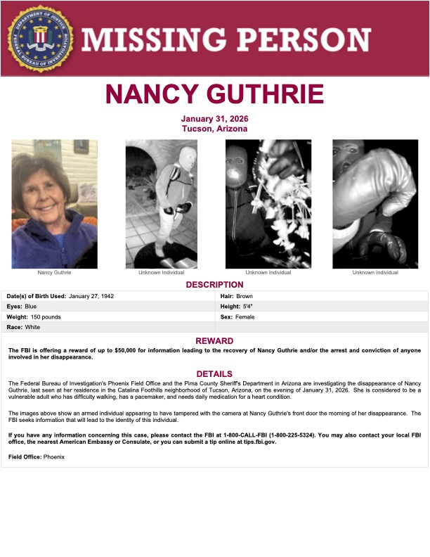 FBI oferuje 50 tys. dolarów nagrody za informacje prowadzące do odnalezienia Nancy Guthrie lub skazania sprawców w tej sprawie. Dotychczas nie zidentyfikowano żadnych podejrzanych.