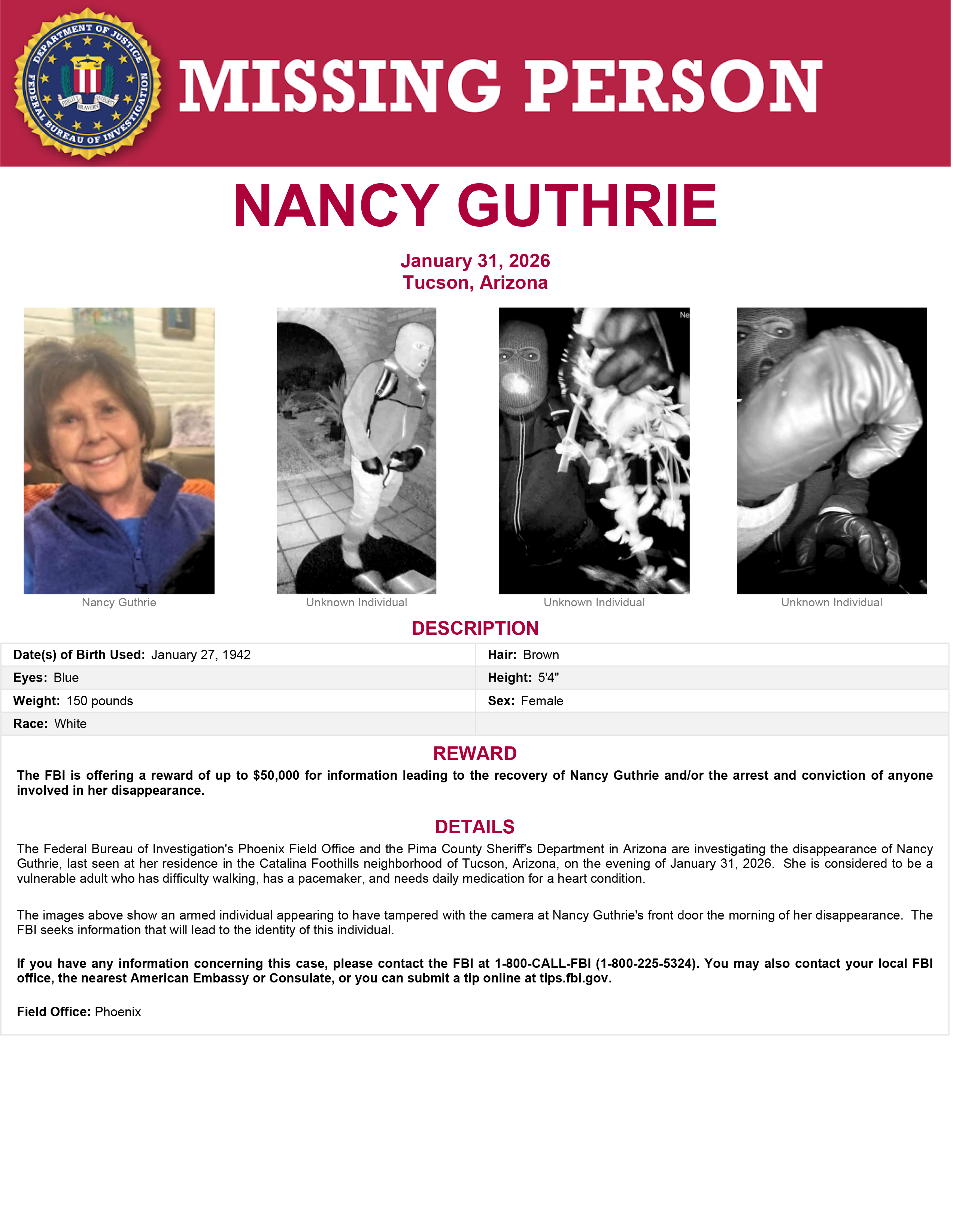 Zdjęcia opublikowane przez FBI i Biuro Szeryfa powiatu Pima pokazują mężczyznę w rękawiczkach i z plecakiem, posiadającego – jak się wydaje – broń w kaburze, gdy zbliża się do drzwi wejściowych domu Nancy Guthrie.