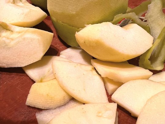 Jabłka obierz, przekrój na ćwiartki i pokrój w cienkie plasterki. Dodaj je do ciasta i starannie wymieszaj.