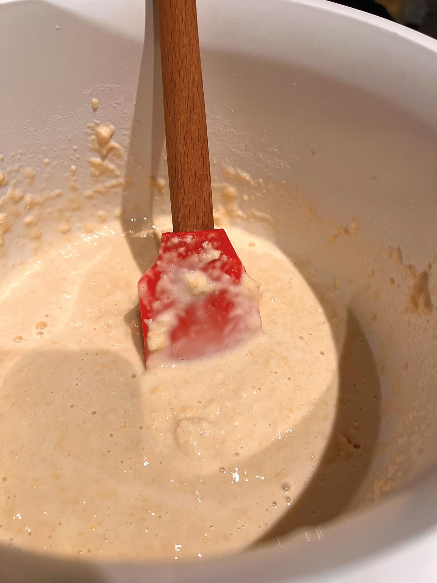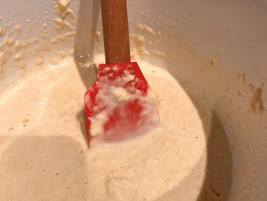 Dodaj resztę mleka, jajko, pozostały cukier i sól. Stopniowo wsypuj mąkę, mieszając do uzyskania gęstego, elastycznego ciasta. Masa powinna być wyraźnie gęstsza niż naleśnikowa – powoli spadać z łyżki.