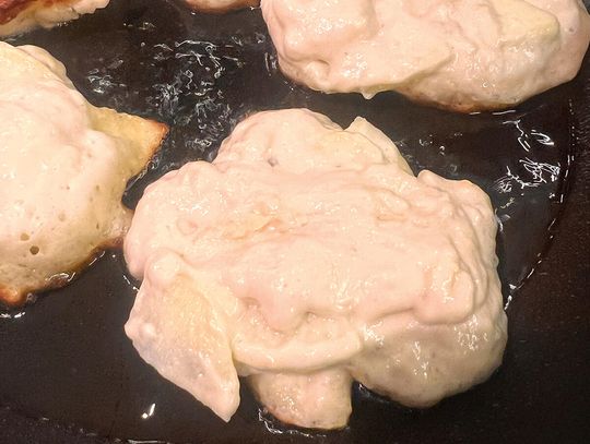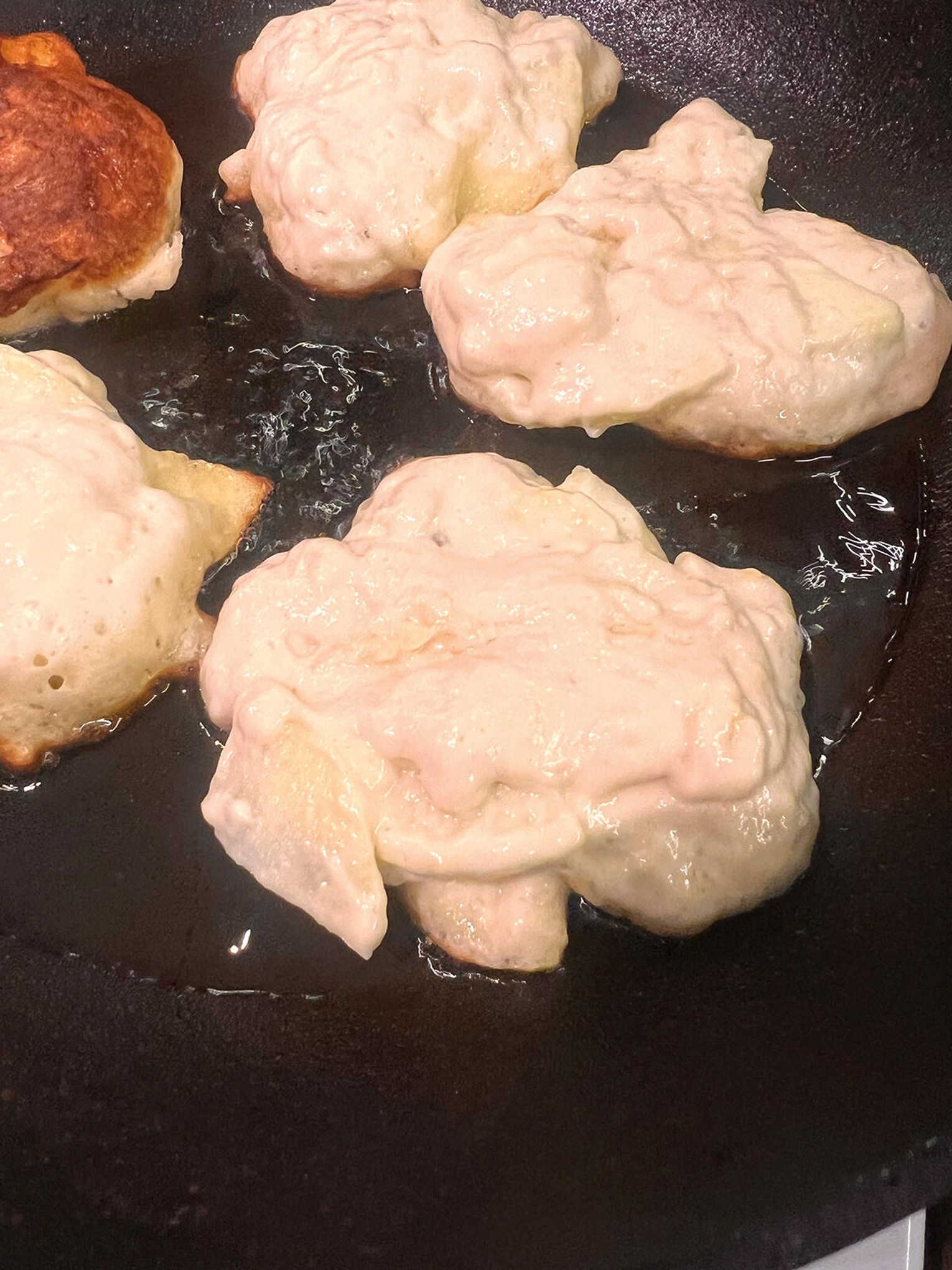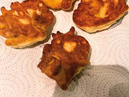 Na patelni rozgrzej warstwę oleju na średnim ogniu. Nakładaj łyżką porcje ciasta z jabłkami.