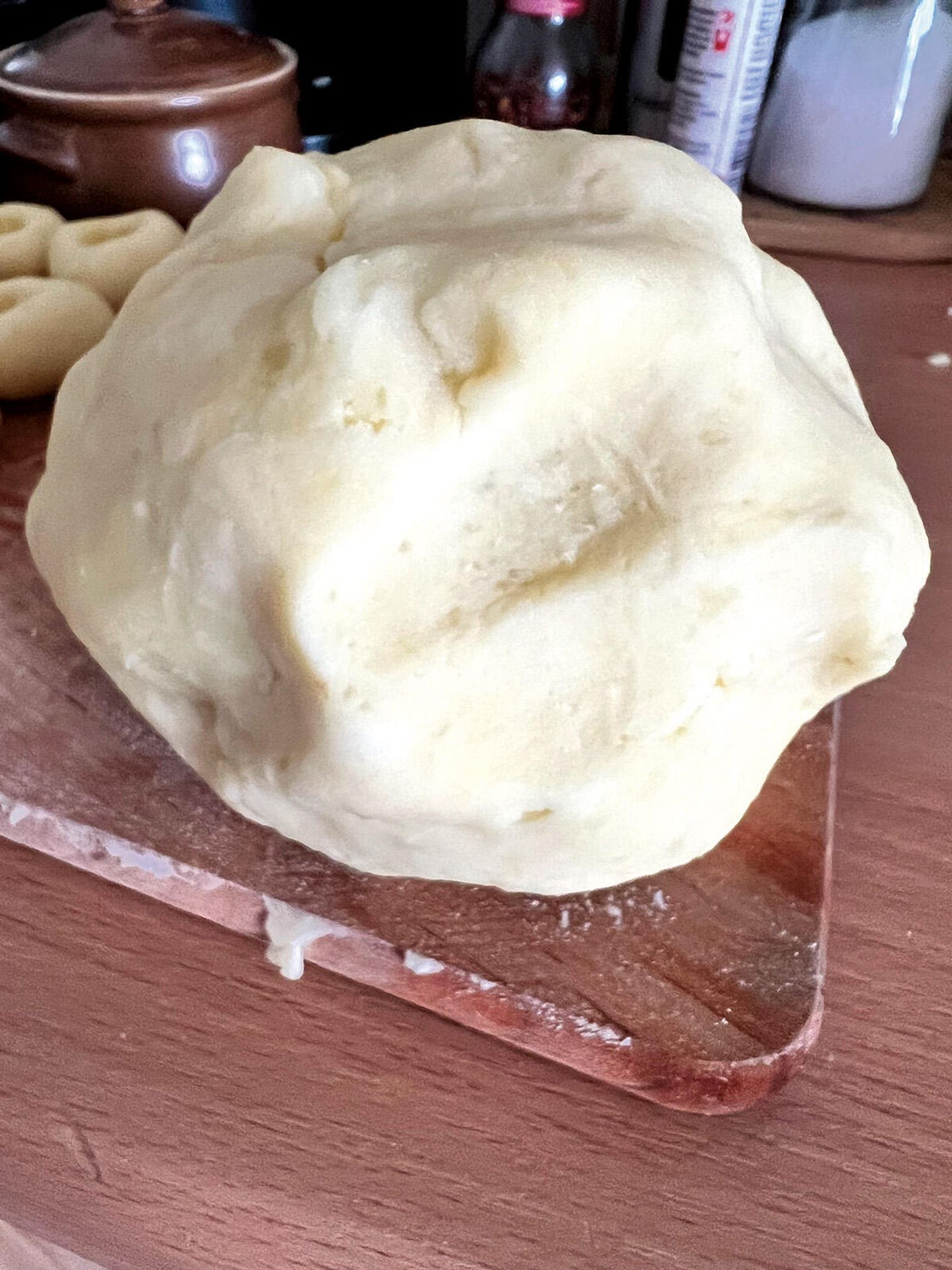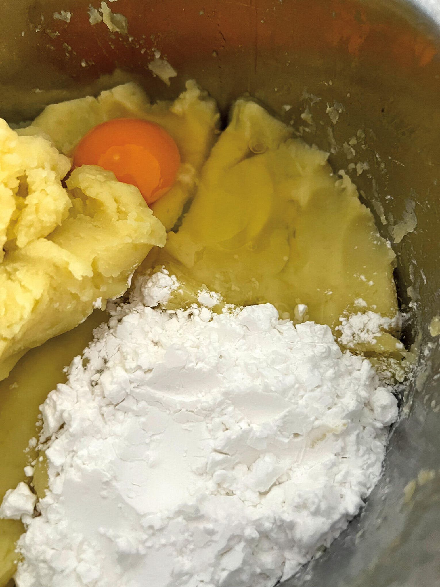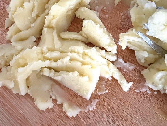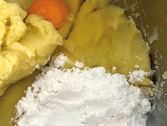 Oto tak zwana metoda „na ćwiartkę”, czyli śląska klasyka. Ugotuj ziemniaki w osolonej wodzie i dobrze odparuj. Przeciśnij przez praskę albo dokładnie utłucz – masa ma być gładka. Wyrównaj ziemniaki w misce i podziel wizualnie na 4 części.