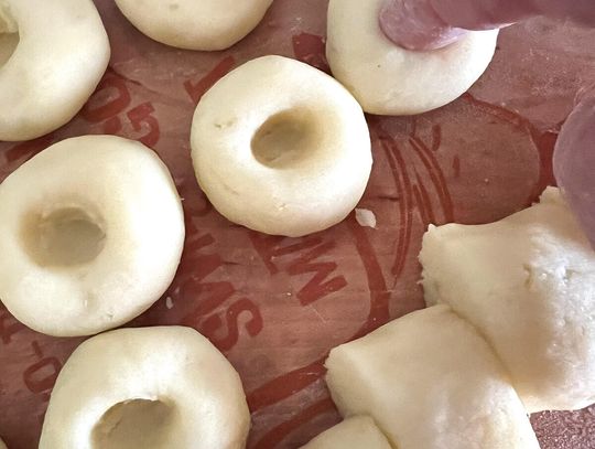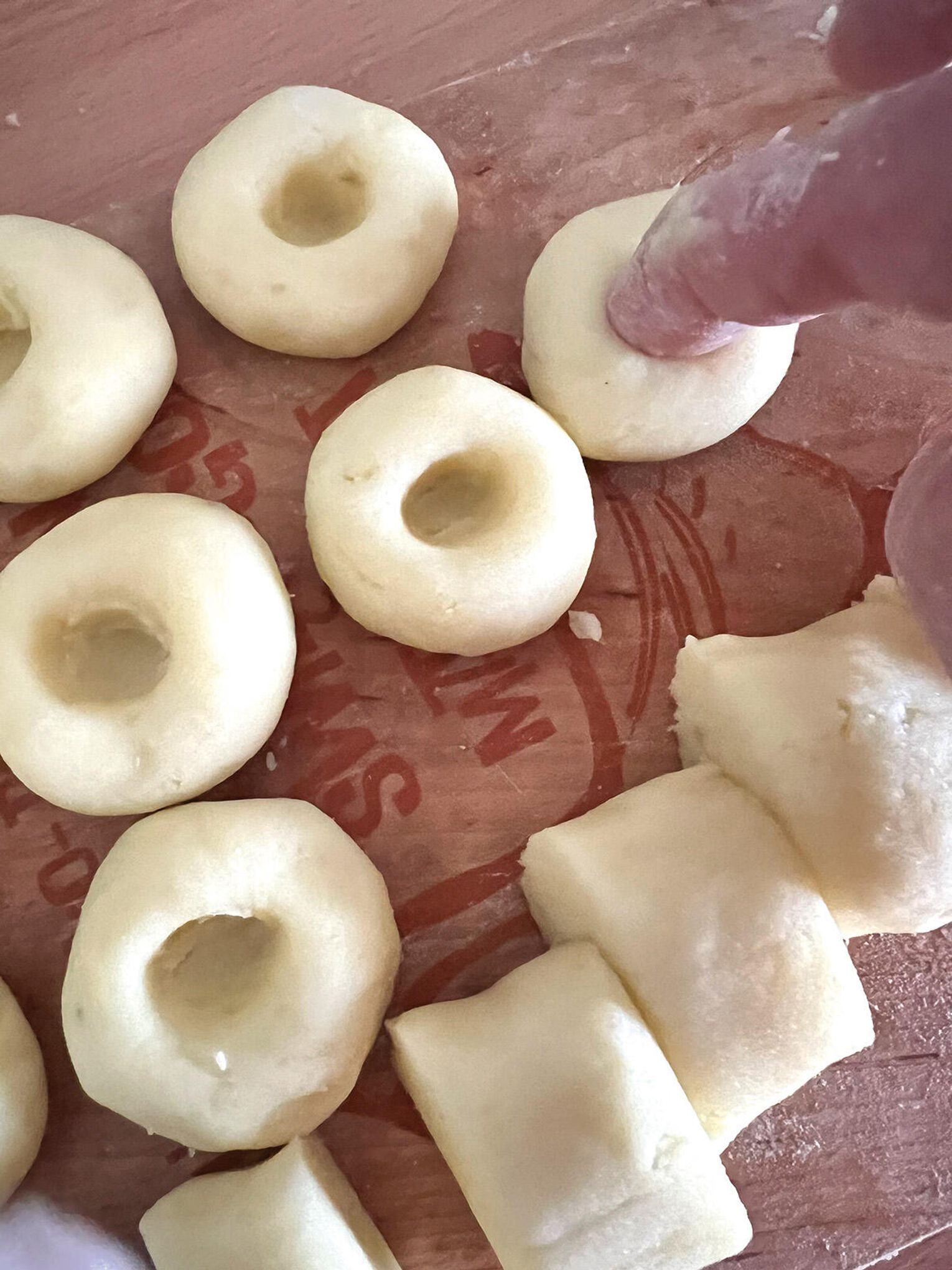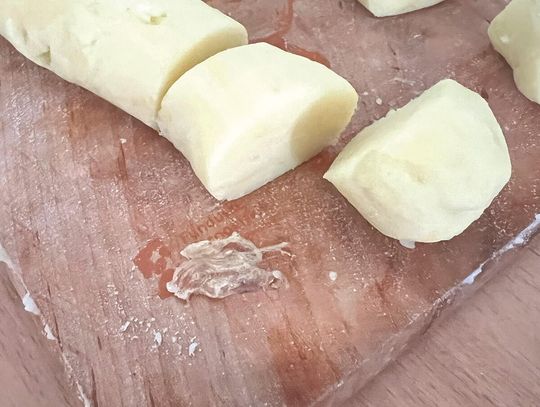 Odkrajaj kawałki wielkości orzecha włoskiego i roluj kulki. Palcem wskazującym zrób charakterystyczną dziurkę (łapie sos i wygląda jak trzeba)