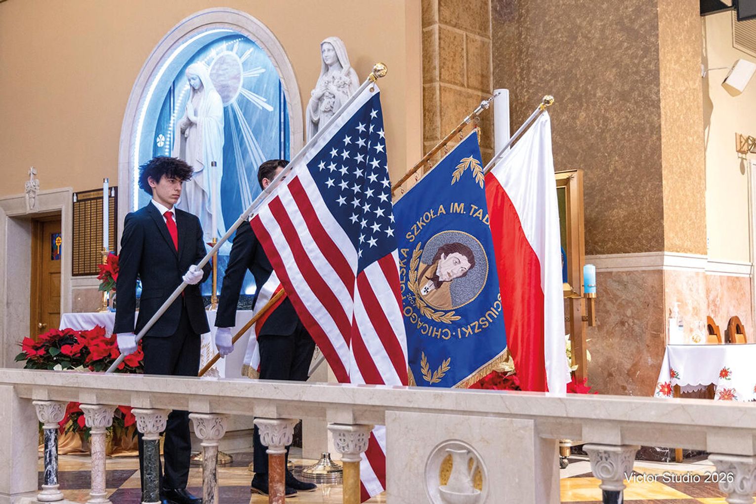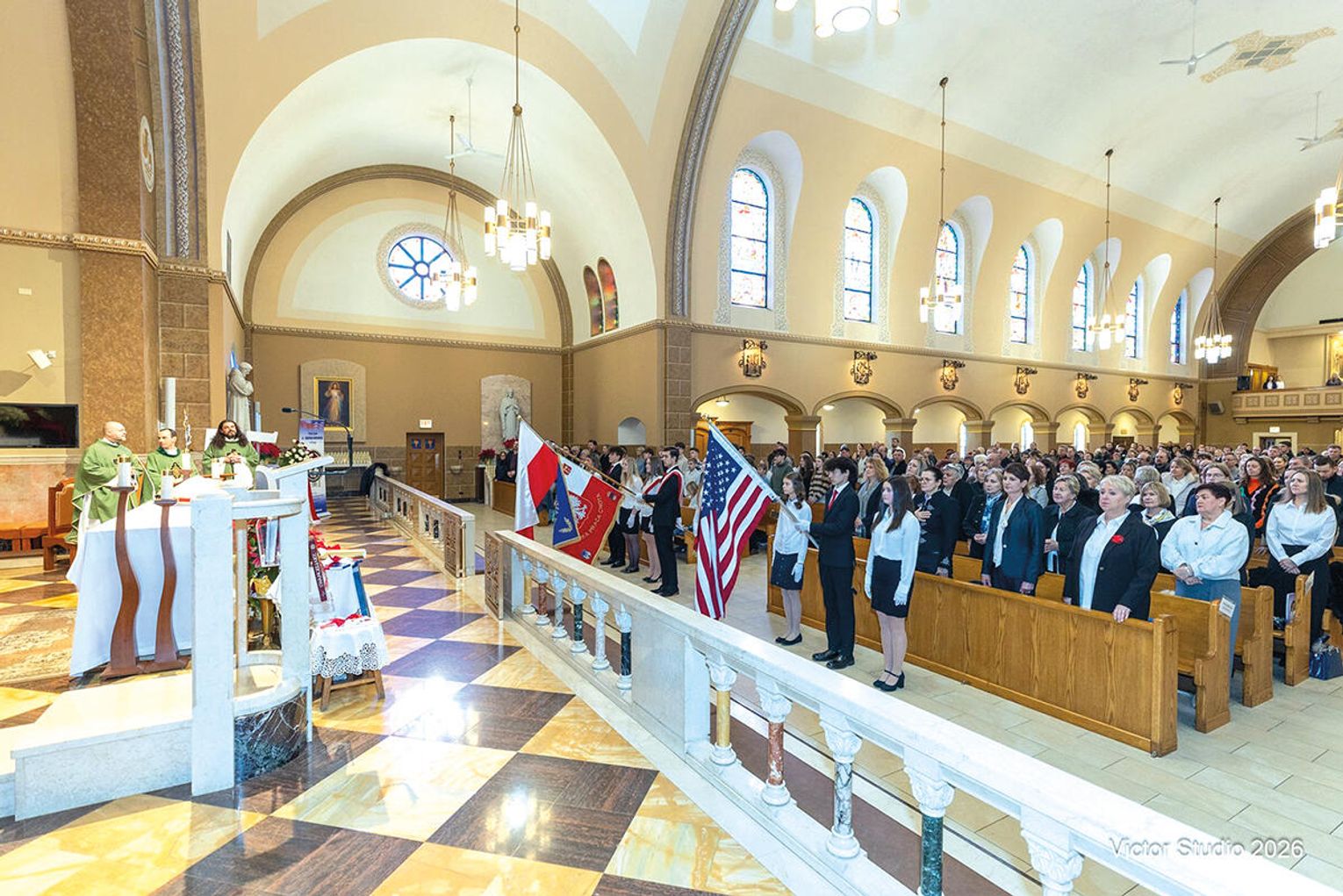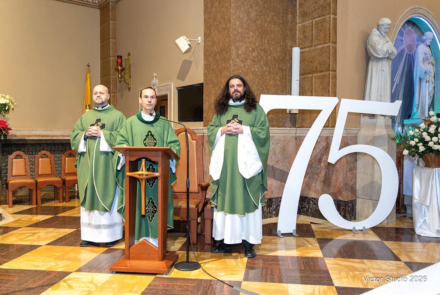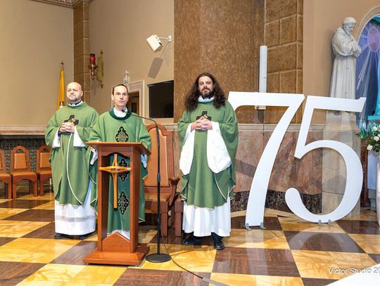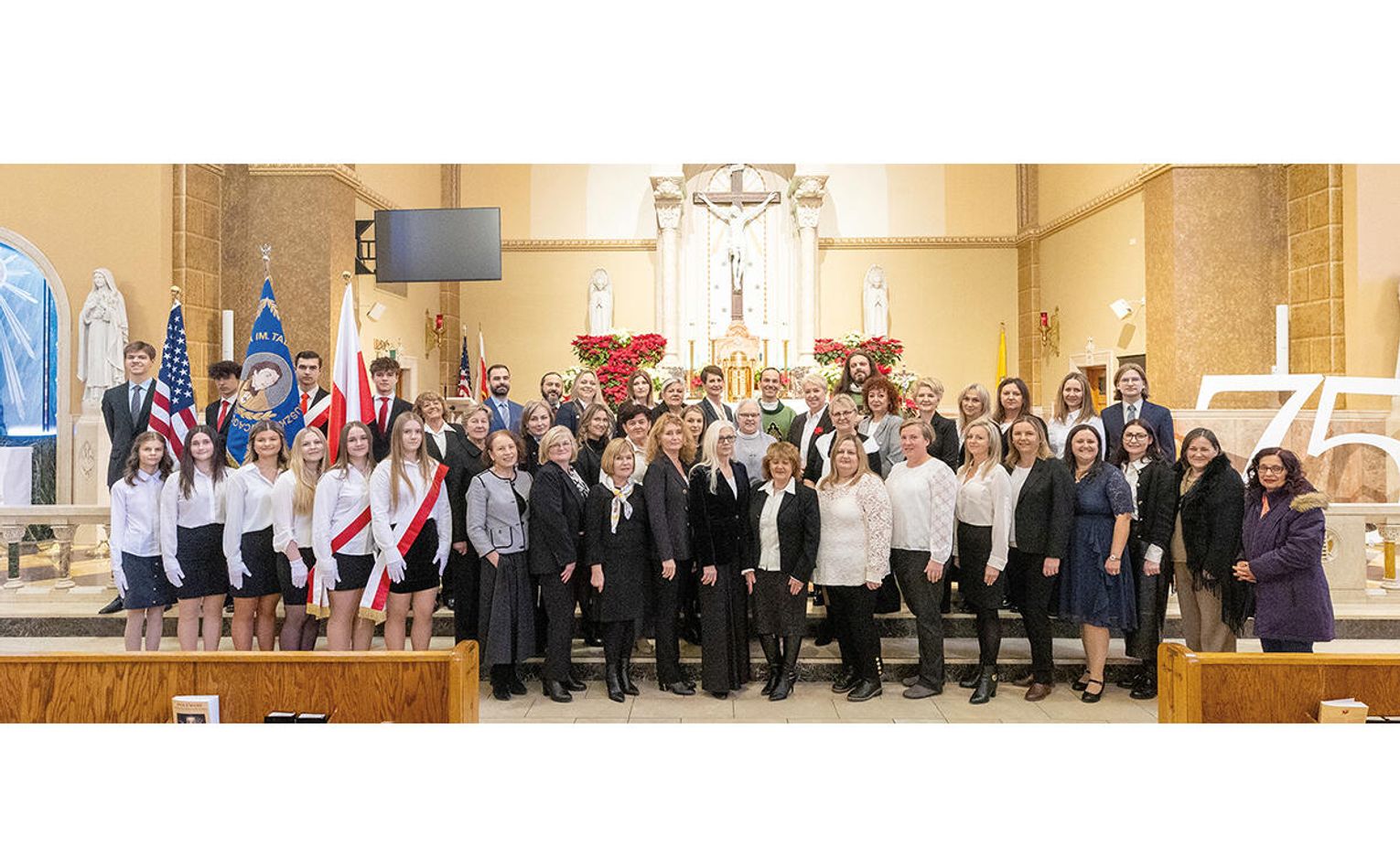 Liturgia miała wyjątkowo podniosły charakter. Już od pierwszych chwil czuć było, że jest to wydarzenie szczególne – nie tylko rocznica, lecz świadectwo żywej historii Polonii. Piękna dekoracja w postaci ogromnych rozmiarów 75, banerów, sztandaru szkoły, flag narodowych i przepięknych biało-czerwonych kwiatów, za które pięknie dziękujemy Siostrze Hiacyncie, dała atmosferę wyjątkowości i uroczystego charakteru mszy.