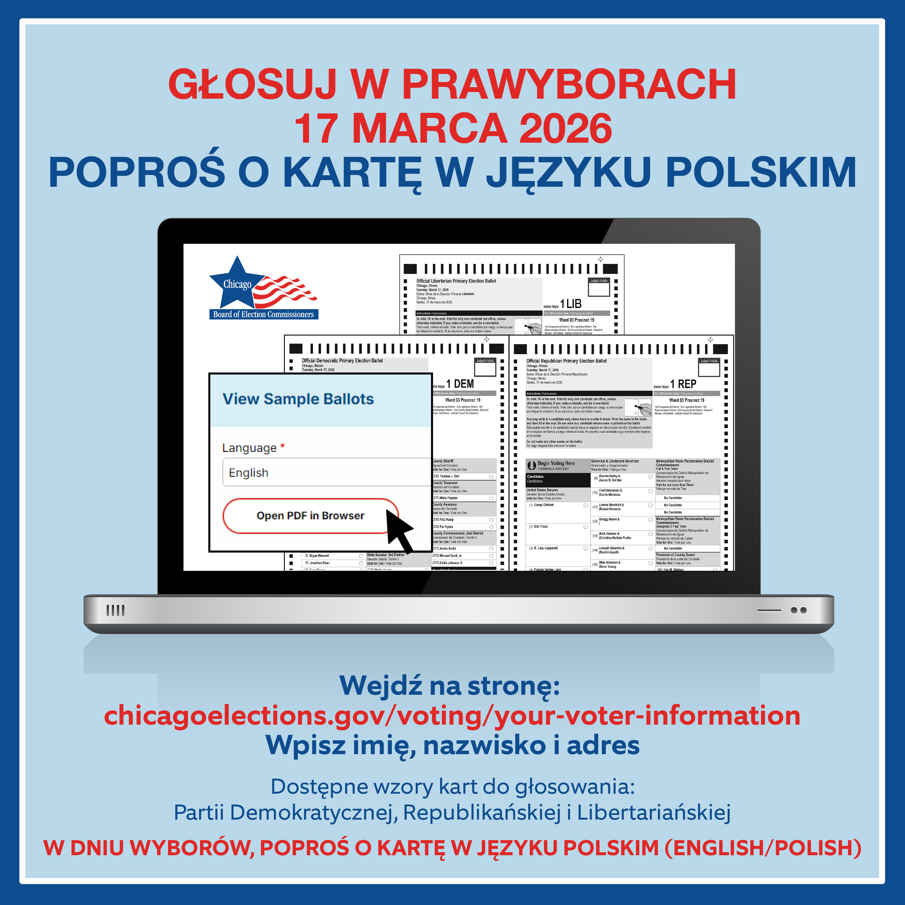 Wyborcy mogą znaleźć informacje o przydzielonym im lokalu wyborczym, wzory kart do głosowania oraz inne informacje na stronie TWOJE INFORMACJE WYBORCZE pod adresem chicagoelections.gov, dostępne też w języku polskim: https://chicagoelections.gov/voting/your-voter-information