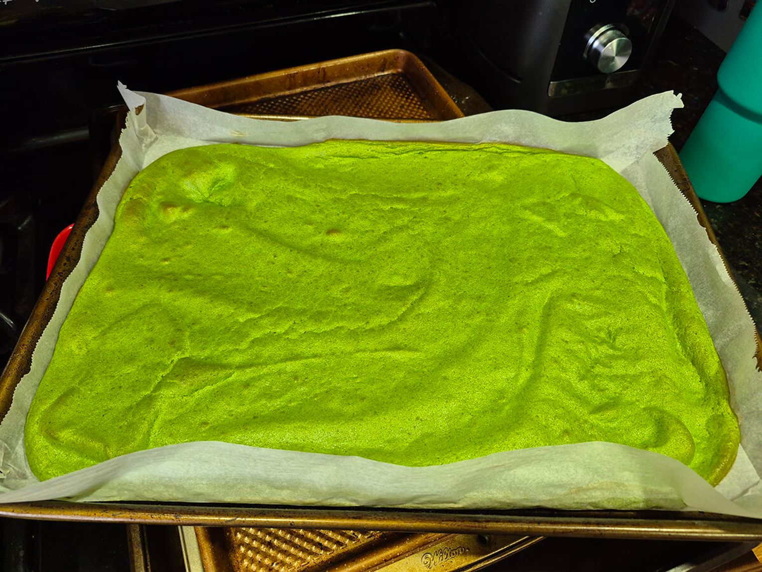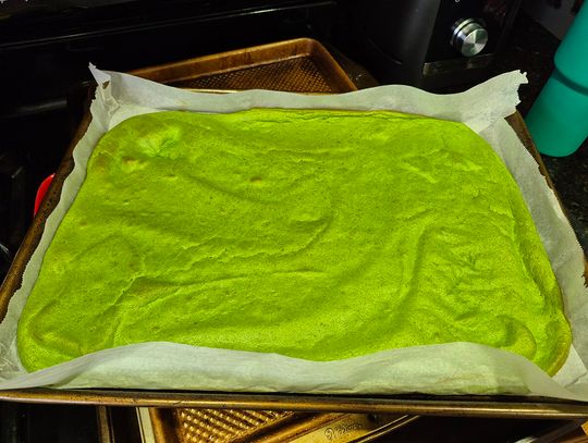 Wyłóż cienko masę na blaszkę z papierem do pieczenia. Piecz w 350°F/175°C przez około 18-20 minut. Po upieczeniu przełóż na ściereczkę, zdejmij papier i zwiń w roladę. Odstaw do ostygnięcia.