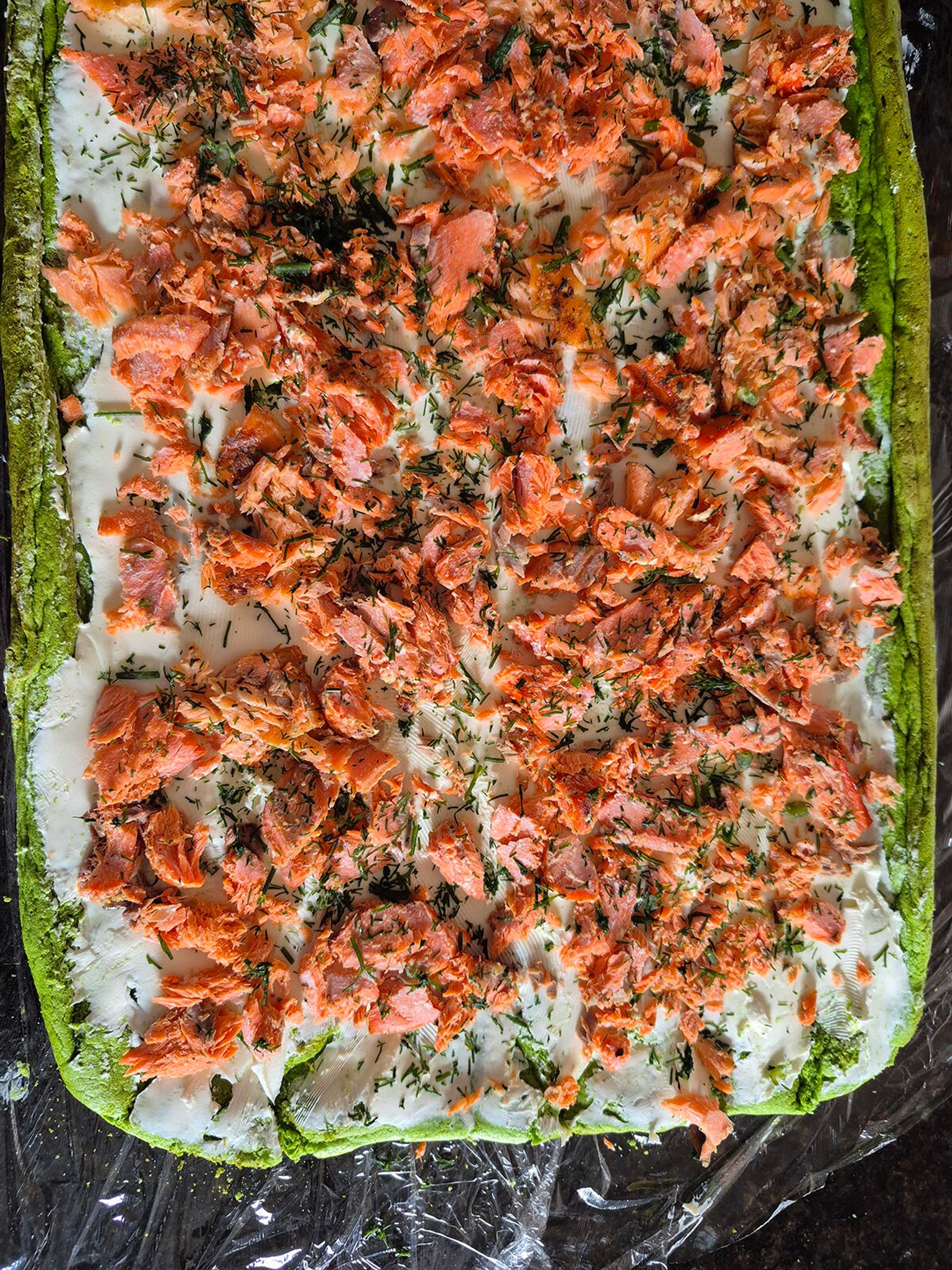 Wymieszaj serek, śmietanę, sok z cytryny, koperek oraz przyprawy. Rozwiń roladę. Posmaruj kremem serkowym. Ułóż plastry łososia. Zwiń ponownie ciasno. Wstaw do lodówki na minimum 1-2 godziny (najlepiej na noc).