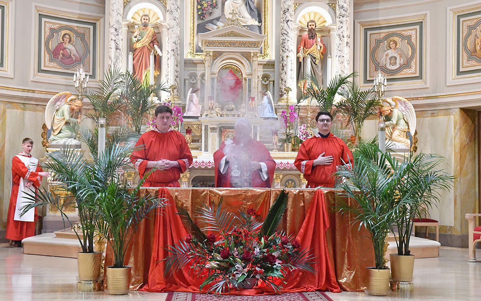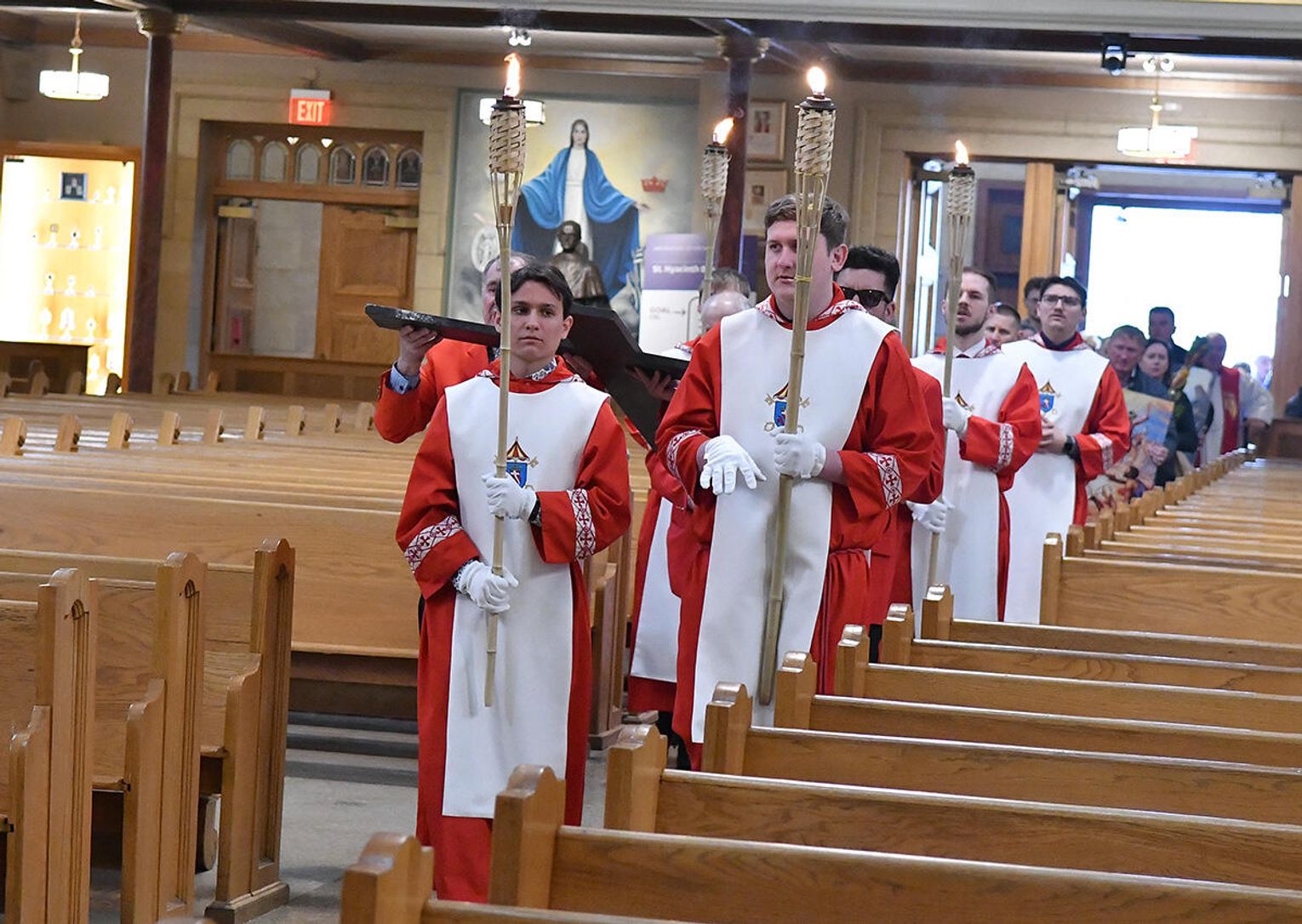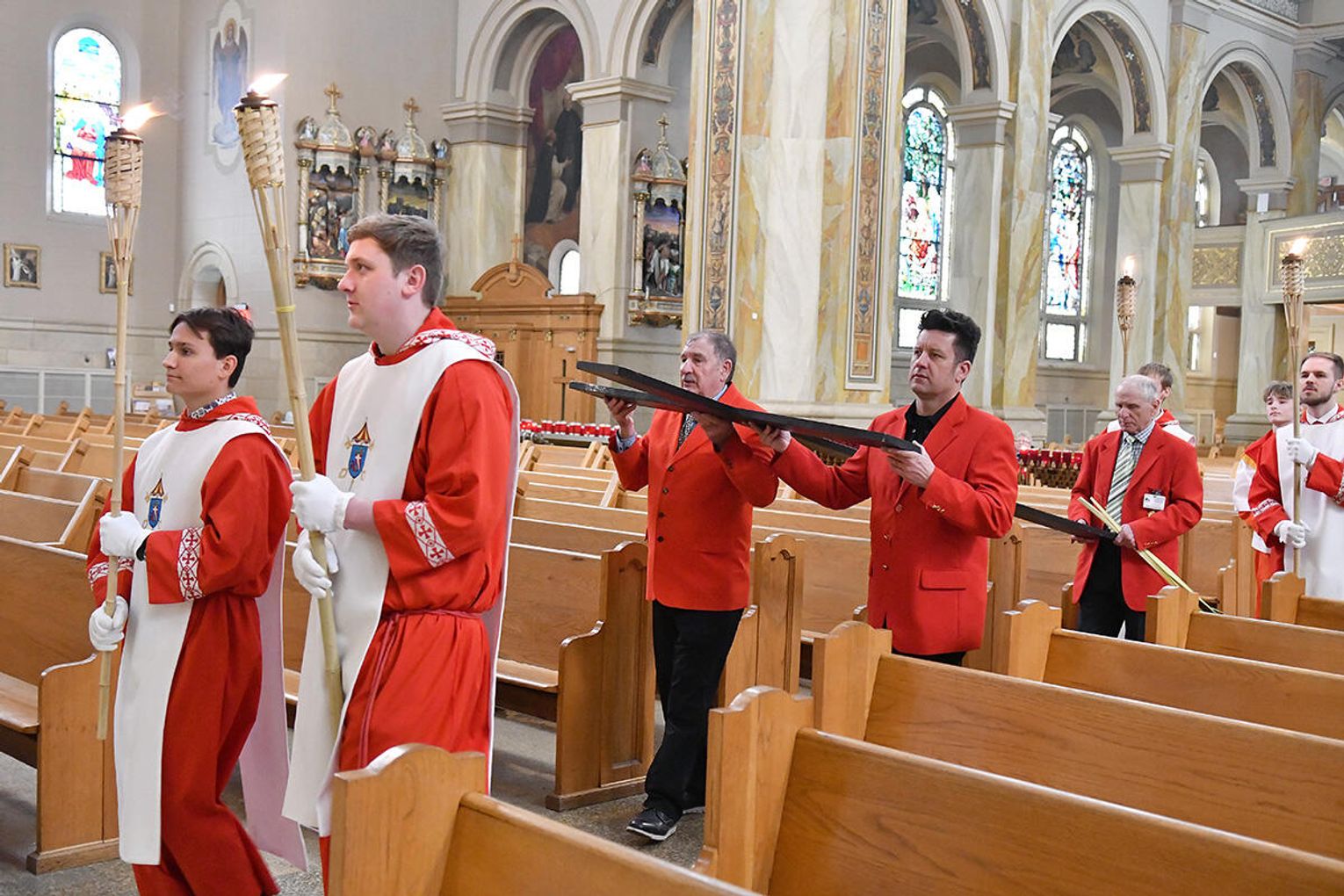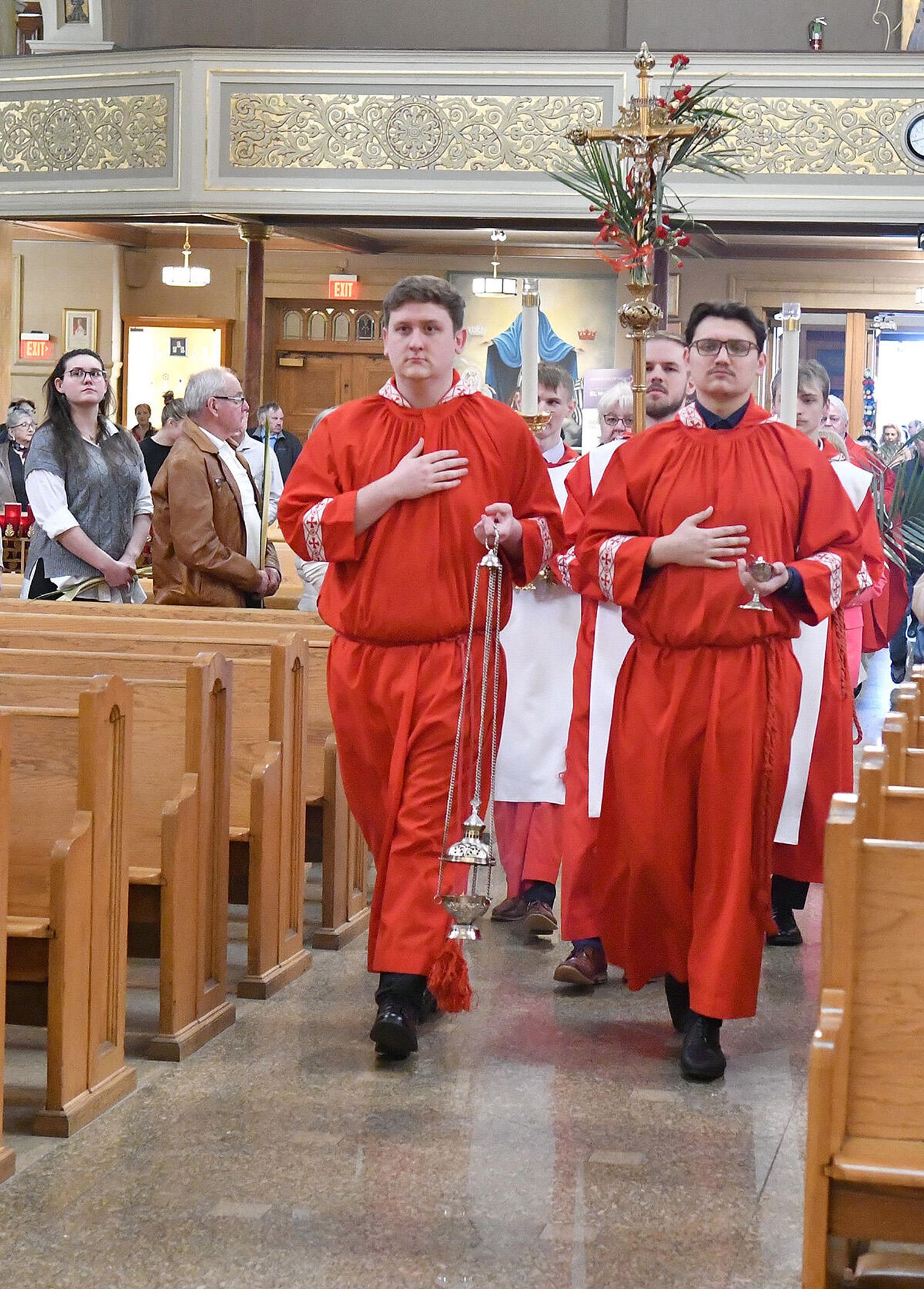 Nabożeństwo wielkopostne rozpoczęło się 29 marca poświęceniem palm przy pomniku św. Jana Pawła II i mszą świętą. Eucharystię odprawił ksiądz Antoni Dziorek, CR. Homilię wygłosił ksiądz Stanisław Jankowski CR – proboszcz parafii. Historię Męki Pańskiej z podziałem na role odśpiewali zmartwychwstaniec ksiądz Jacek Praski i organista Piotr Mrugała.