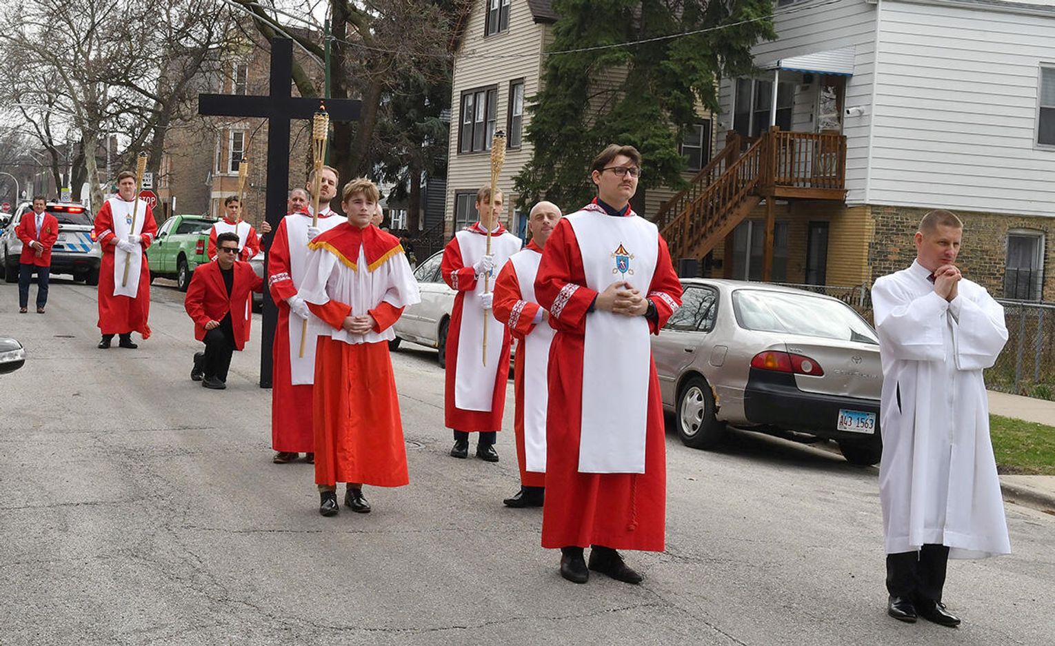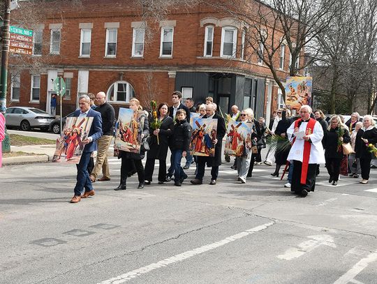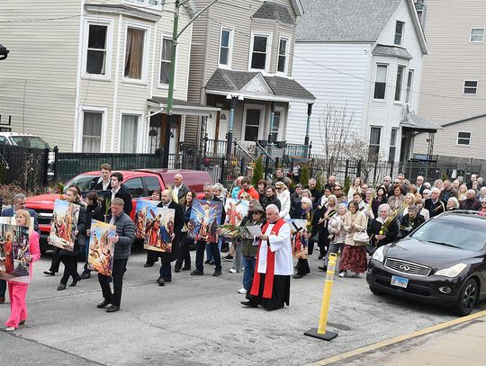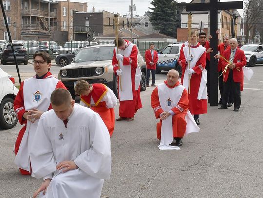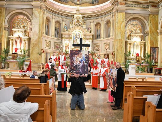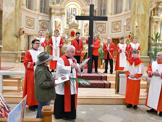 Kiedy Krzyż został wyniesiony przed świątynię, ulice wokół kościoła, na co dzień tętniące życiem zamieniły się w przestrzeń modlitwy. Procesja ruszyła powoli, zatrzymując się przy kolejnych, namalowanych na olbrzymich planszach, stacjach Drogi Krzyżowej, które w rękach trzymali parafianie. Przy każdej stacji odczytano rozważania, którym towarzyszyła chwila głębokiej refleksji. Ksiądz proboszcz Stanisław Jankowski prowadził rozważania w języku polskim, a po nim parafianka Diana Berdecia w języku angielskim.