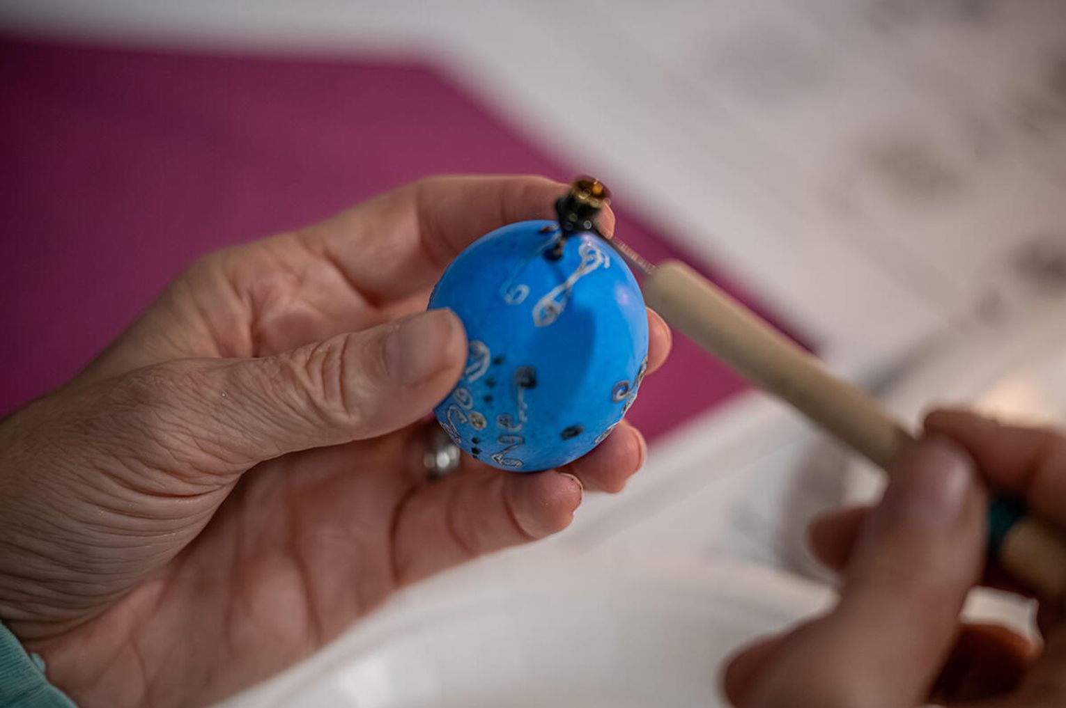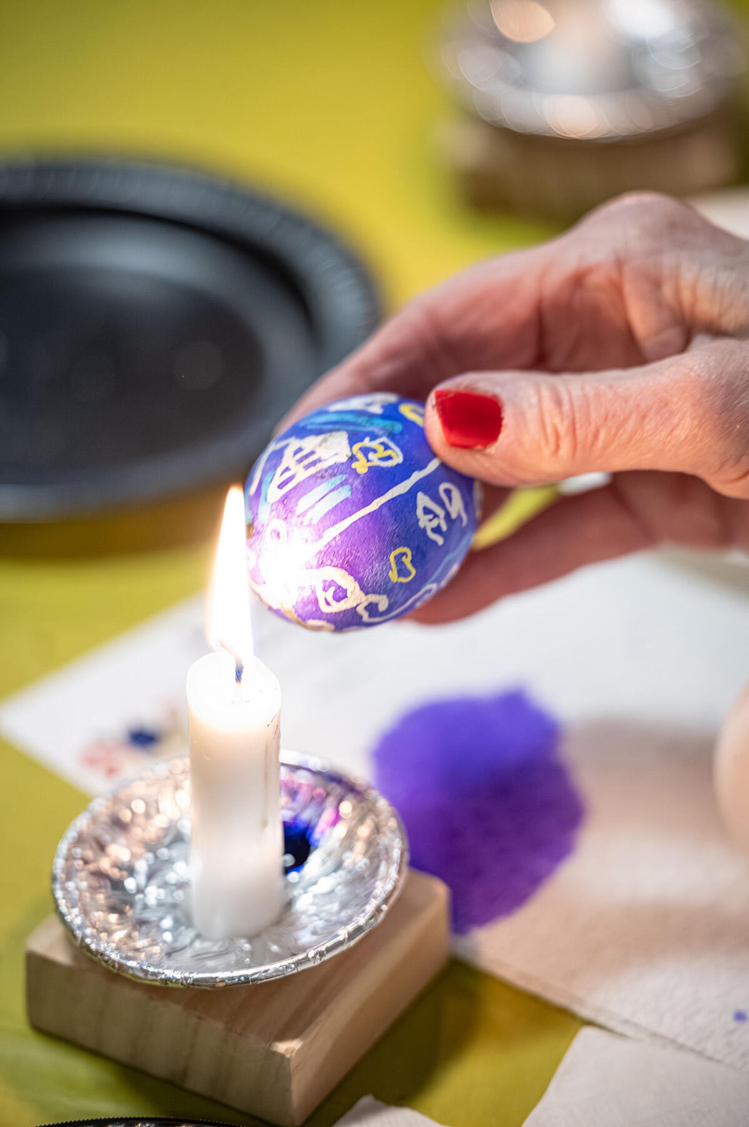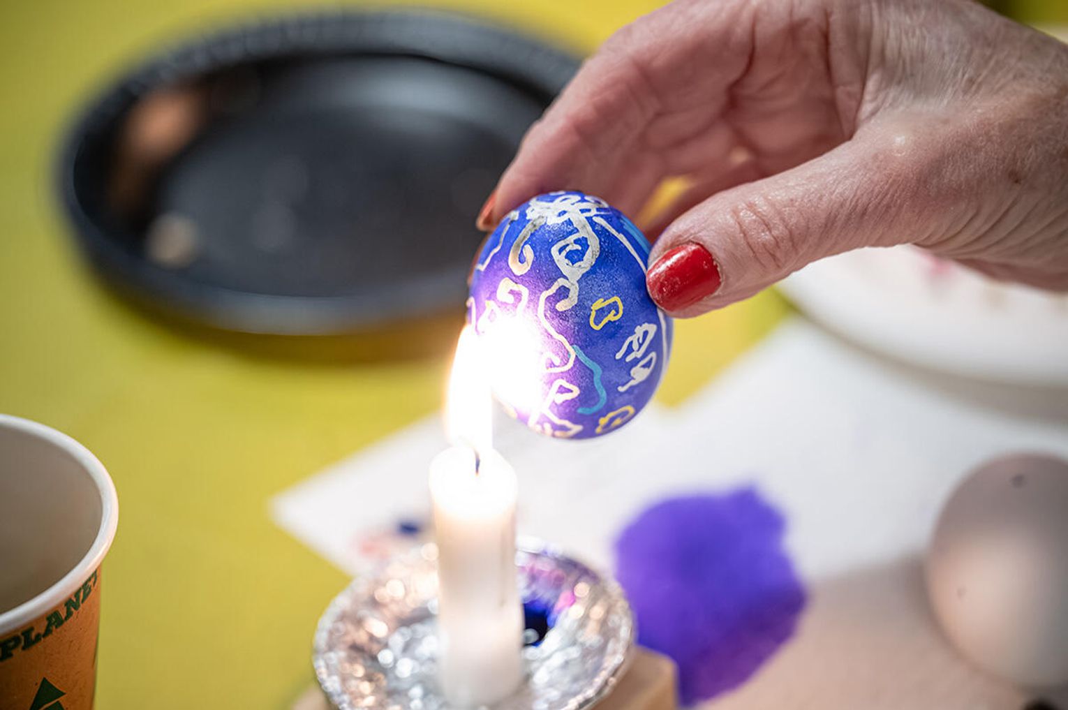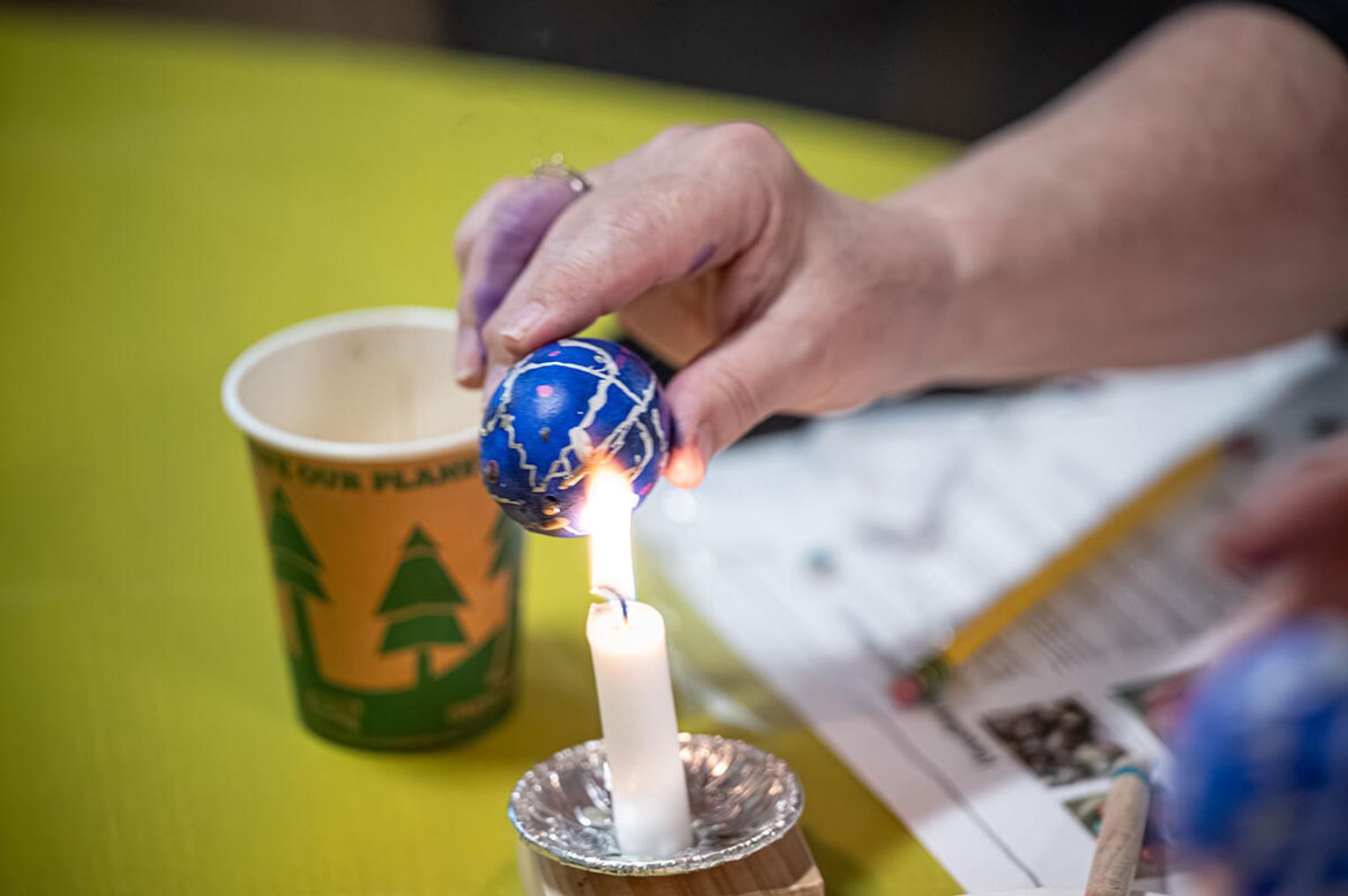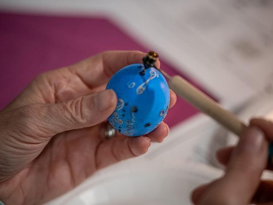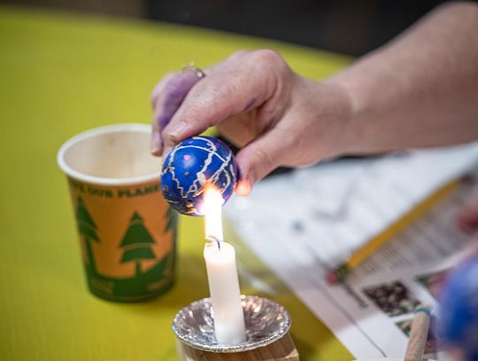 Uczestnicy warsztatów preferują jajka kurze. I każdy, kto spróbował kiedyś nakładania wosku kistką wie, jakiej wymaga to precyzji, cierpliwości i czasu. Podczas warsztatów wśród stolików krąży Christine i na bieżąco służy pomocą i radą. A efekt końcowy jest wart włożonego wysiłku! Gotowe pisanki tradycyjnie trafią do wielkanocnych koszyków ze święconką w Wielka Sobotę.