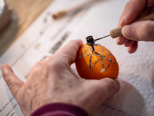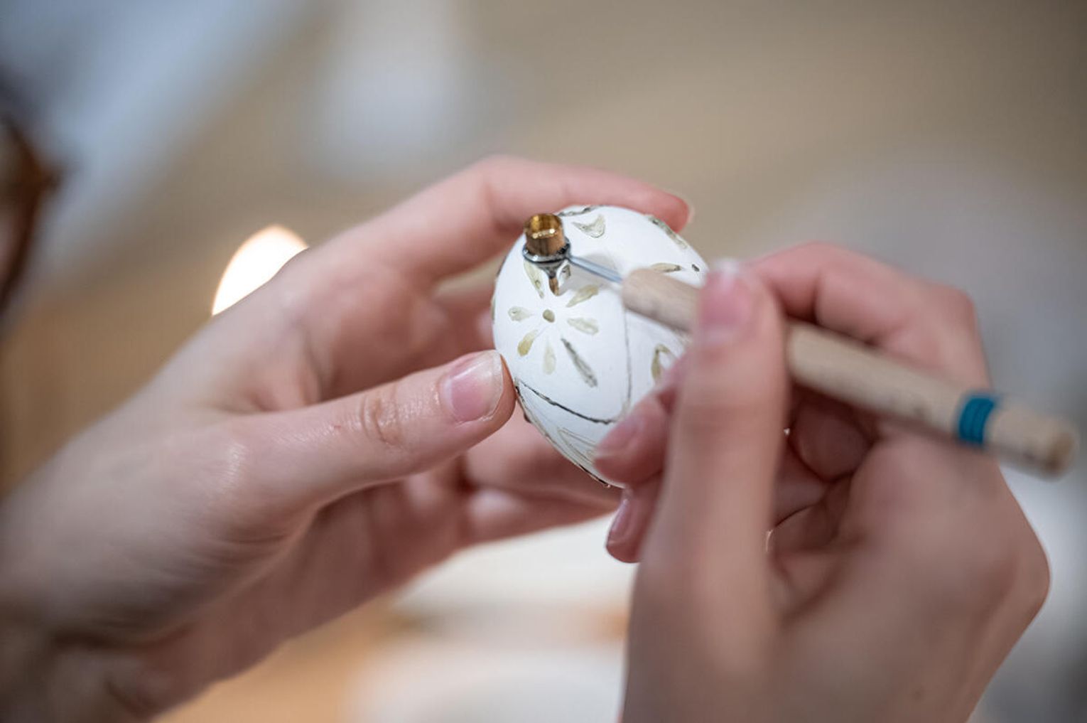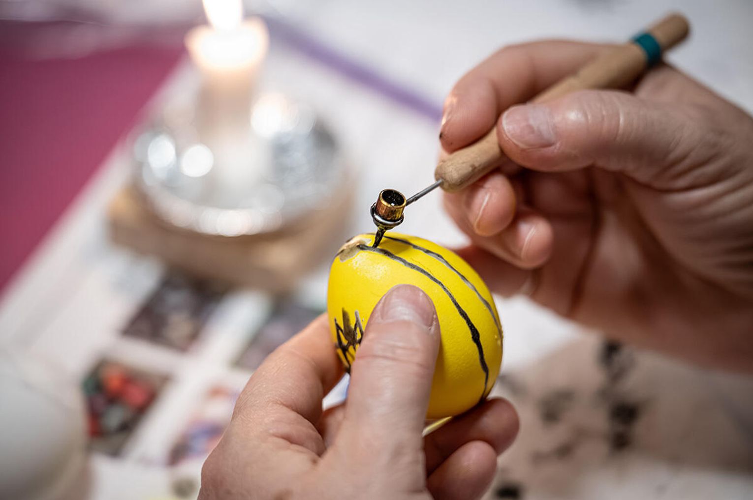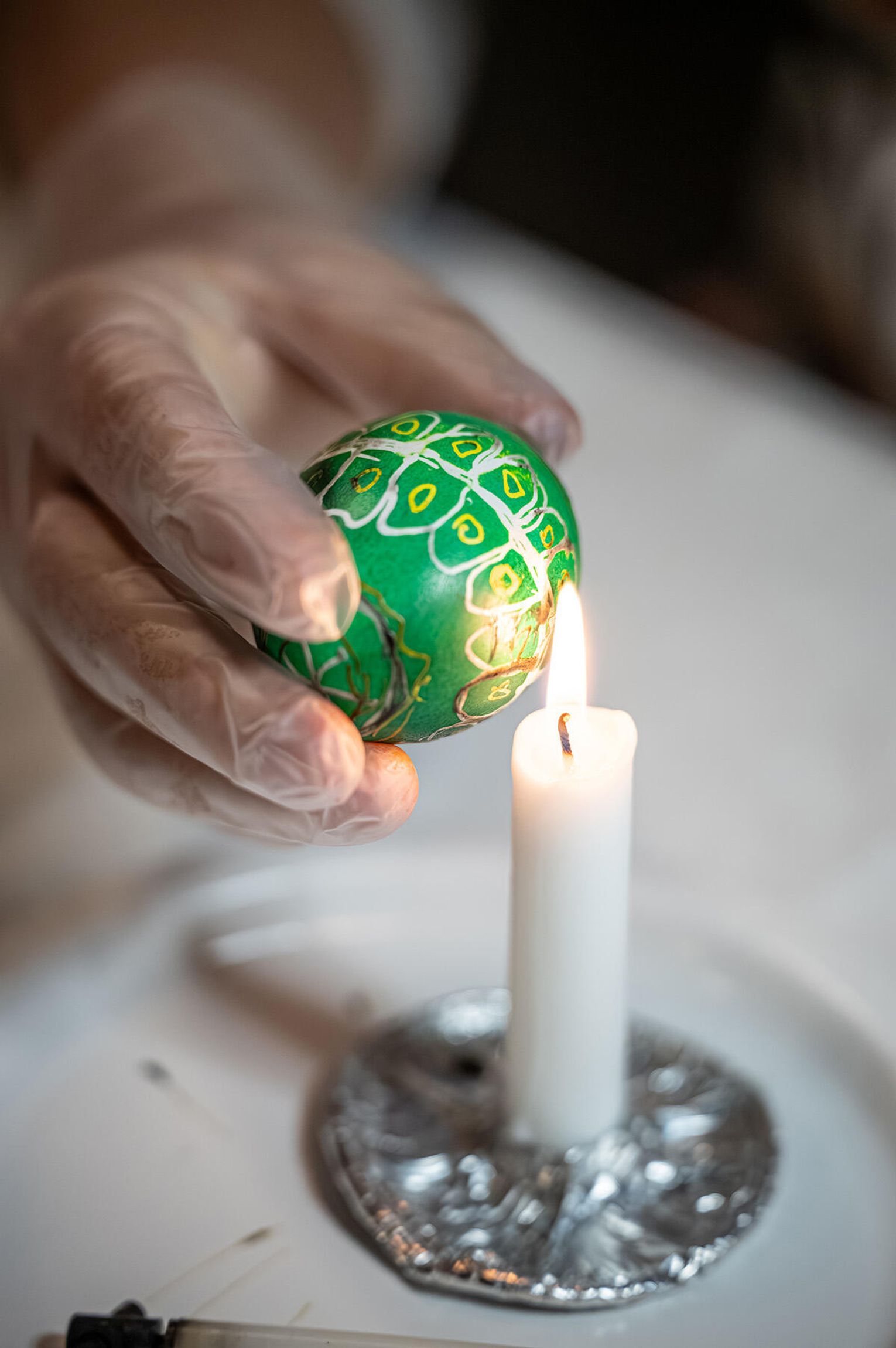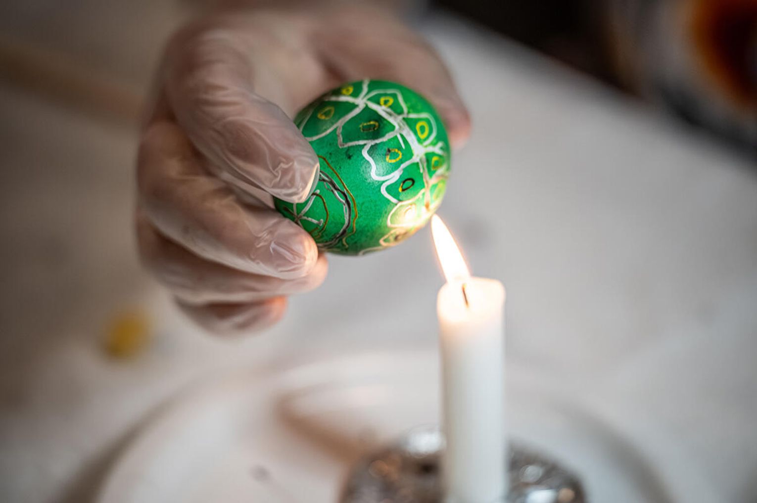 Uczestnicy warsztatów preferują jajka kurze. I każdy, kto spróbował kiedyś nakładania wosku kistką wie, jakiej wymaga to precyzji, cierpliwości i czasu. Podczas warsztatów wśród stolików krąży Christine i na bieżąco służy pomocą i radą. A efekt końcowy jest wart włożonego wysiłku! Gotowe pisanki tradycyjnie trafią do wielkanocnych koszyków ze święconką w Wielka Sobotę.