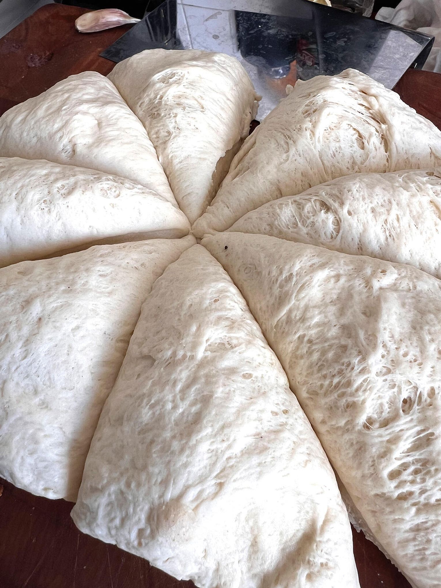 Podziel ciasto na 8 równych części i uformuj bułeczki, ułóż na blaszce wyłożonej papierem do pieczenia i zostaw jeszcze na 30 min do napuszenia.
