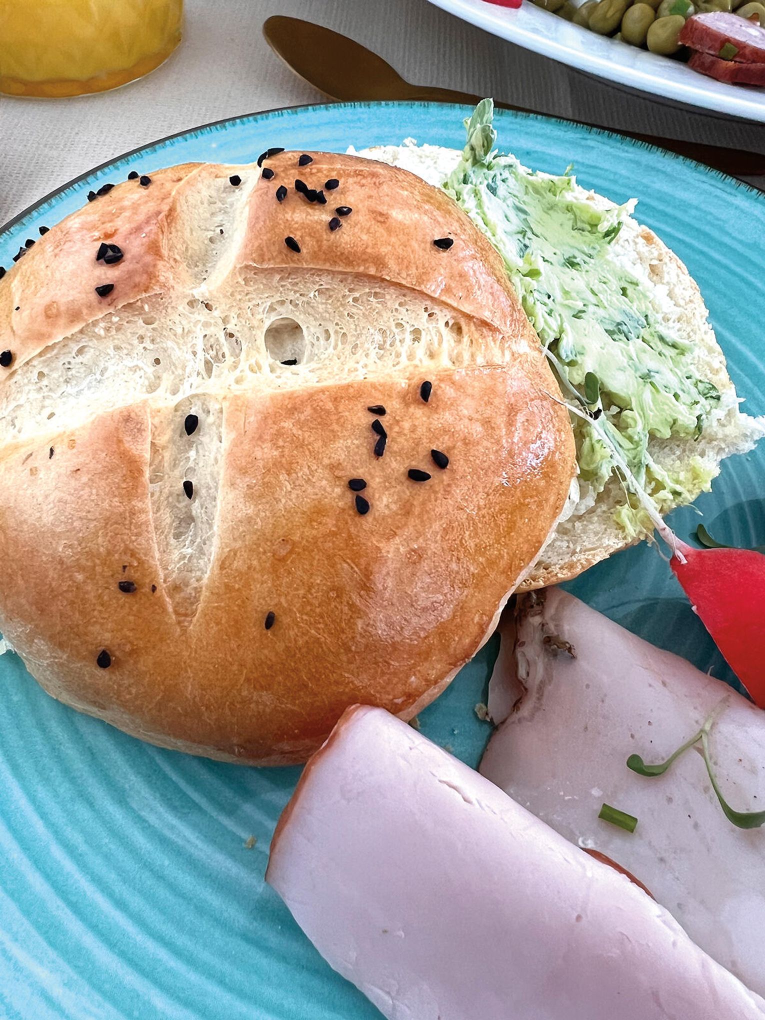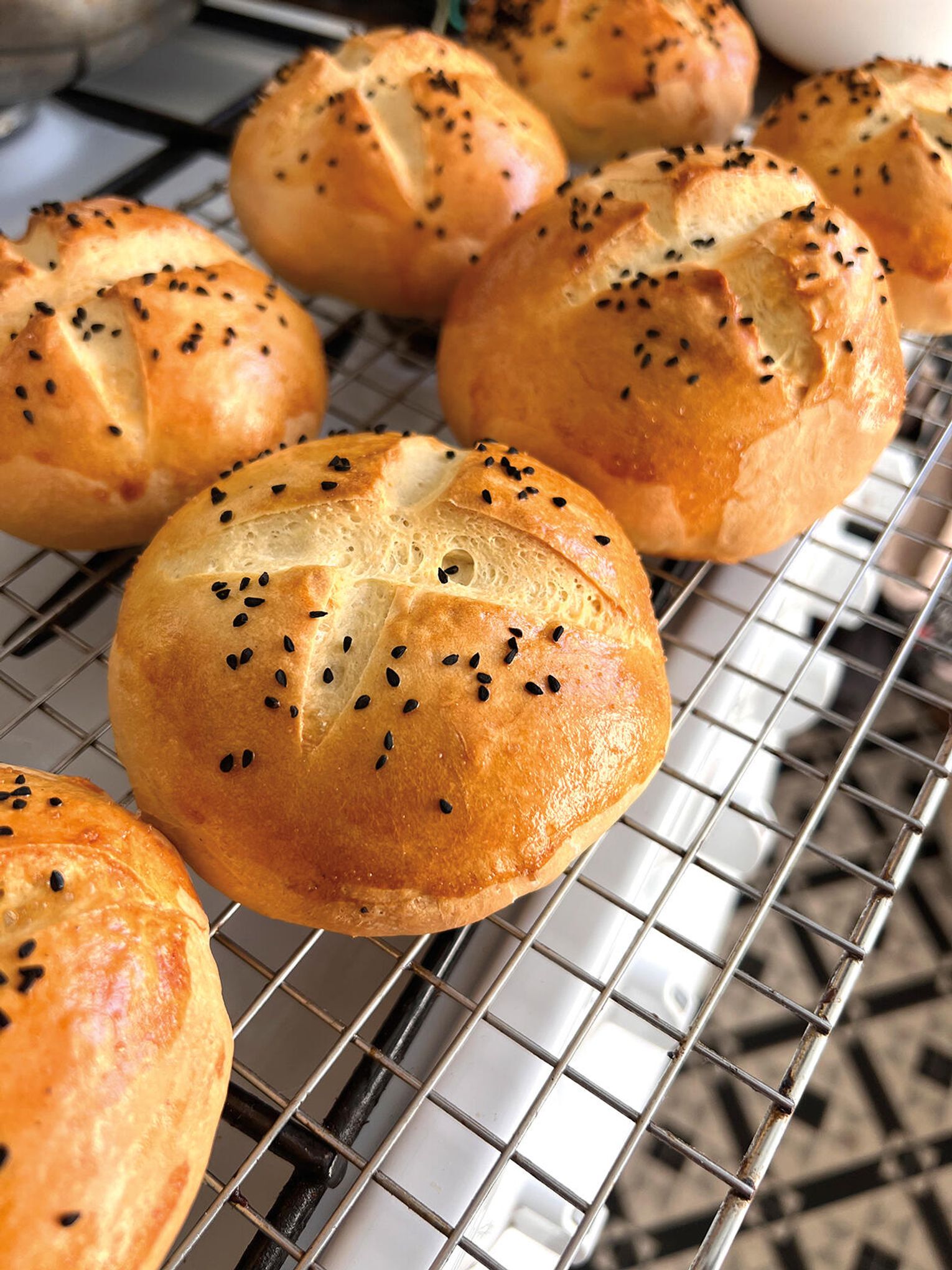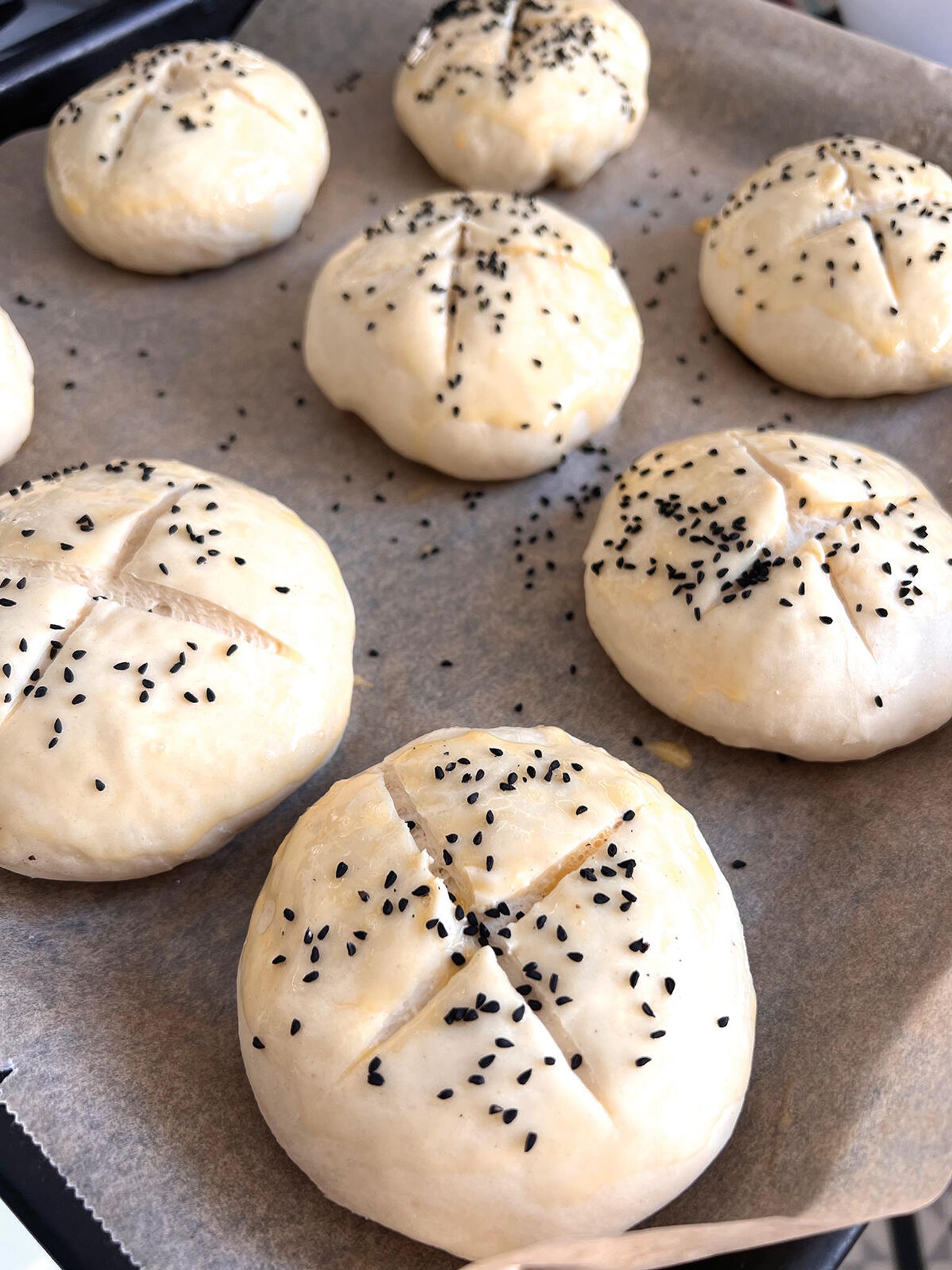 Każdą bułeczkę nakrój z wierzchu na 4, posmaruj jajkiem, posyp ulubionymi dodatkami. Piecz w 400°F/200°C przez ok. 20 minut, aż będą złociste.