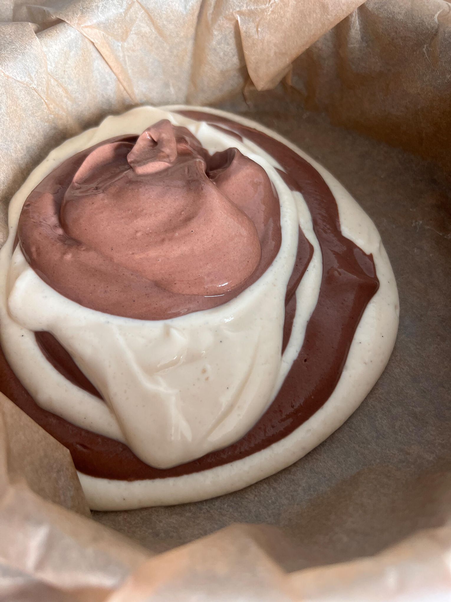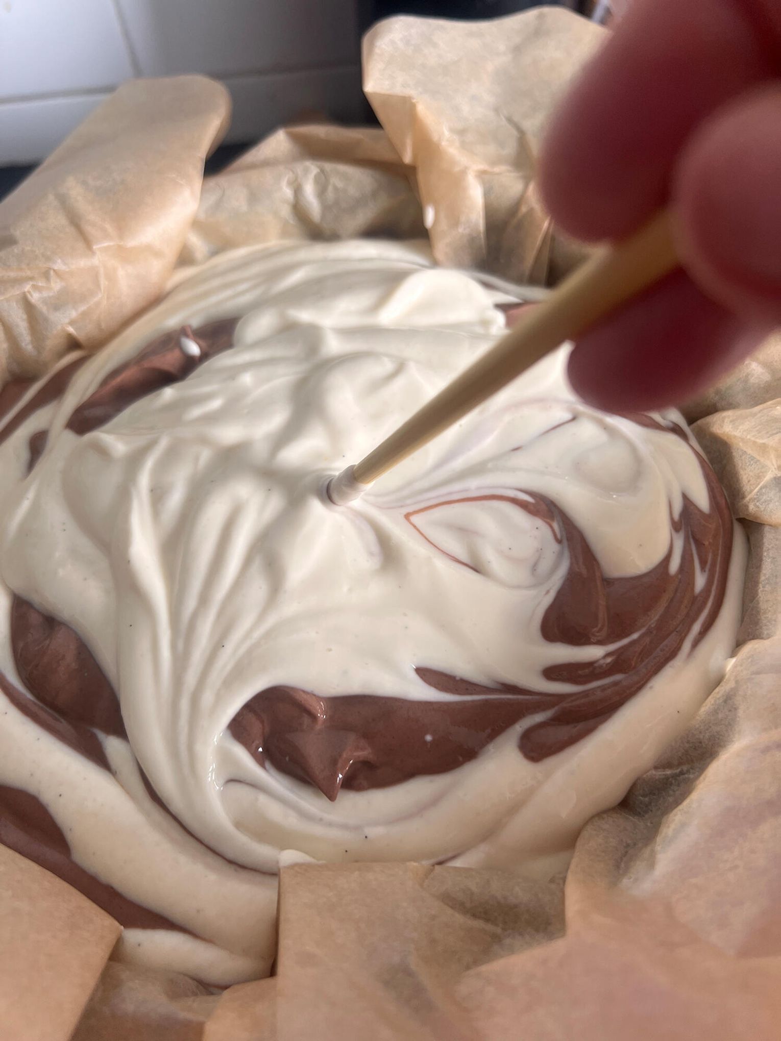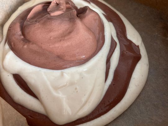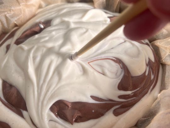 Wylewaj naprzemiennie jasną i ciemną masę, tworząc efekt zebry. Na końcu wierzch lekko wymieszaj patyczkiem.