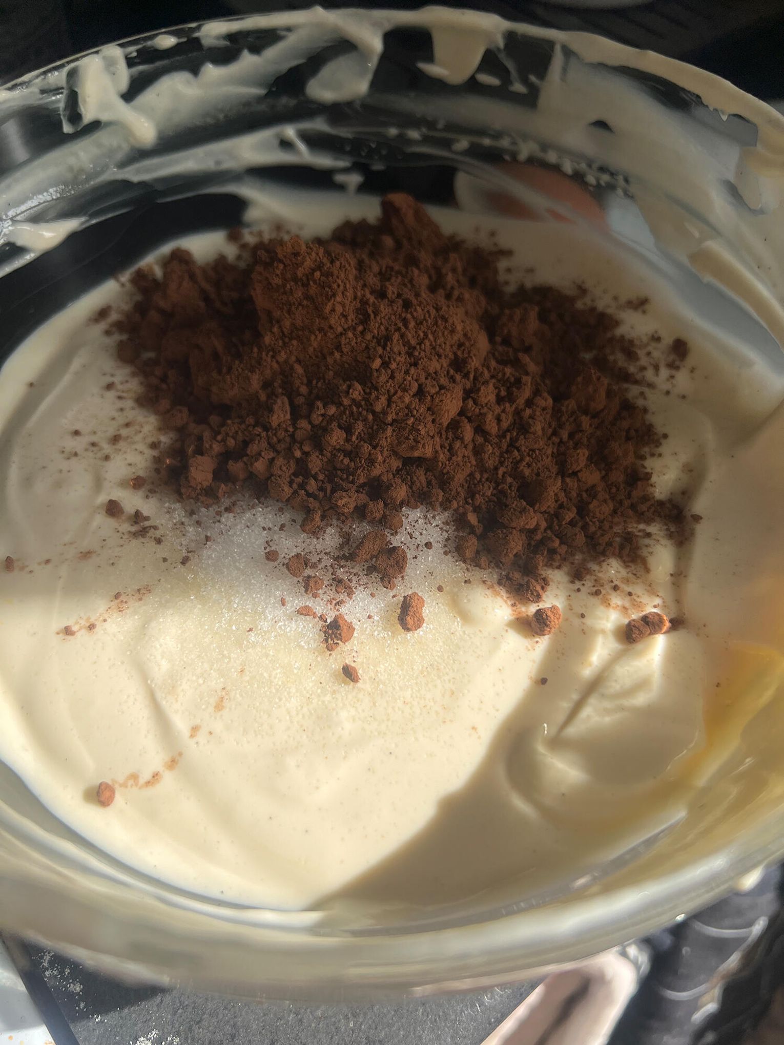 Podziel masę na dwie części – do jednej dodaj kakao i dokładnie wymieszaj.