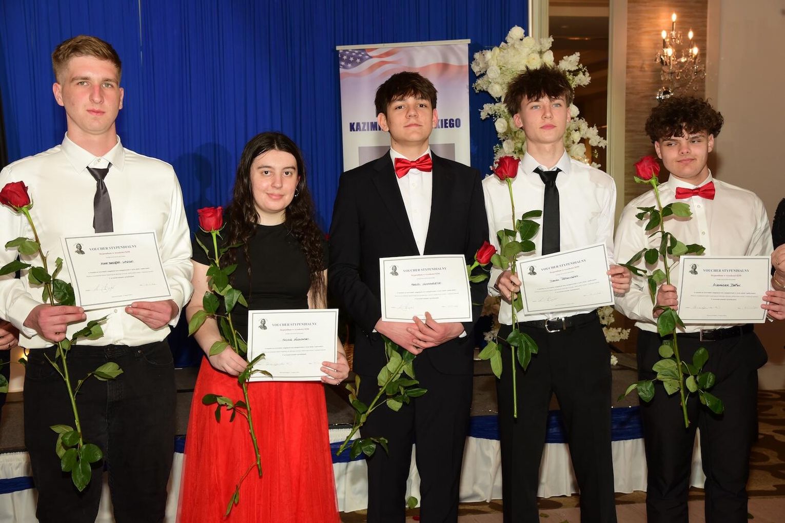 W kolejnej odsłonie na scenie pojawiły się gospodynie szkoły – prezes Agata Woźny i dyrektor Dorota Turek oraz nauczycielki i członkowie zarządu szkoły. Po wejściu na salę pocztów sztandarowych i odśpiewaniu przez Julię Topór i Jakuba Kulawiaka hymnów narodowych Polski i USA prowadzący zaprosili gości honorowych do składania życzeń i gratulacji.