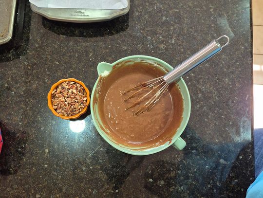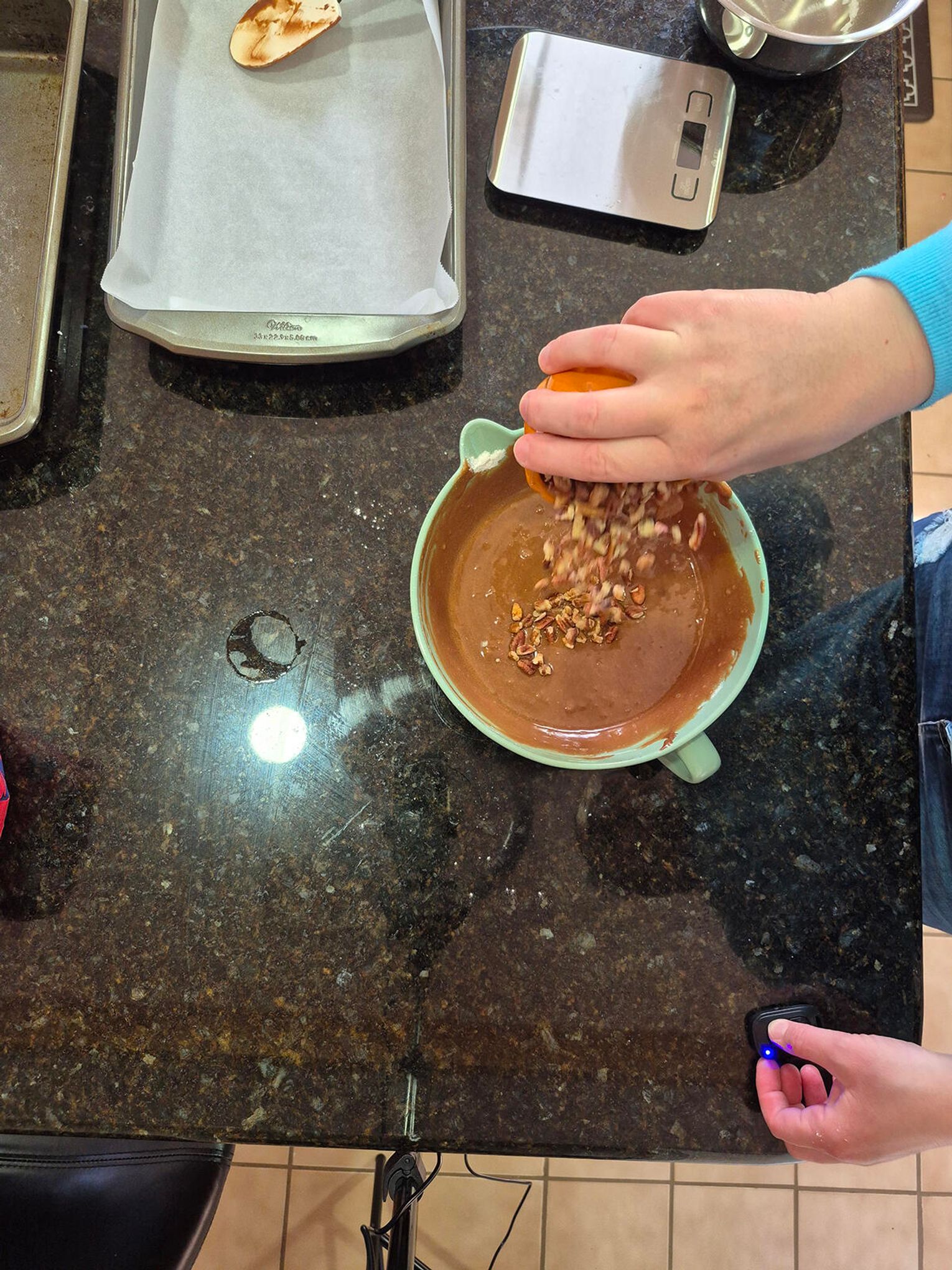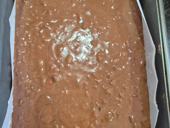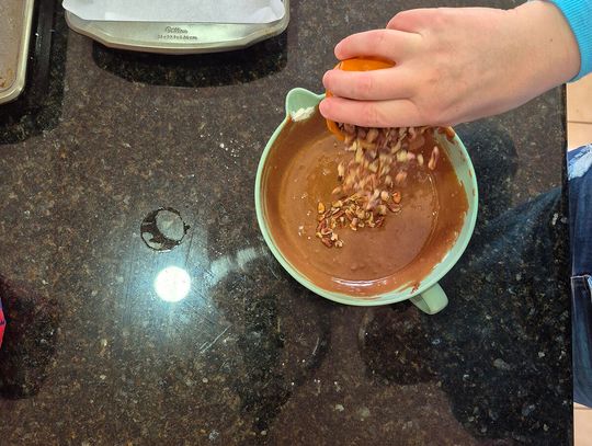 Dodaj większość orzechów do środka. Resztą posyp wierzch. Przelej masę do formy i wyrównaj.