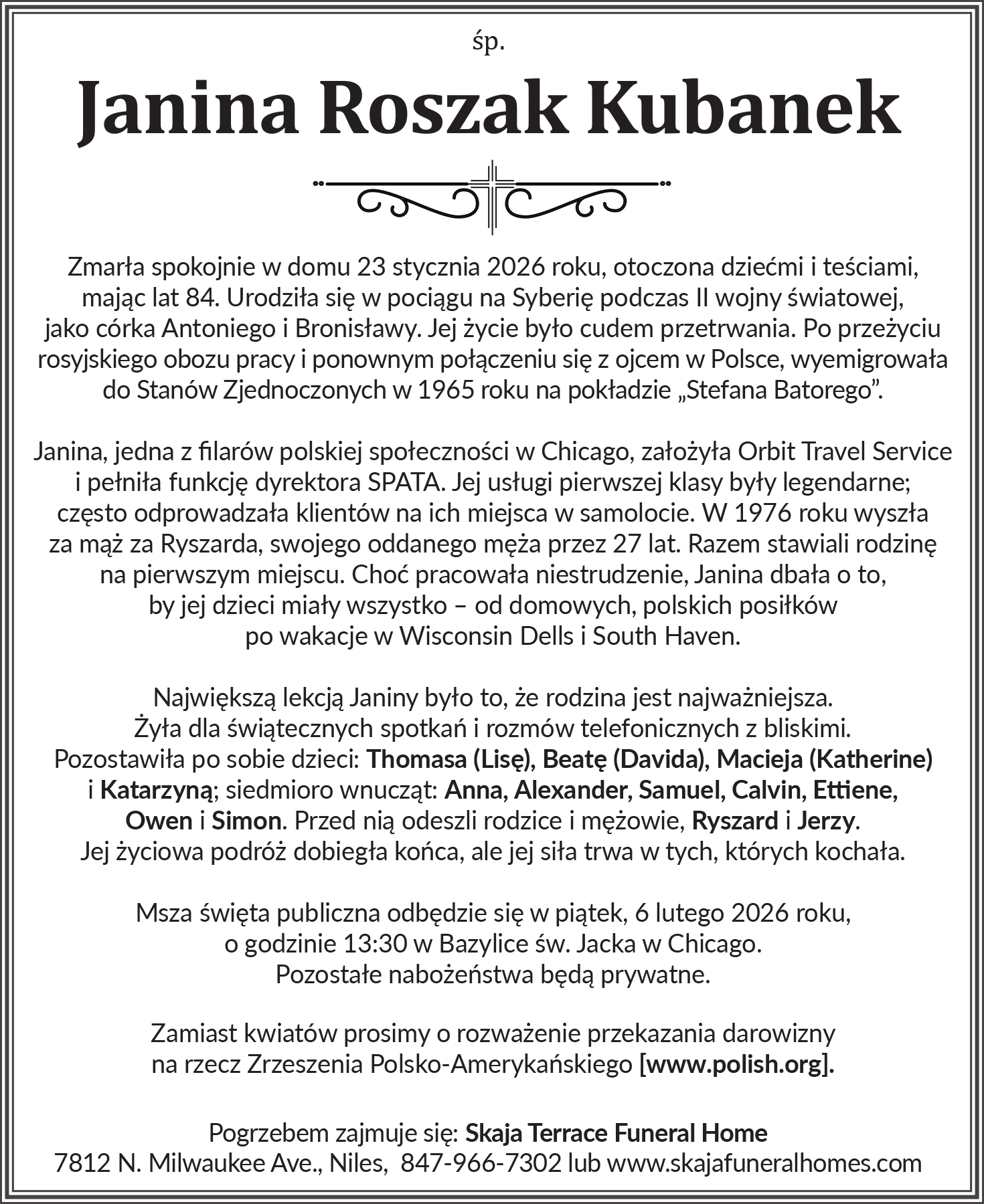 Janina Roszak Kubanek, 84, passed away peacefully at home on January 23, 2026, surrounded by her children and in-laws. Born on a train to Siberia during WWII to Antoni and Bronislawa, Janina’s life was a miracle of survival. After surviving a Russian work camp and reuniting with her father in Poland, she immigrated to the U.S. in 1965 aboard the Stefan Batory.